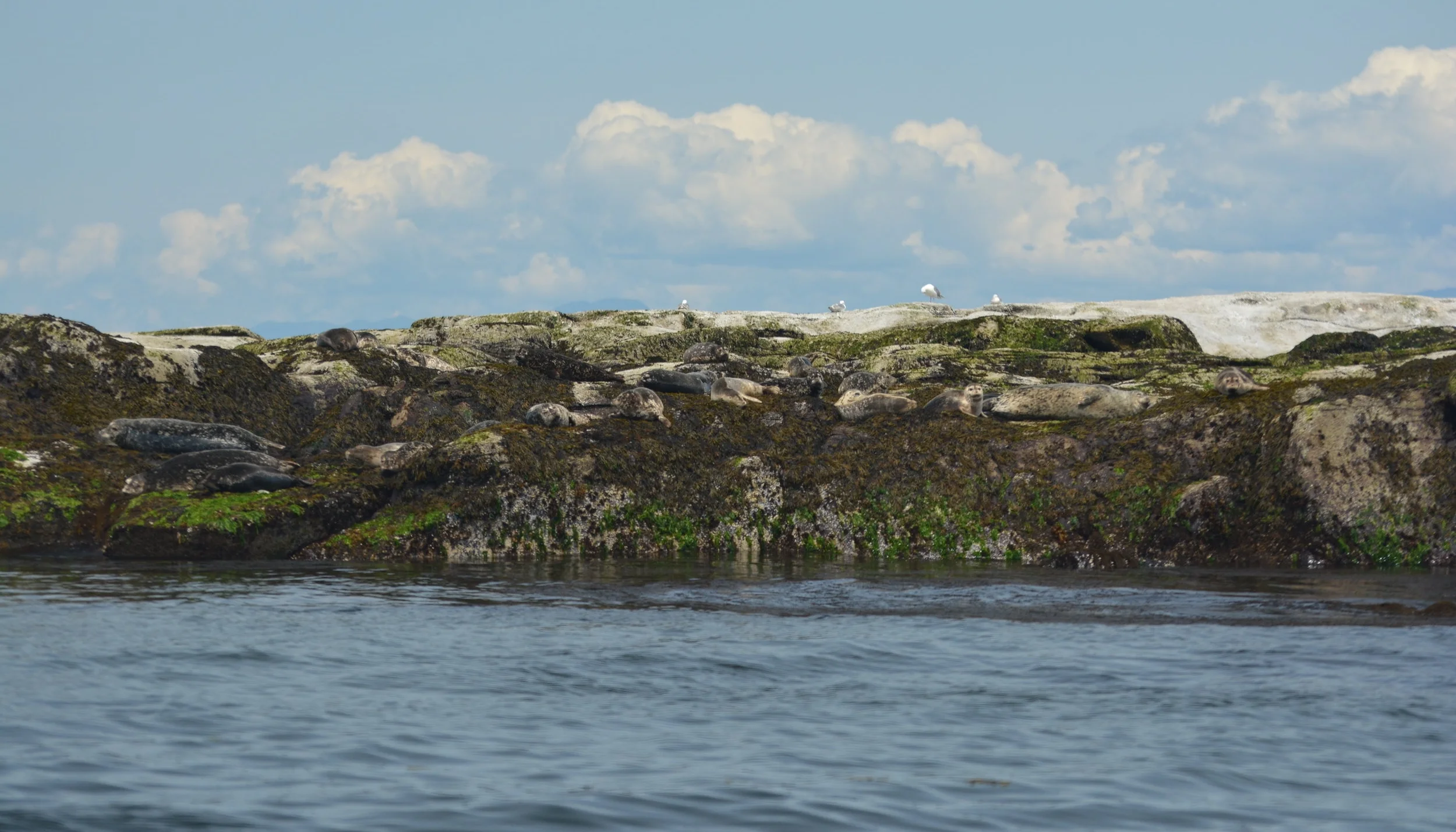See any animals here? Look closely, this intertidal zone is covered with well camouflaged harbour seals. Photo by Alanna Vivani.