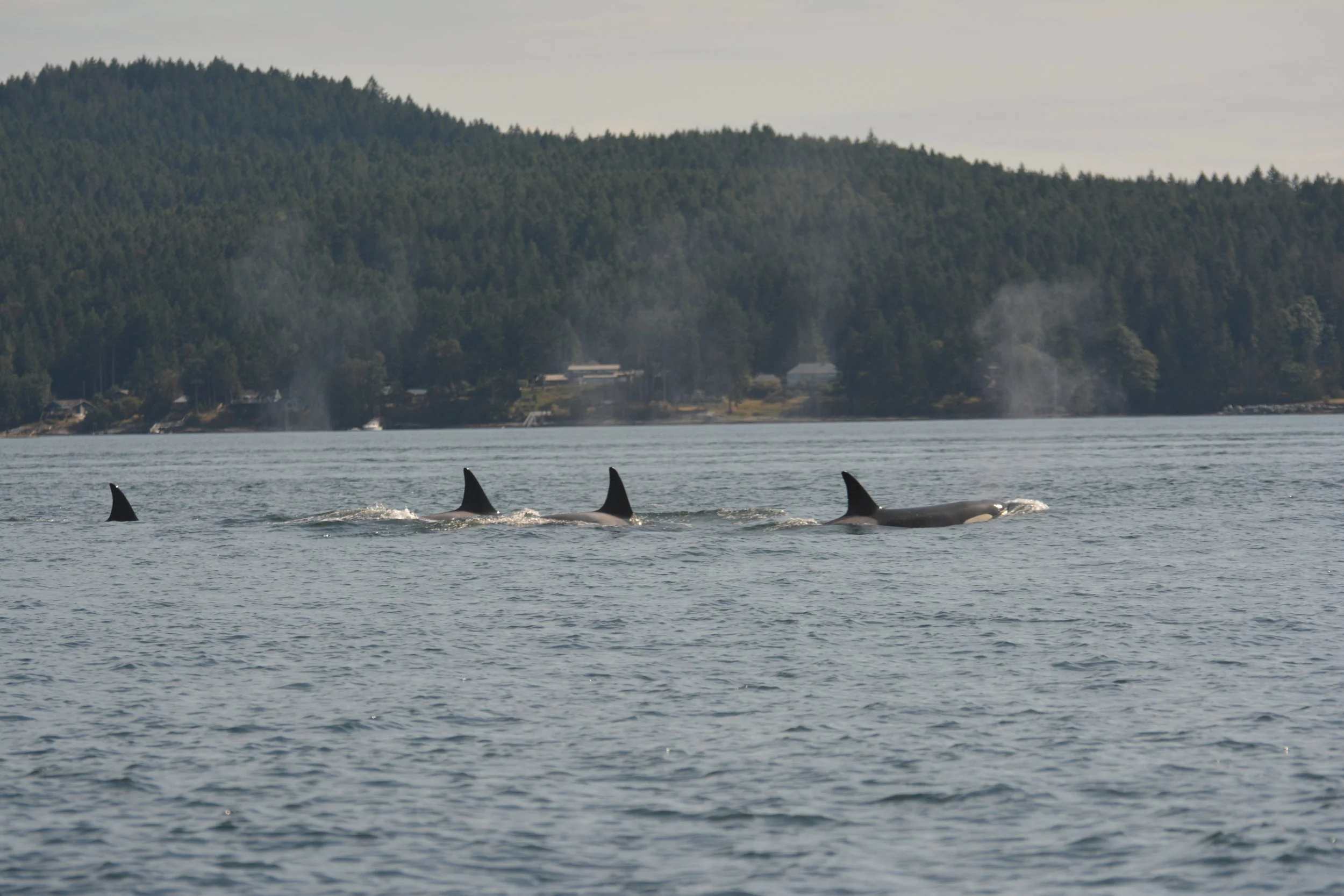 In the afternoon we travelled down to Active Pass where we were greeted by a T-Party (multiple pods of transient orca). Here we found the T36A’s, T37’s, T65A’s, and the T124’s just North of the pass. We got to see the pods socializing and breaching, and we were able to use our hydrophones (underwater hydrophones) to hear the pods vocalizing! Transients rarely vocalize (if you were a seal and you heard a big predator talking, would you want to stick around?) so hearing the pods mingle and socialize was awesome.