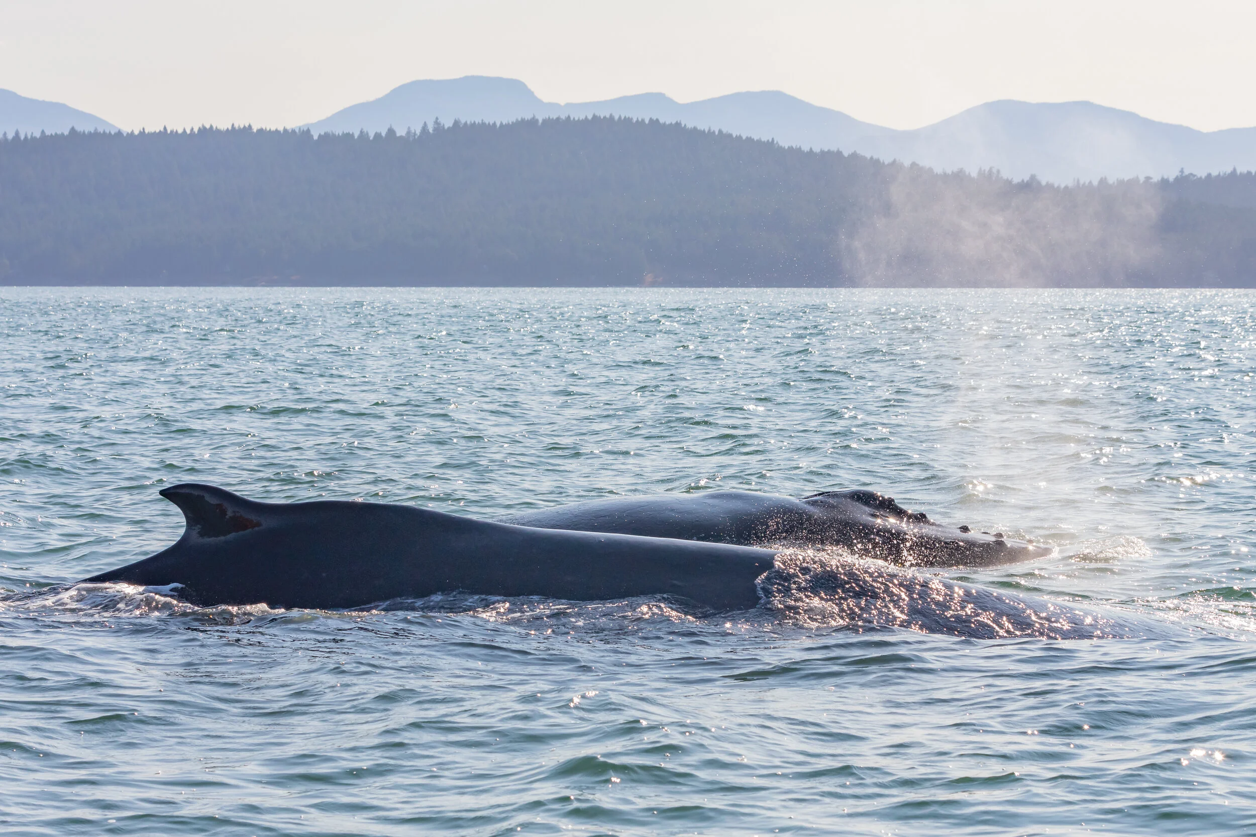 The first time they showed up our boats had been watching Slate and Marble for a while, and a new face appeared, trumpeting as they surfaced. They never fluked, but based on their size and behaviour, we guessed it might be Olympus. Olympus is known to be a vocal whale, and was the humpback who charged into an orca t-party back in July.