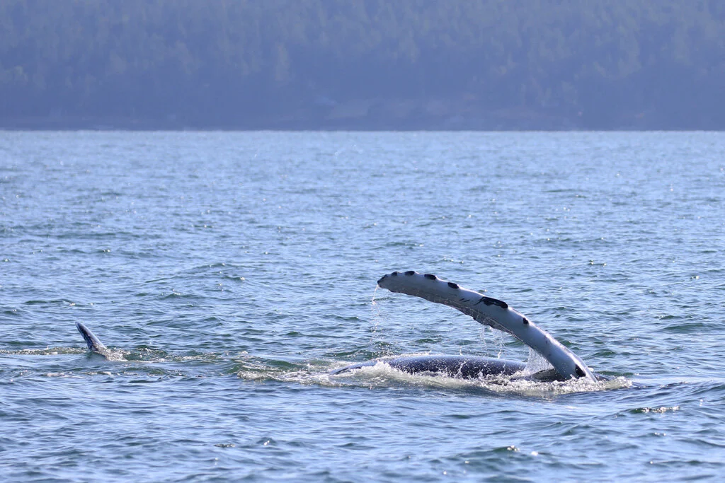 On our Aug 17th tour we found our favorite humpback duo, Slate and her son Marble hanging out in their usual spot near Porlier pass. In the morning these 2 were traveling and diving, looking for tasty food below the waves. In the afternoon Marble gave one of our boats a nice close pass, rolling and splashing in the waters, showing off their big beautiful fluke. Mom was keeping a much closer eye on Marble today, doing some deep dives while Marble swam circles around us, but always coming back to see how he was doing.