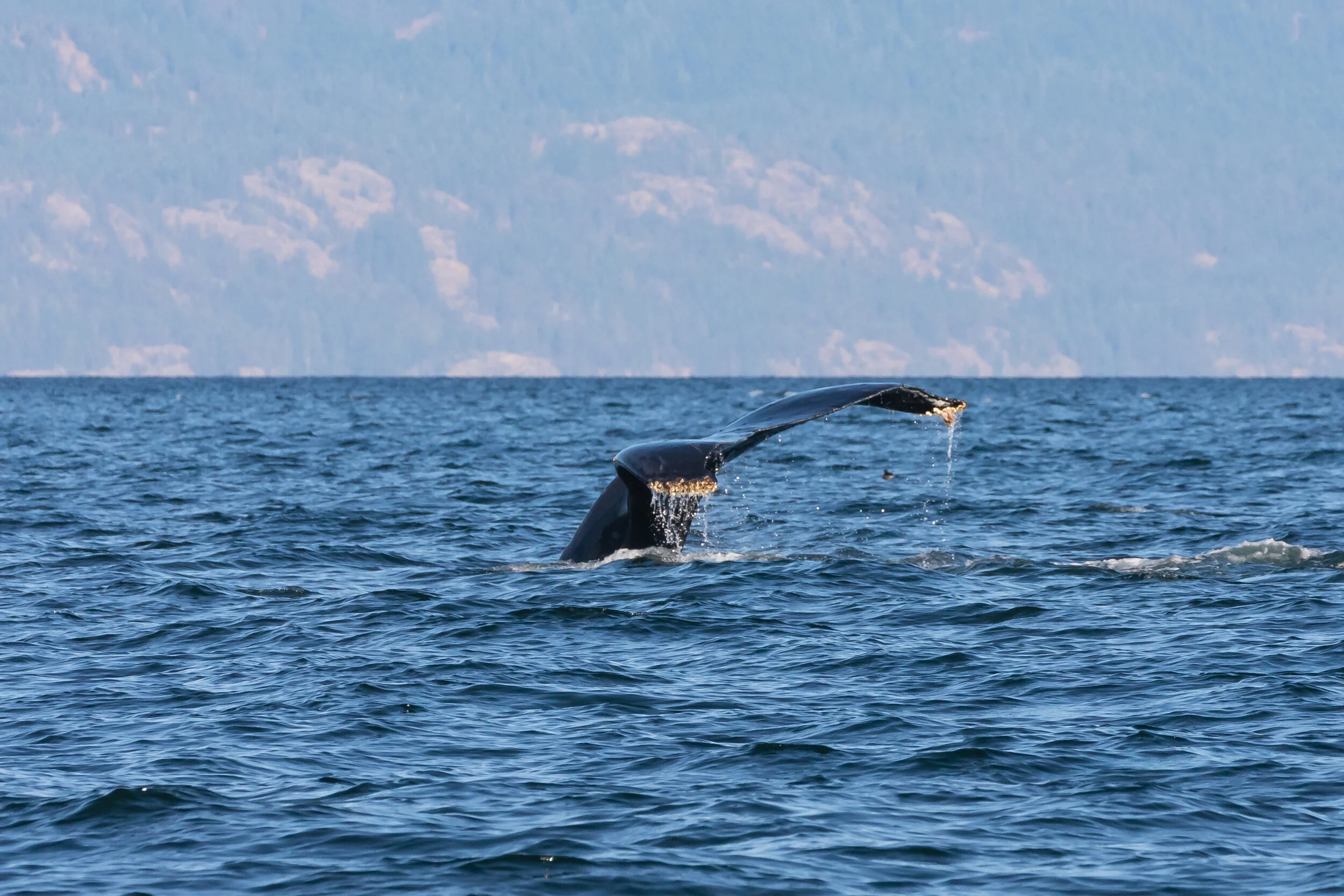 For our afternoon tour, we found two humpback whales near Texada Island. Europa and her calf were the two humpbacks we saw that were travelling. Humpbacks migrate here from Hawaii around April and will remain here until the end of November to feed. The waters here are very nutrient rich during these months and they can find lots of krill and small fish to eat during this time. They will eat close to 3000 pounds of food per day while they’re here to bulk up before they go back to Hawaii or Mexico which are their breeding grounds.