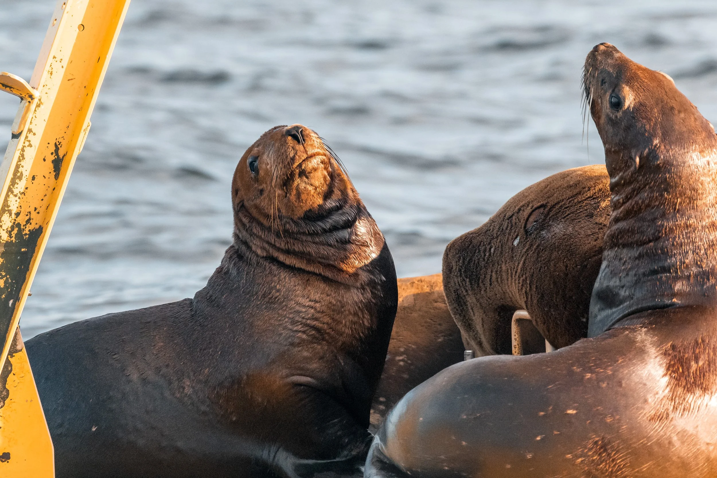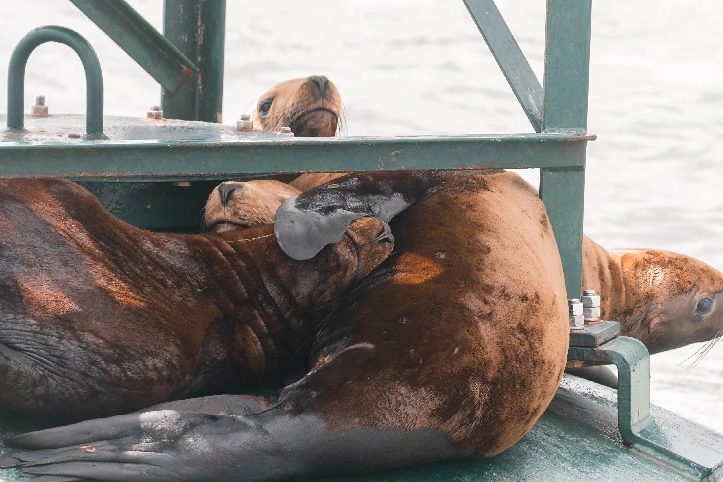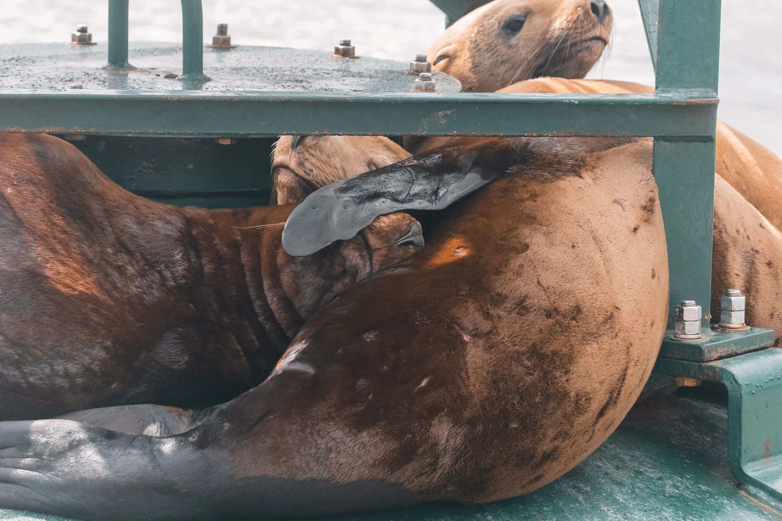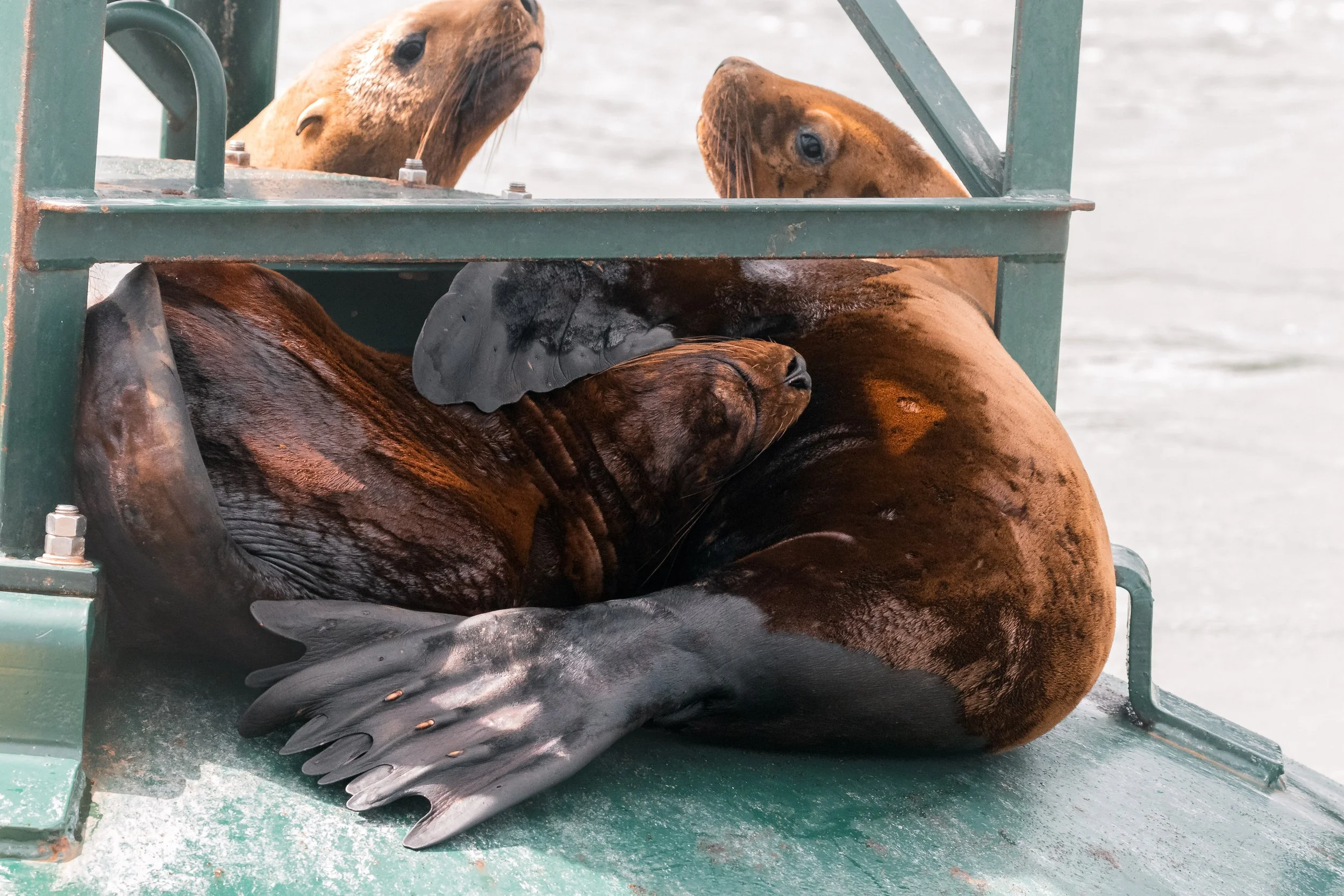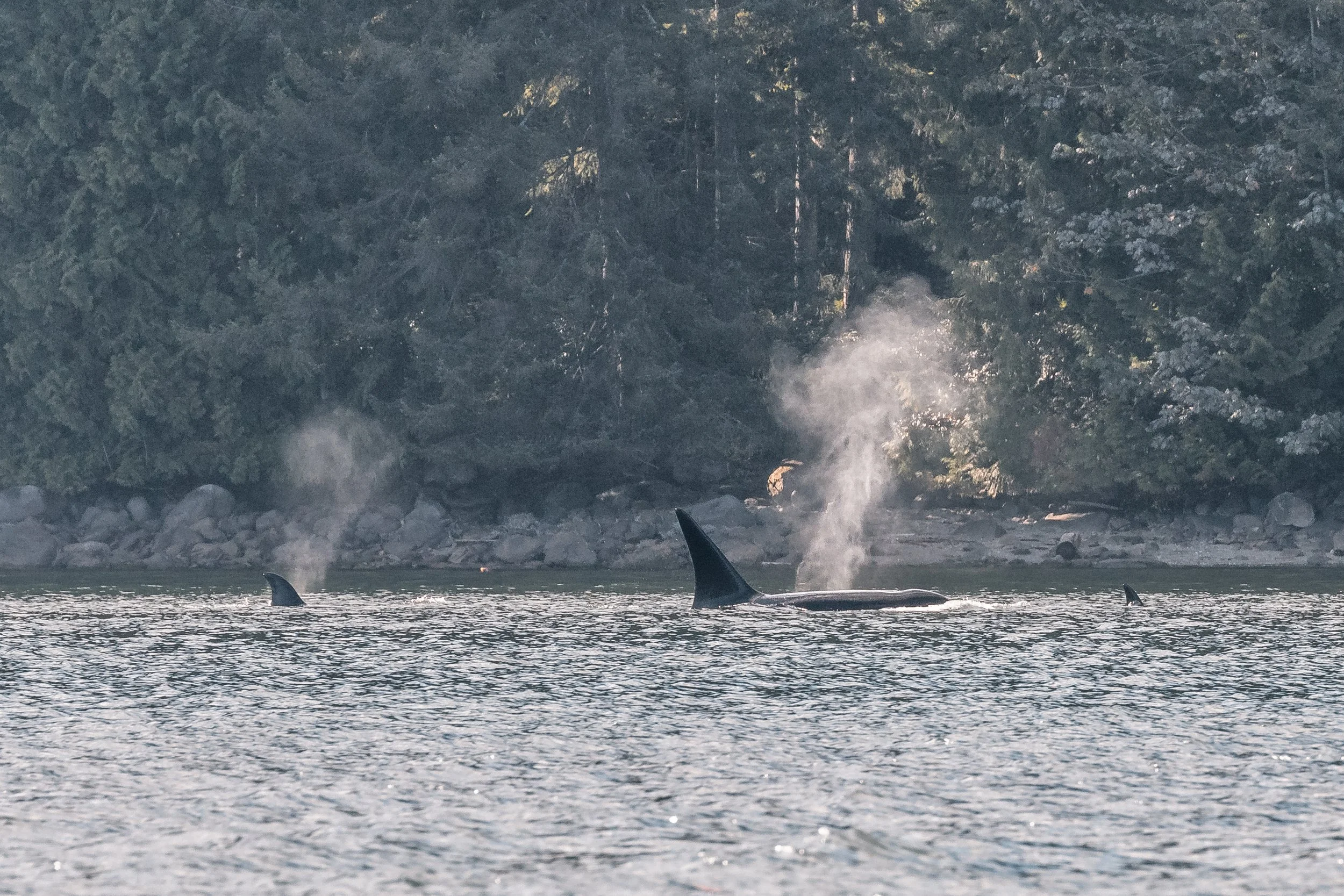 In the afternoon we encountered the same orcas as the day before, the T090s. Eagle, Piglet, Tigger, and Kanga were travelling through Howe sound. They stopped to have a little dinner near the mill, an unlucky harbour seal, before continuing on their way. Each adult orca needs about 300 lbs of food to maintain their weight, which equates to about 1.5 seals each. For a family of 4 that’s 1200 lbs or about 6 seals a day. This means the family must be constantly on the move and looking for their next meal. With the population of harbour seals in the Salish Sea being around 105,000 there’s no shortage of food for our orca. Onto of the seals they also snack on sea lions, porpoises or even other species of whales, like Humpbacks, minke, or grey whales.