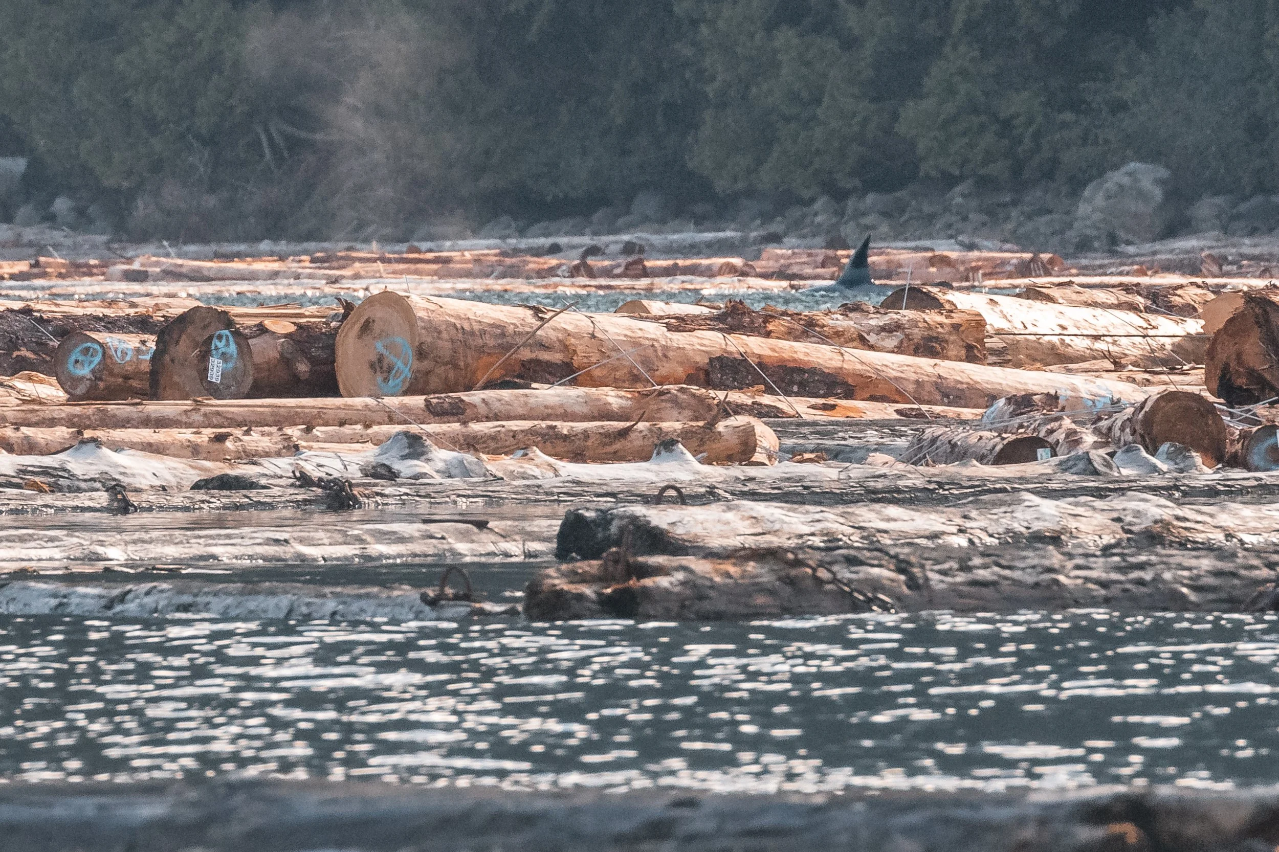 Our orca were using the logs themselves today, startling seals that were hiding in the booms. Can you spot the orca in the photo below?