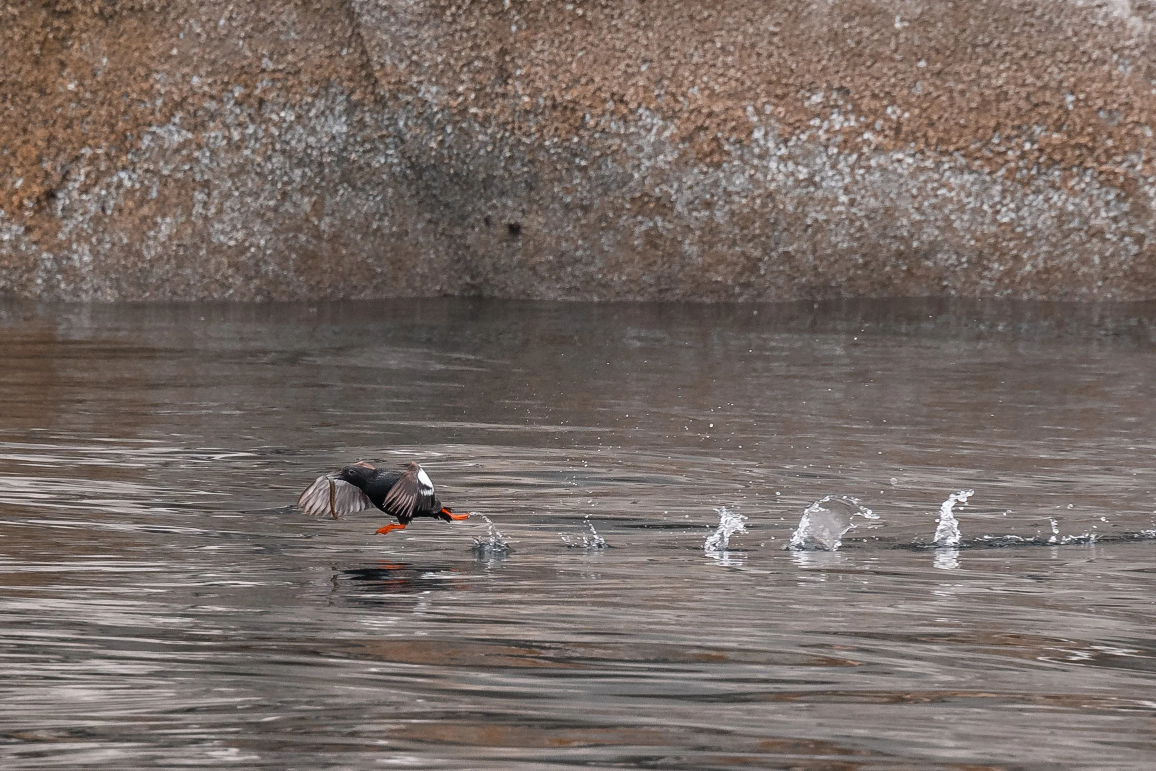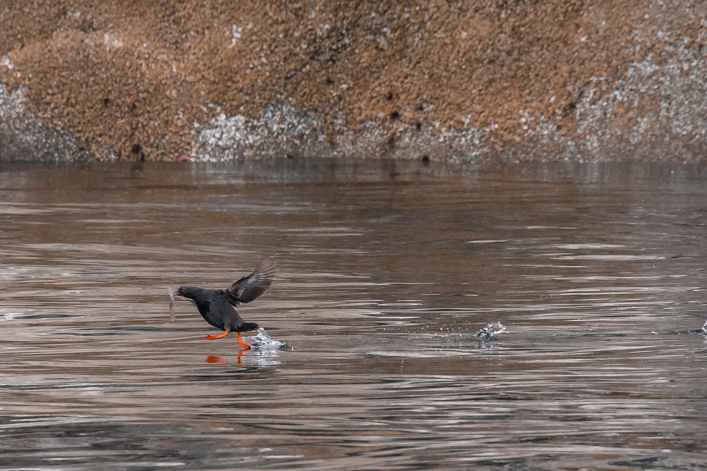 A little Pigeon guillemot fishing off of the Gabriola bluffs. These little birds have been raising chicks along the bluffs for a few years now. We can never see the babies, but we often see the adults foraging along the cliffs for small fish. This little Guillemot was successful in their hunt today, flying off to their nest with their fresh catch!