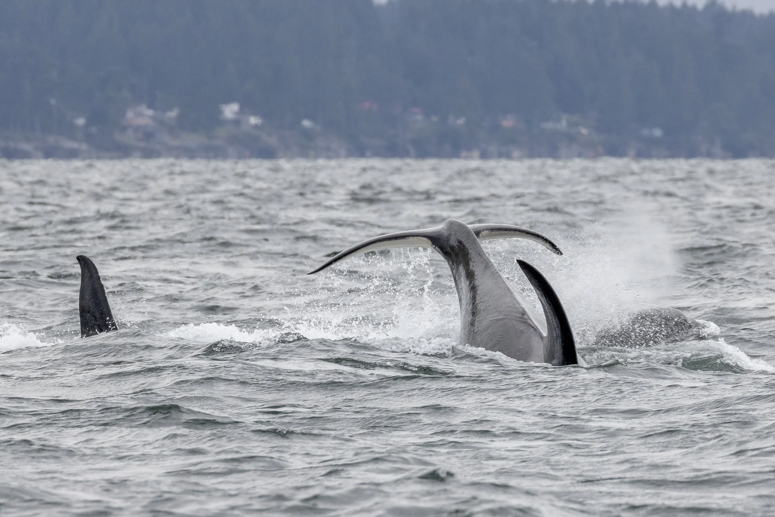To start off our day, we stopped by False Narrows. False Narrows is a narrow waterway located between Gabriola Island and Mudge Island, and today we had orca passing through it! The T124A’s (including T124A Sabio and her adorable calf T12A4A) and T124C Cooper were travelling and tail slapping away as they headed north. Matriarch T124A Kittiwake and T124C Cooper are actually siblings - they are both the children of T124 Myrtle. Cooper has been travelling with his sister and his nieces/nephews for a while now, including our encounter on April 12, 2023. It’s always great seeing orca family reunions in action! After splashing away in the Narrows, they continued through Northumberland channel, and out into the Strait.