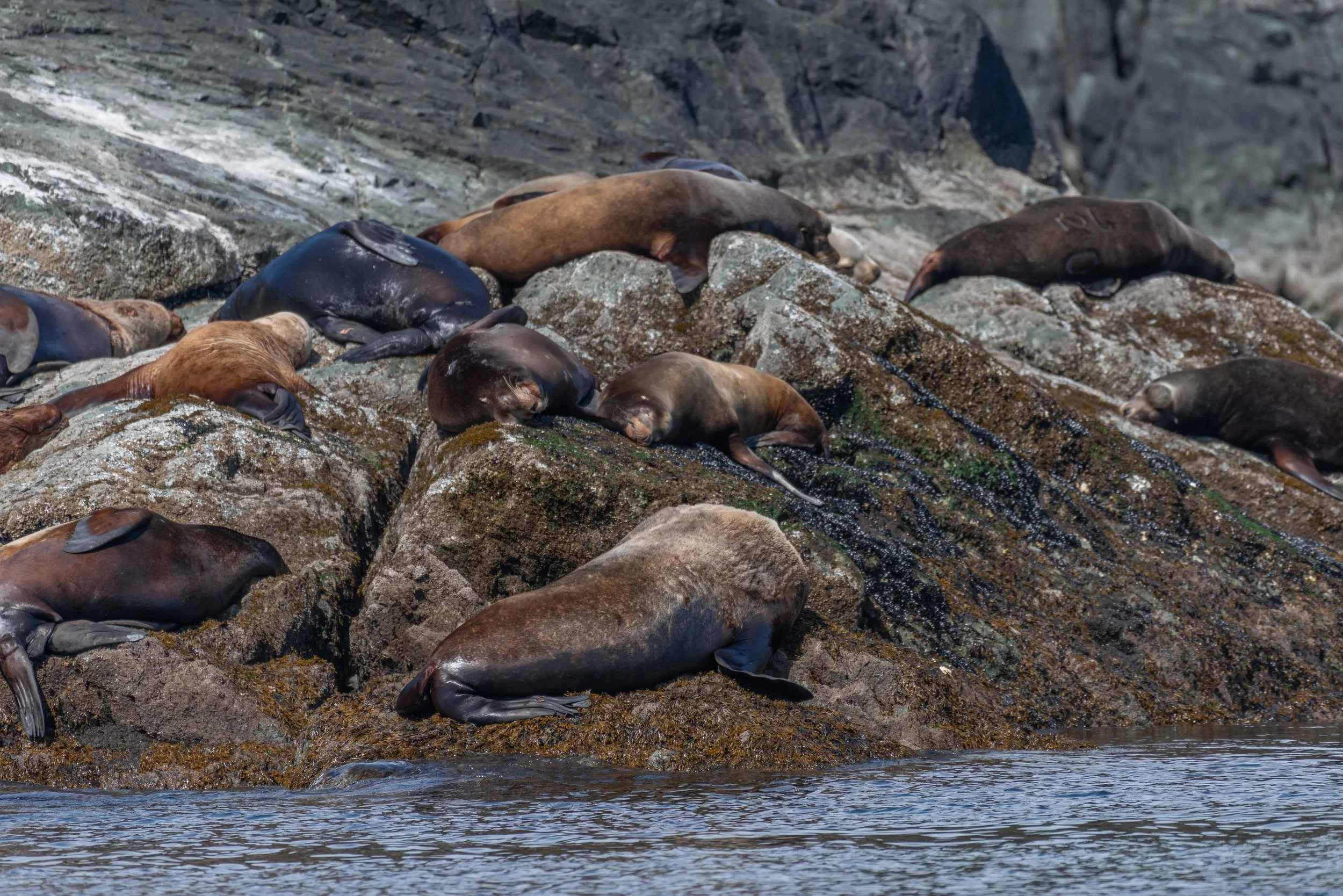 Today’s search took us up north, close to Texada Island, as we were searching for whales, the seas were calm making conditions nearly perfect for a whale-watching trip. Along our journey we stopped at a Sea Lion haul out and were lucky enough to have both species of sea lion present: The California Sea Lion and the Steller Sea Lion. As you can see from the photos below, there is quite the size difference between these two! Our keen-eyed naturalist even noticed that one of the California Sea Lions had an injury on their flipper! Even though we just got a small glimpse into the life of this sea lion, it didn’t seem too bothered by the small wound. We continued the search, around the northern section of the Strait of Georgia, but after finding nothing except some Harbour Porpoise, we started the journey south. Eventually we found ourselves back in the harbour, without finding any whales. Although rare, it does happen since wildlife can be unpredictable. Not to worry though, each of our guests today will get another chance to try again for free!