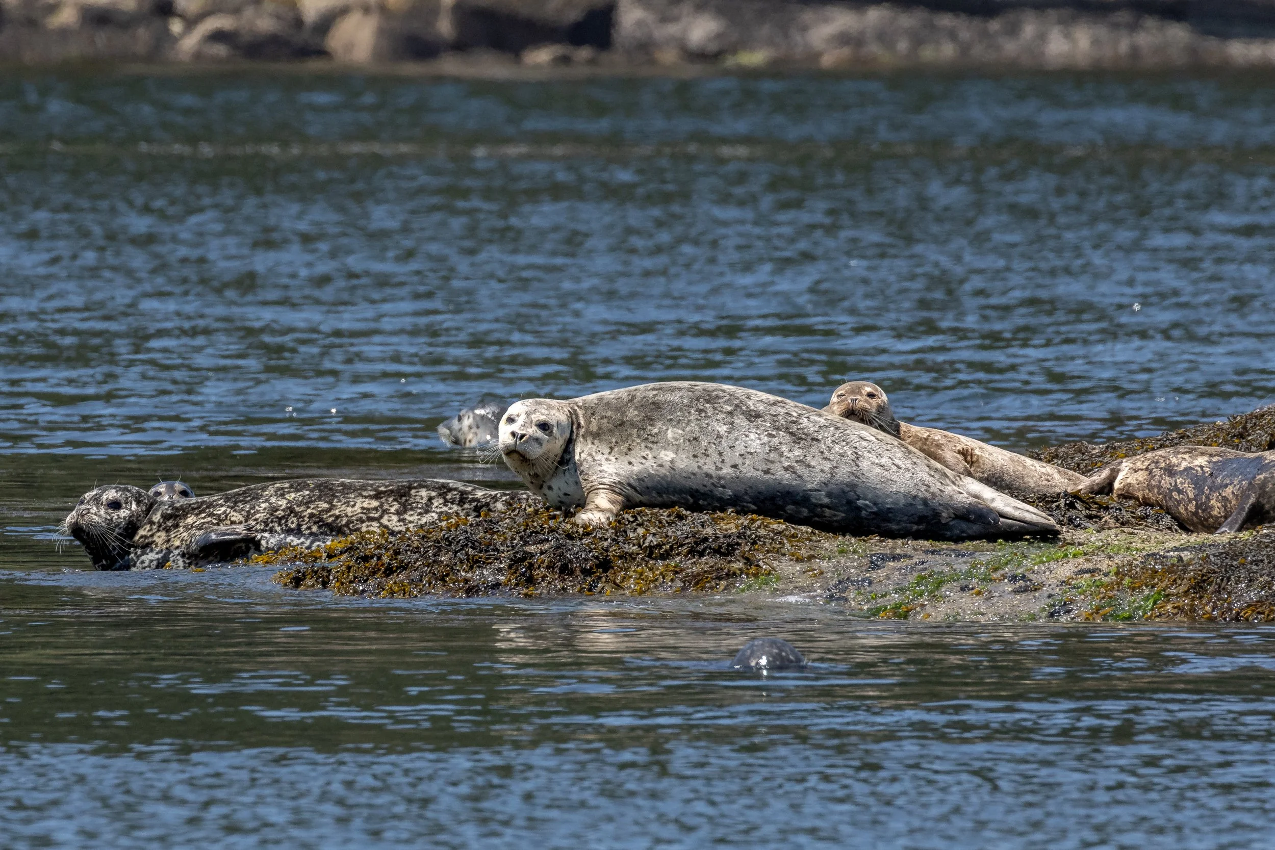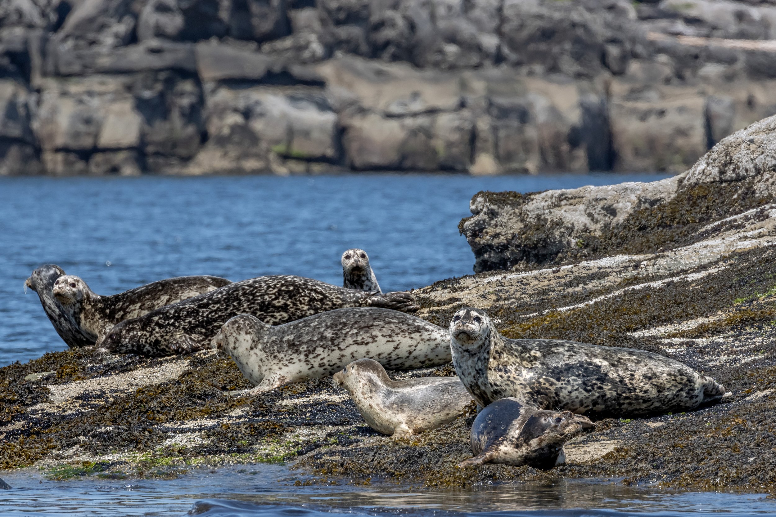 A big haul out of Harbour Seals. Look how well they camouflage! Photo by Vanessa Vereschahen.