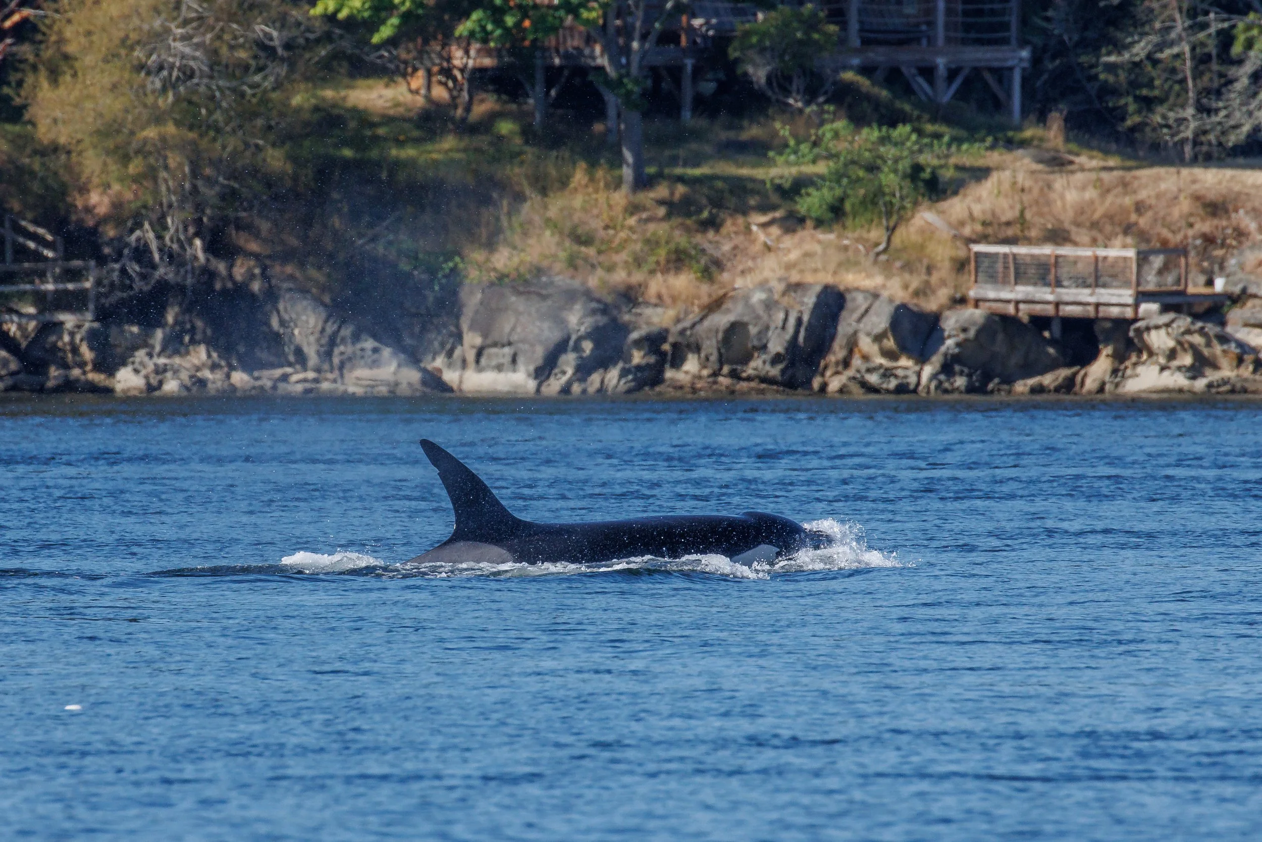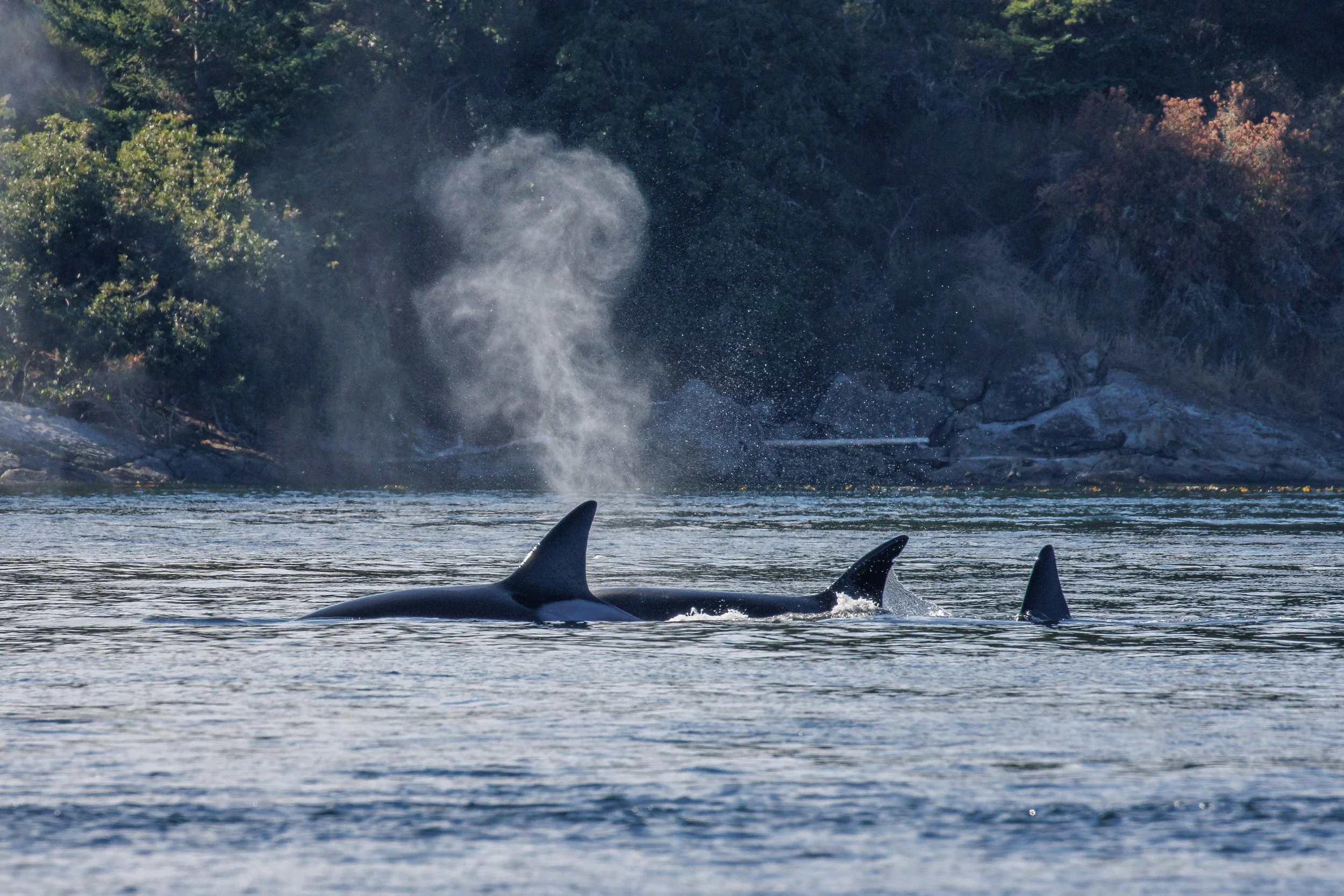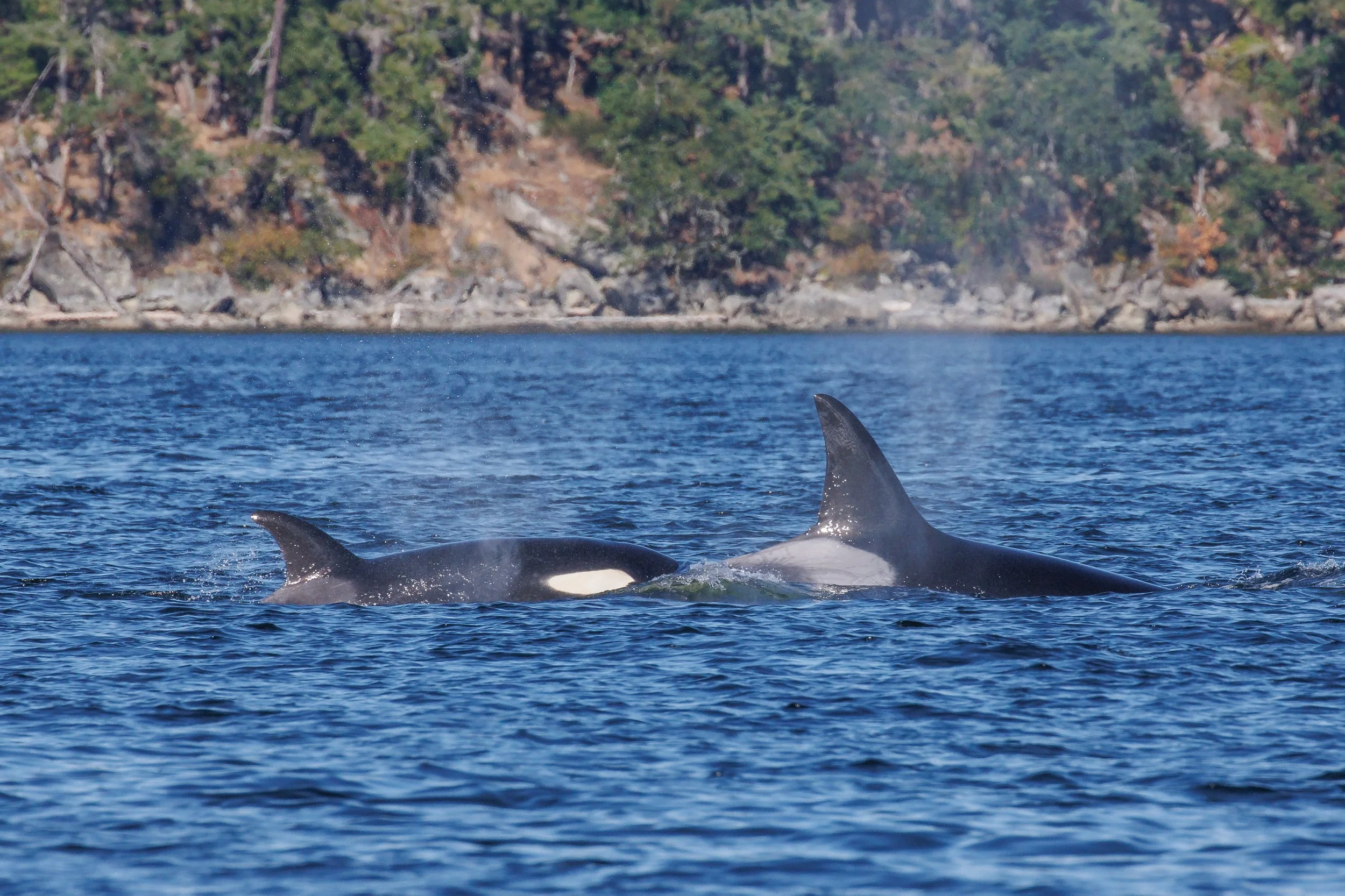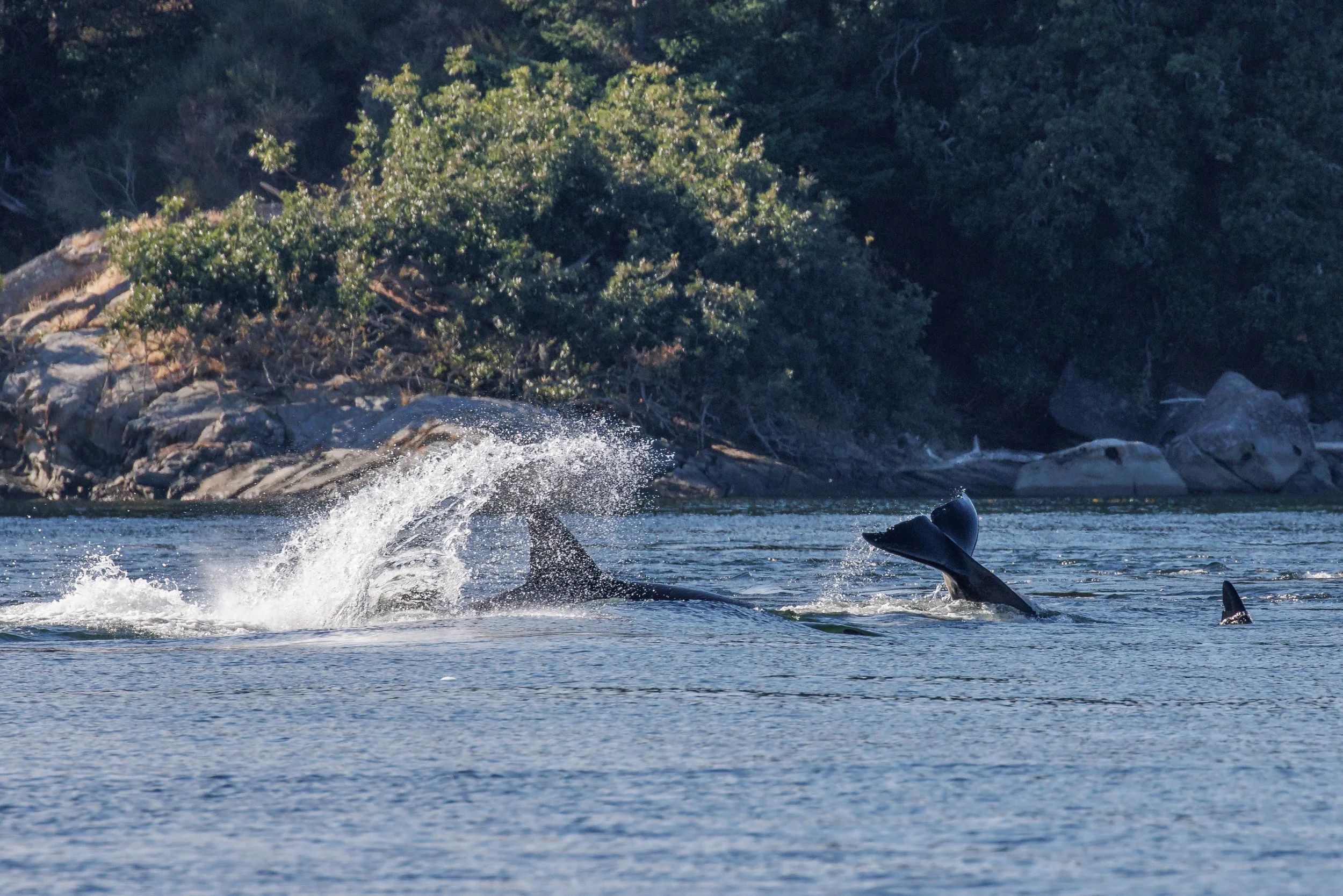 When travelling in larger groups in T-parties we will sometimes see less common behaviours such as porpoising, breaching, and tail slapping! Usually, this is mostly seen during or after they’ve made a kill! It’s a bit more difficult to hunt when a T-Party occurs. However, throughout the trip, we noticed the pods split up and began travelling down the coastline to Porlier Pass. When the pods split up like this it’s to minimize the amount of sound created. Since the mammals they are hunting all have well-established hearing. This allows them to have a chance at ambushing their prey. Whether it be a harbour seal, Steller sea lion or porpoise. This theory was likely accurate as during this split the T034’s successfully hunted a Harbour Seal and then the T002Cs also seemed to have a successful hunt closer to Valdes Island. Afterwards, the celebrations commenced!