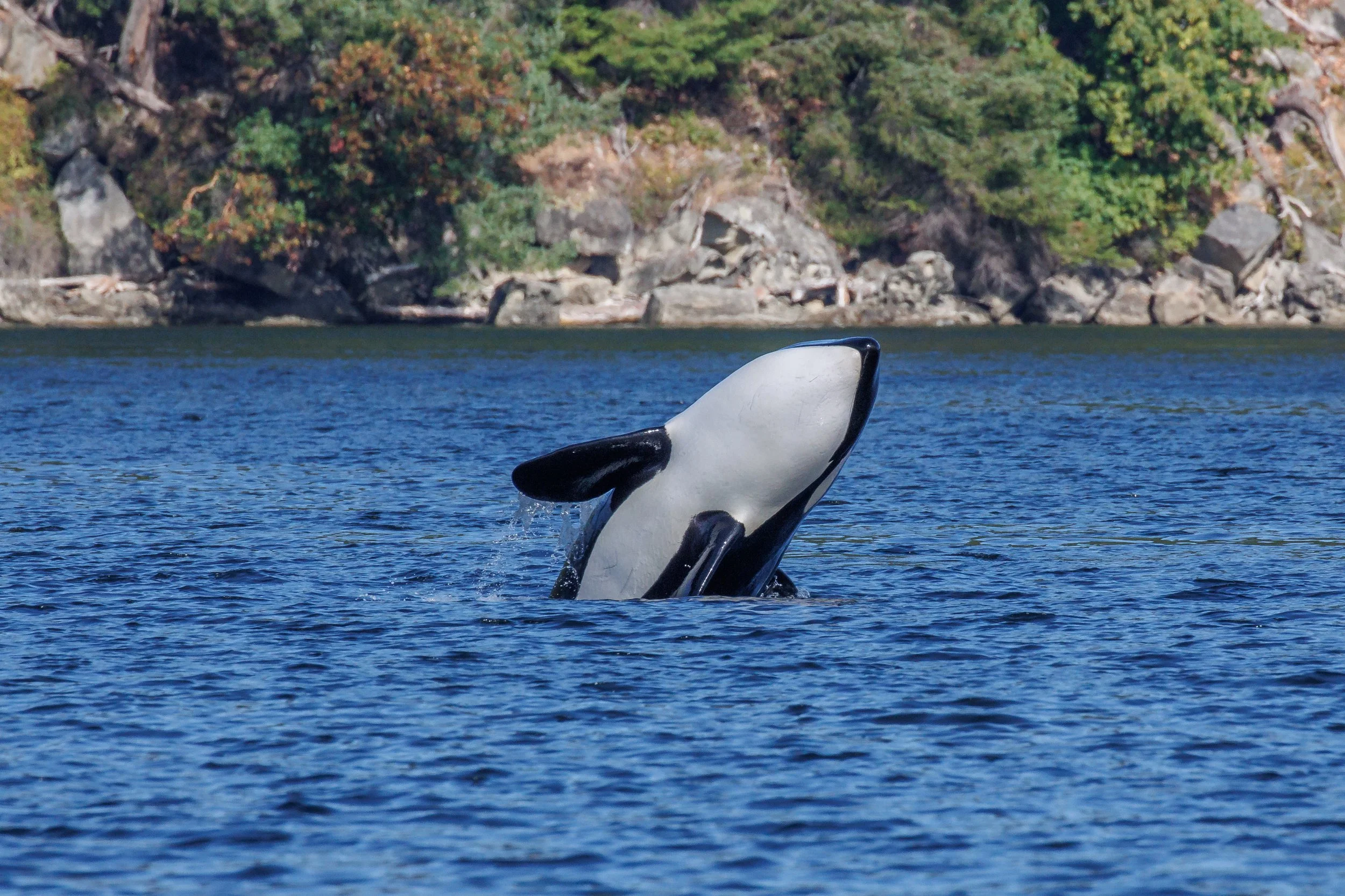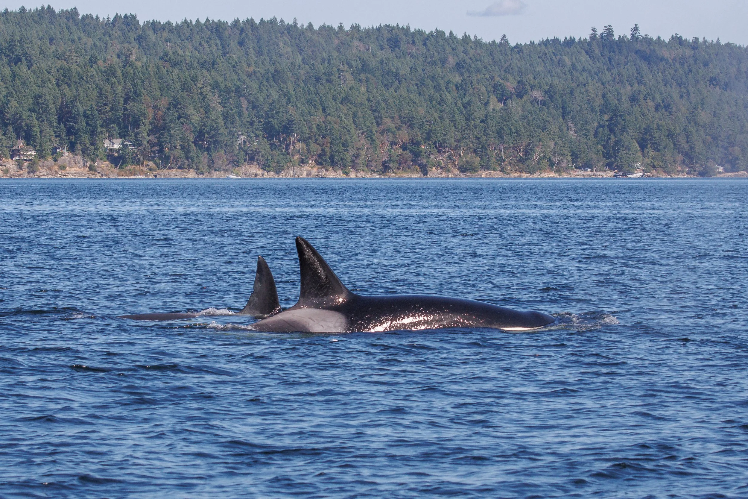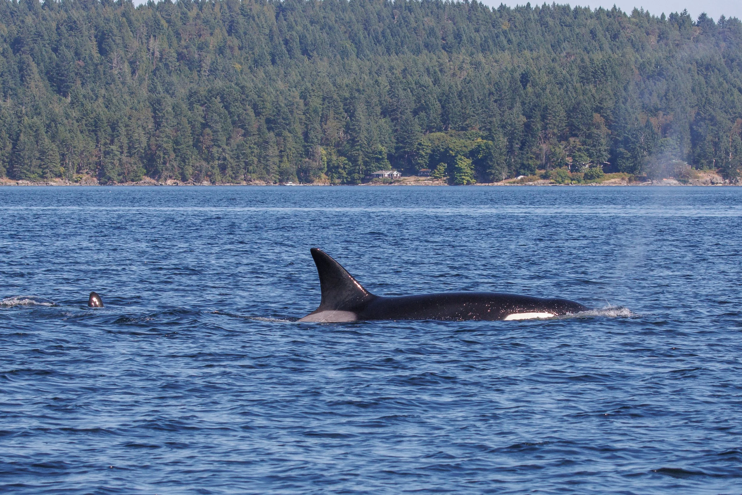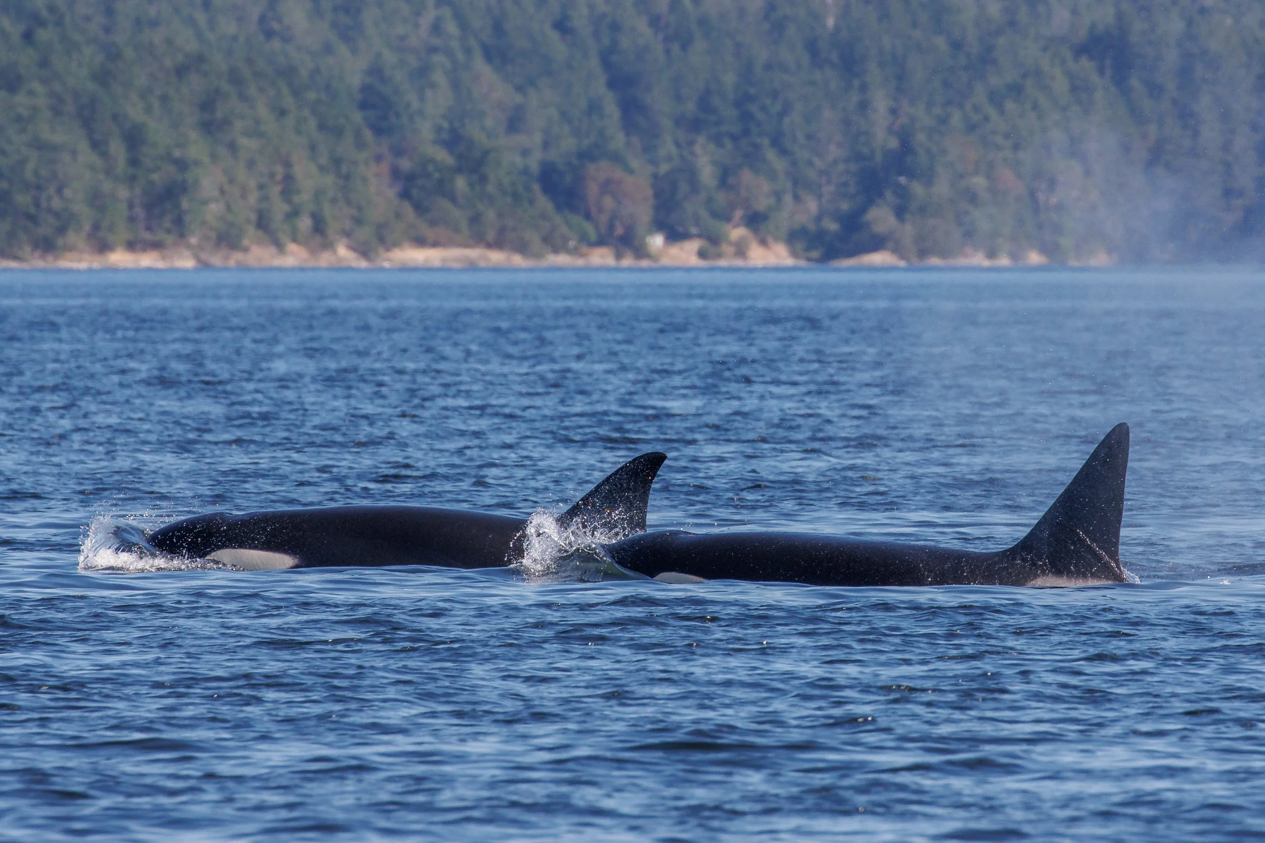 When travelling in larger groups in T-parties we will sometimes see less common behaviours such as porpoising, breaching, and tail slapping! Usually, this is mostly seen during or after they’ve made a kill! It’s a bit more difficult to hunt when a T-Party occurs. However, throughout the trip, we noticed the pods split up and began travelling down the coastline to Porlier Pass. When the pods split up like this it’s to minimize the amount of sound created. Since the mammals they are hunting all have well-established hearing. This allows them to have a chance at ambushing their prey. Whether it be a harbour seal, Steller sea lion or porpoise. This theory was likely accurate as during this split the T034’s successfully hunted a Harbour Seal and then the T002Cs also seemed to have a successful hunt closer to Valdes Island. Afterwards, the celebrations commenced!