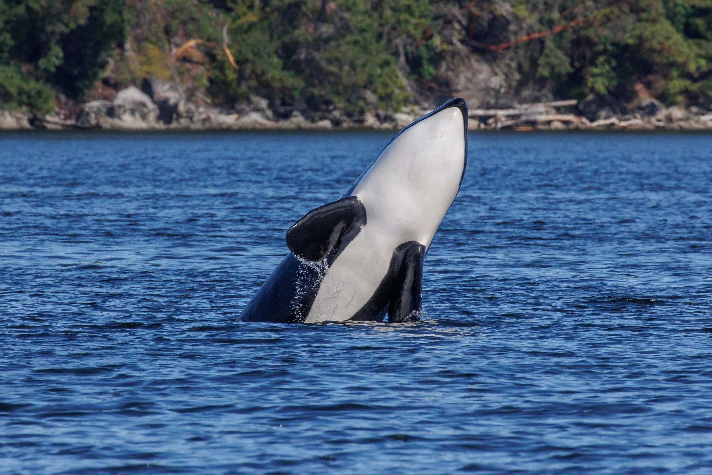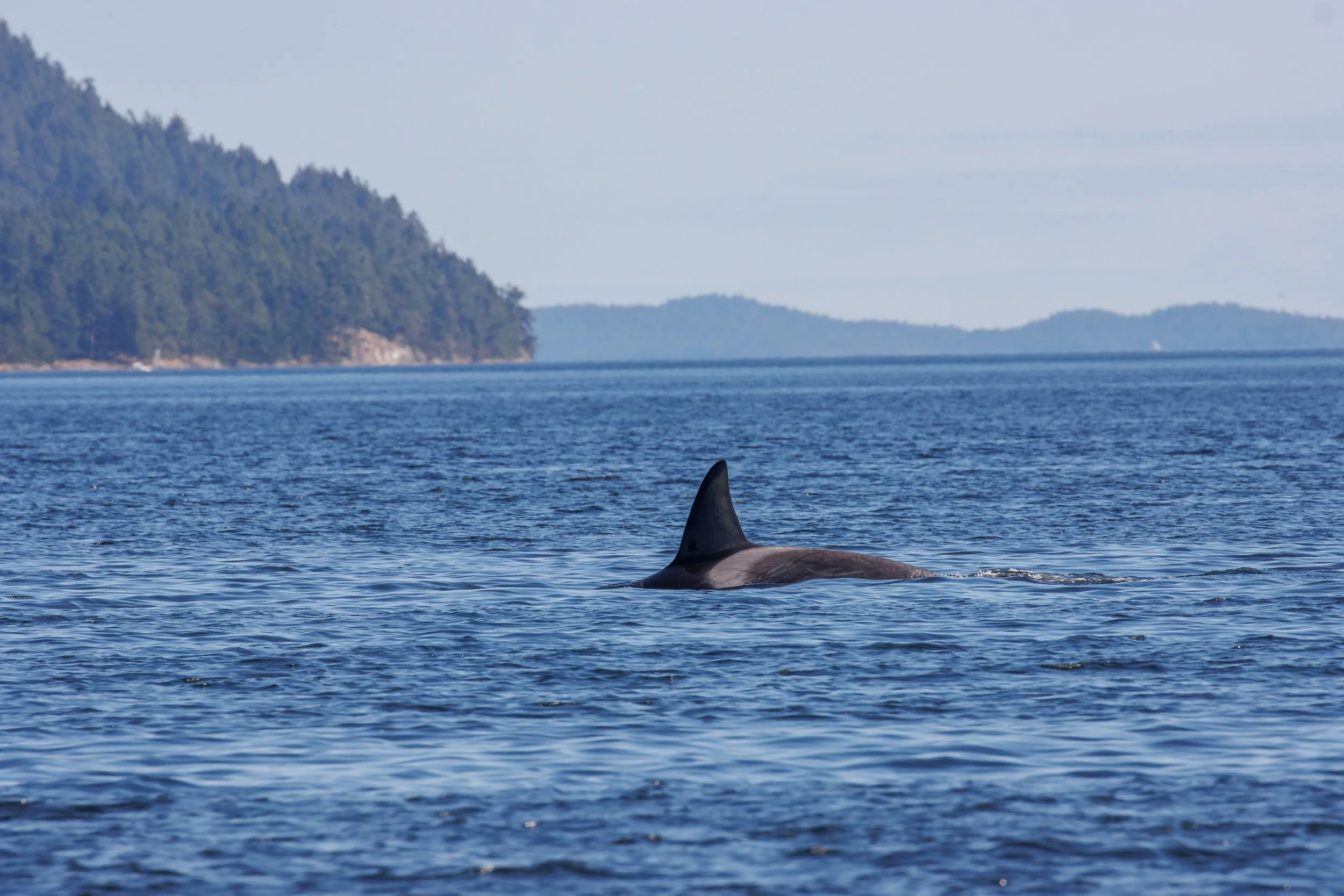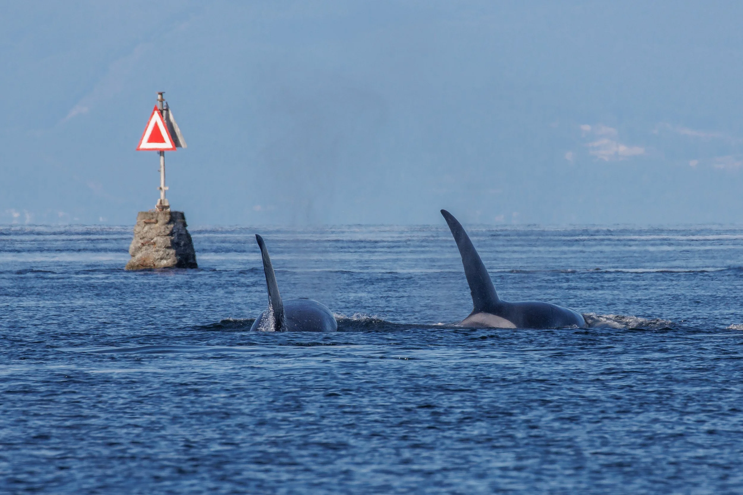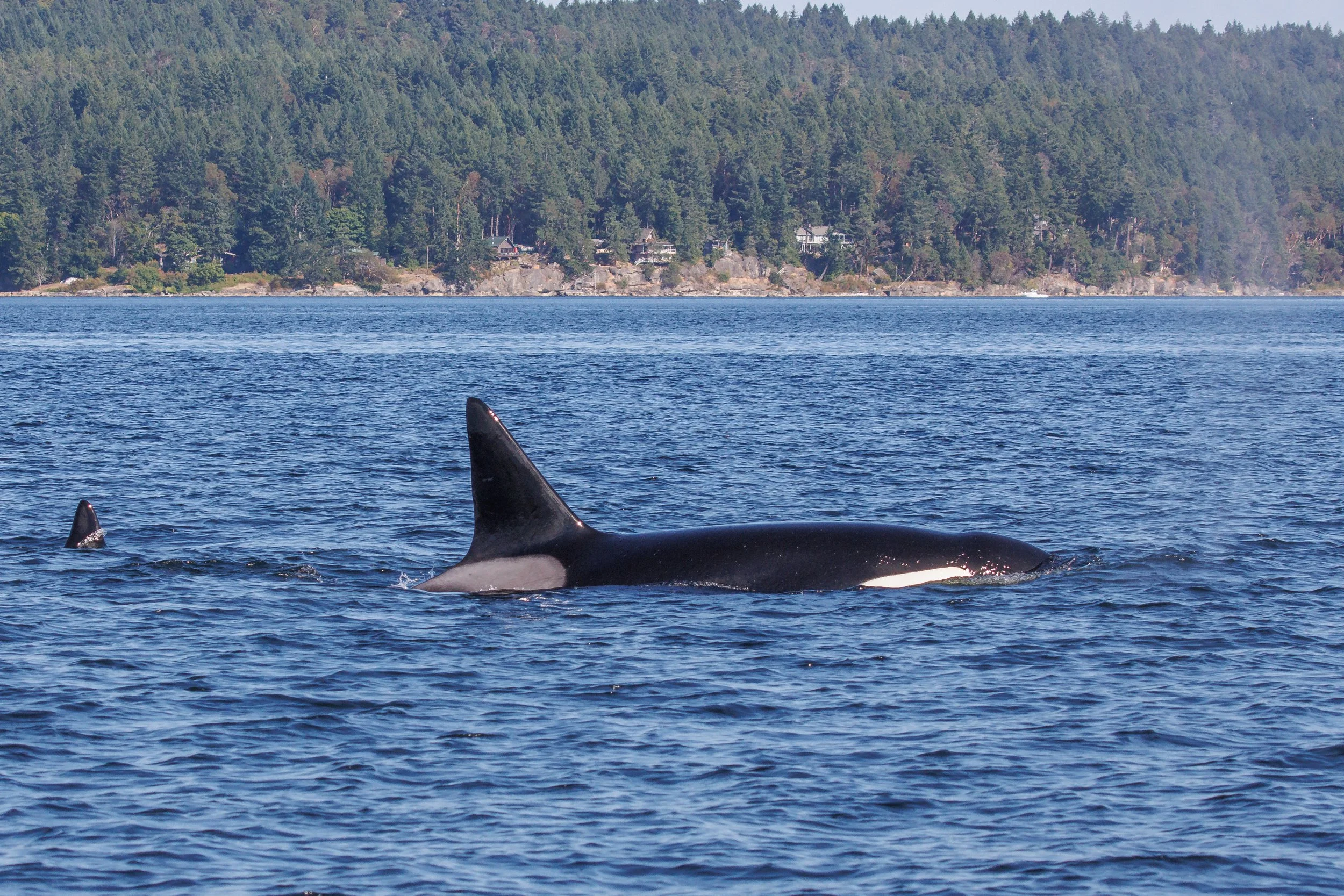 When travelling in larger groups in T-parties we will sometimes see less common behaviours such as porpoising, breaching, and tail slapping! Usually, this is mostly seen during or after they’ve made a kill! It’s a bit more difficult to hunt when a T-Party occurs. However, throughout the trip, we noticed the pods split up and began travelling down the coastline to Porlier Pass. When the pods split up like this it’s to minimize the amount of sound created. Since the mammals they are hunting all have well-established hearing. This allows them to have a chance at ambushing their prey. Whether it be a harbour seal, Steller sea lion or porpoise. This theory was likely accurate as during this split the T034’s successfully hunted a Harbour Seal and then the T002Cs also seemed to have a successful hunt closer to Valdes Island. Afterwards, the celebrations commenced!