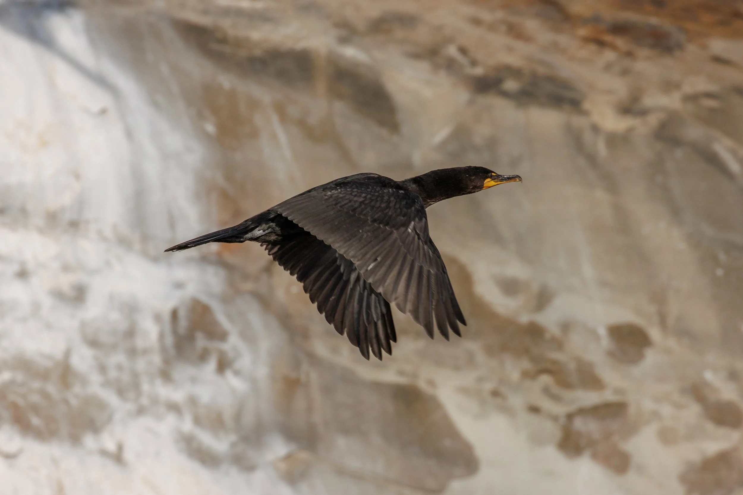 A cormorant in flight in front of the Gabriola Bluffs. Photo by Val Watson.