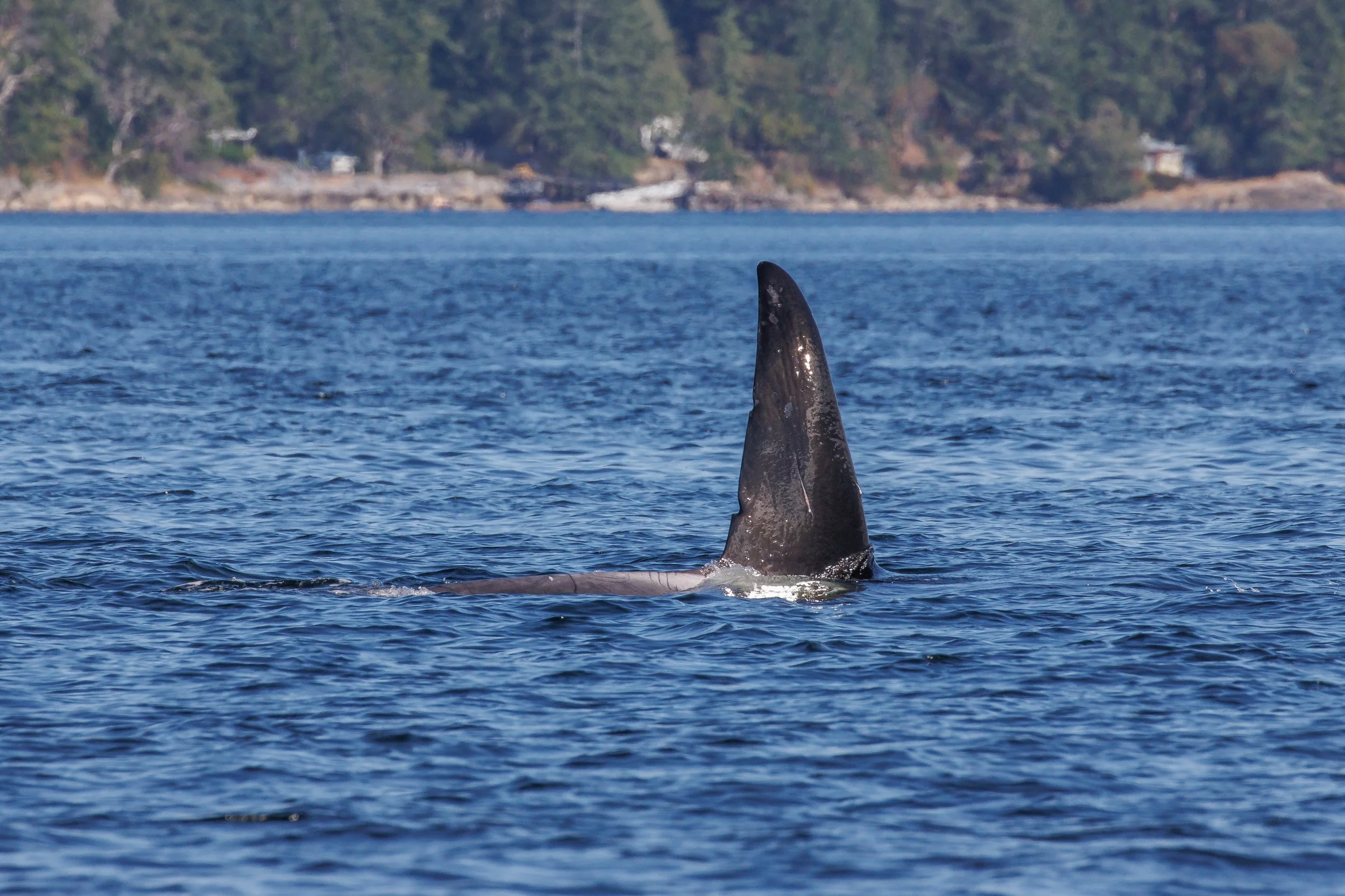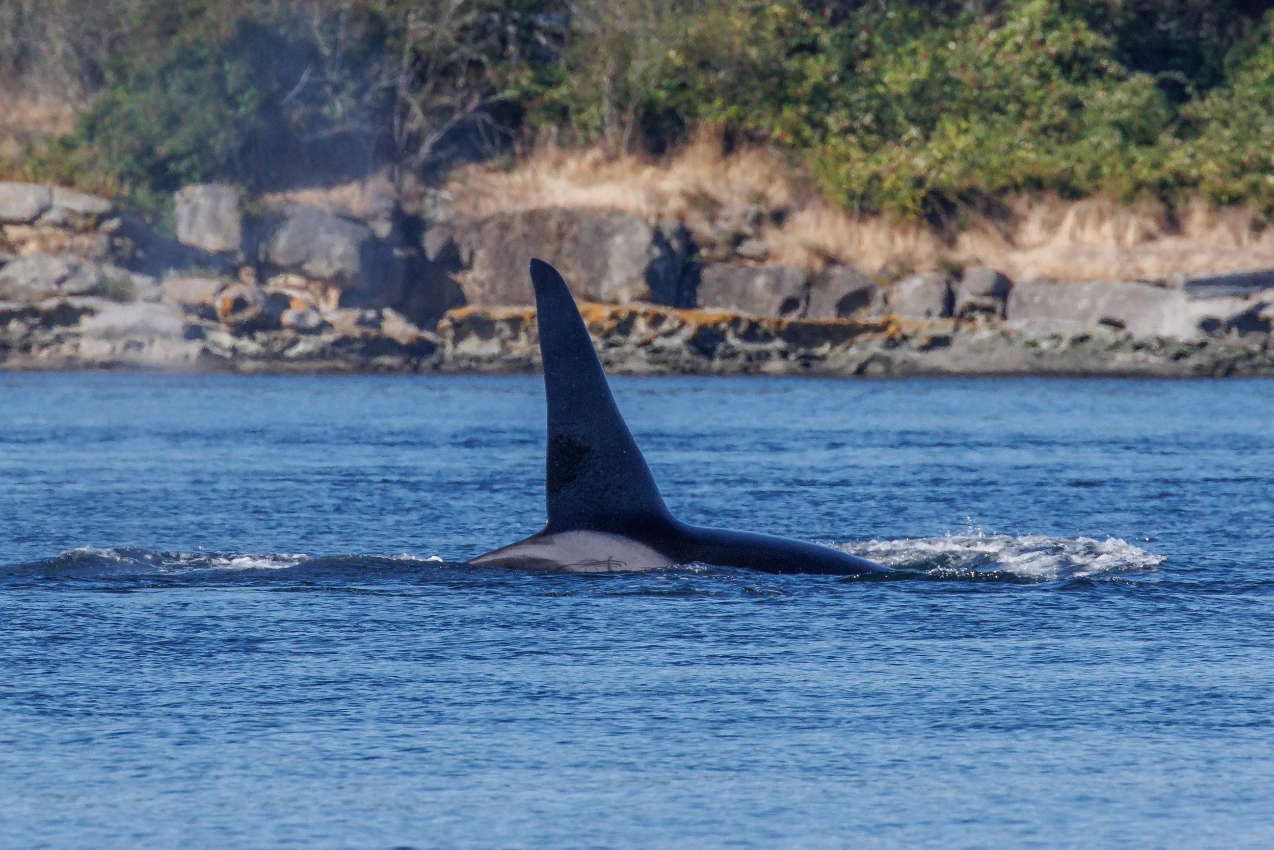 Looking up the back of T137A Jack’s dorsal fin. Photo by Val Watson.