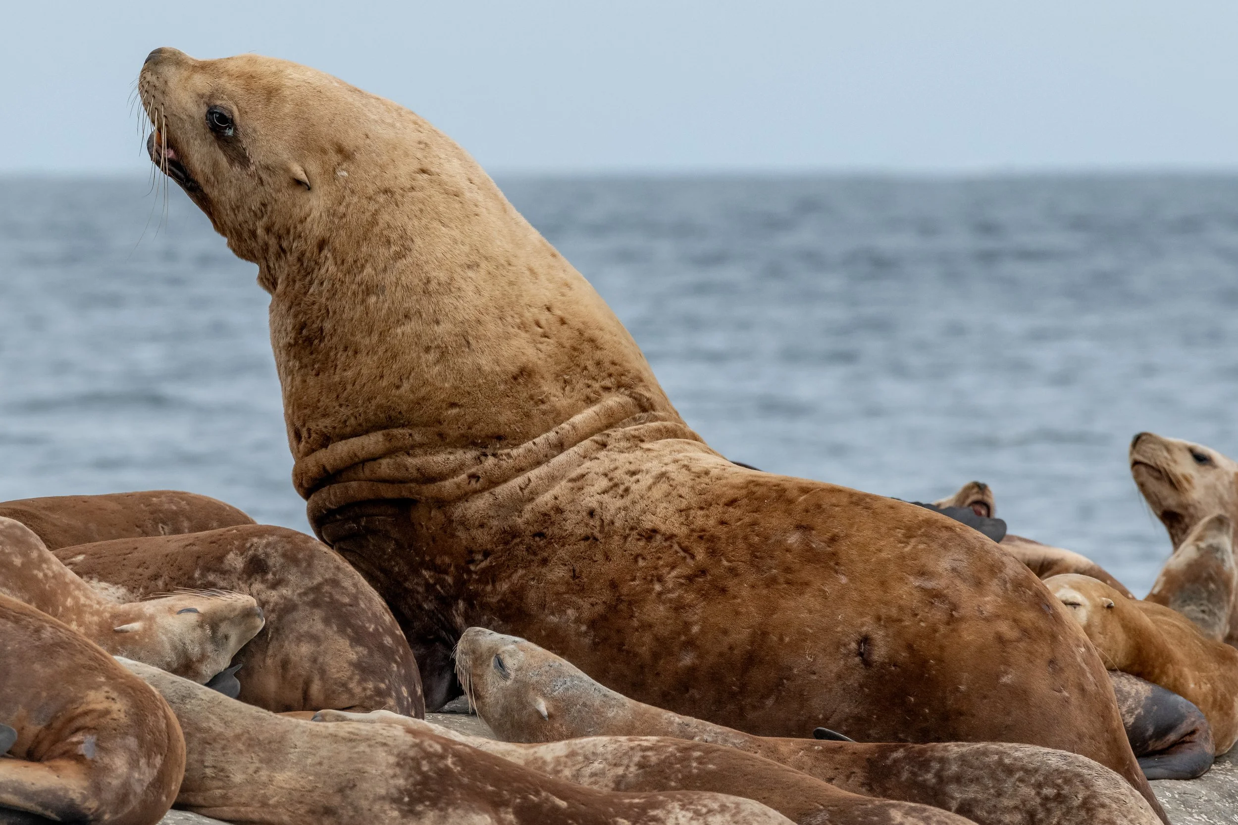 A massive male Steller Sea Lion amongst the smaller ones. Photo by Aly Kohlman.