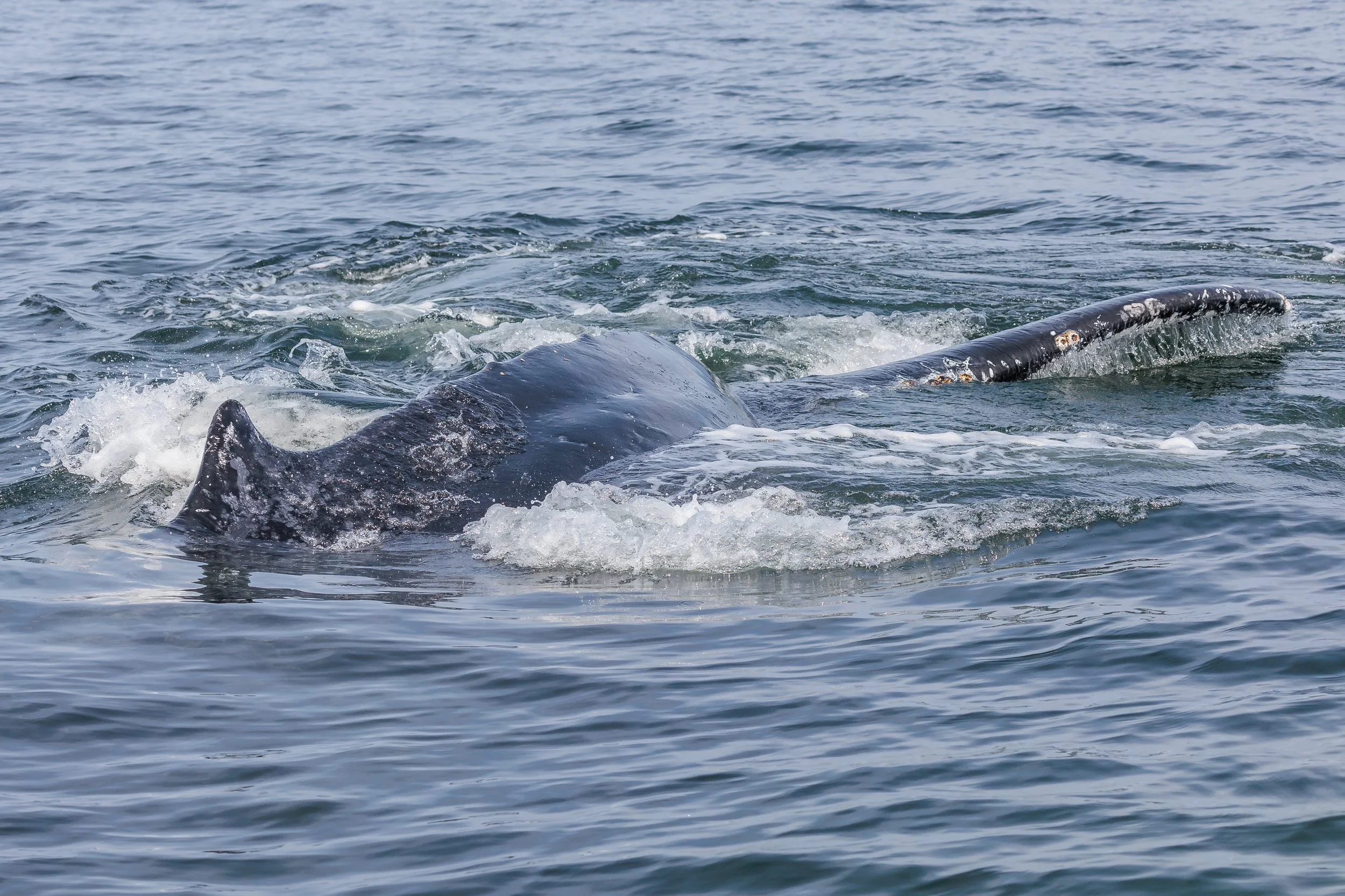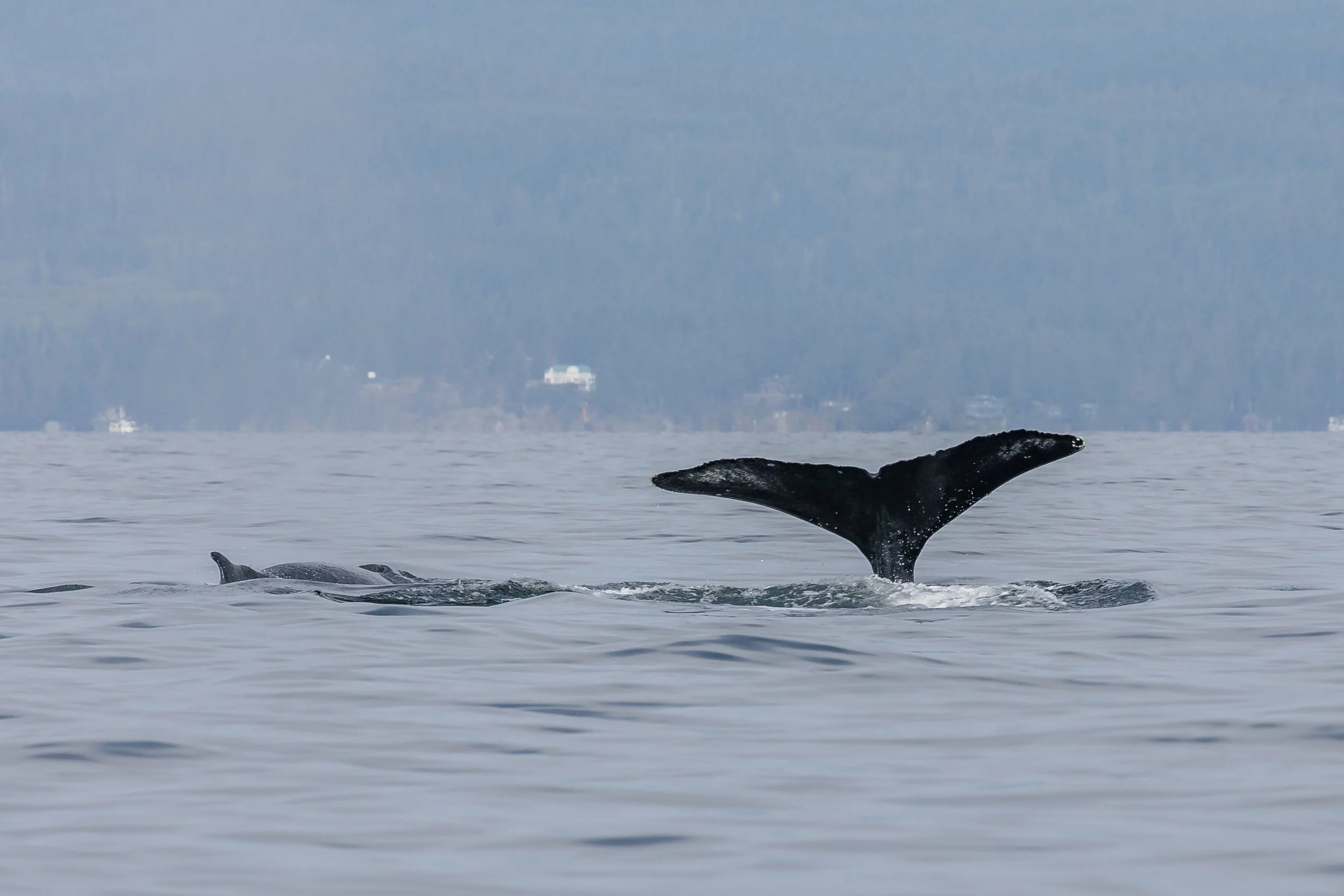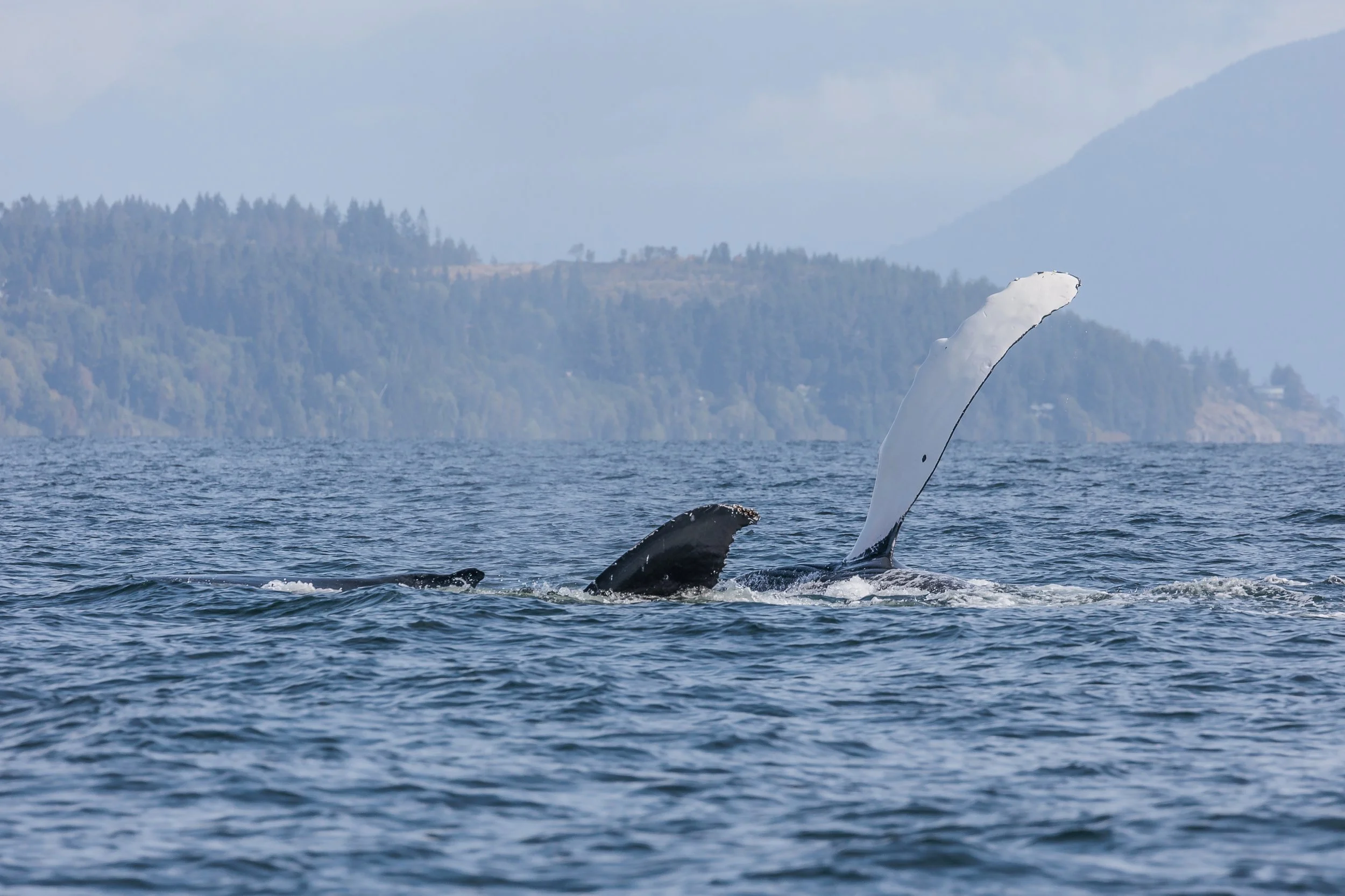 Two Spot’s white tail fluke behind another’s rostrum. Photo by Vanessa Vereschahen.