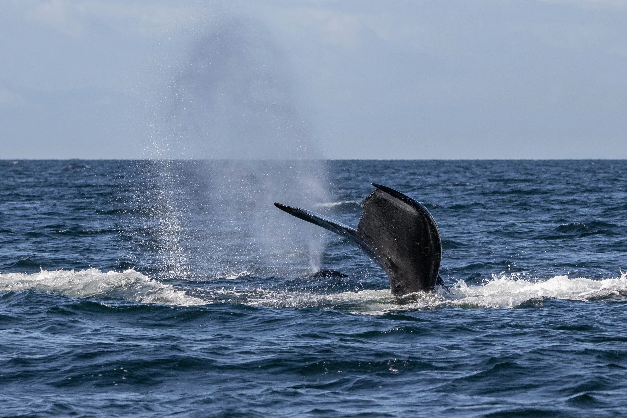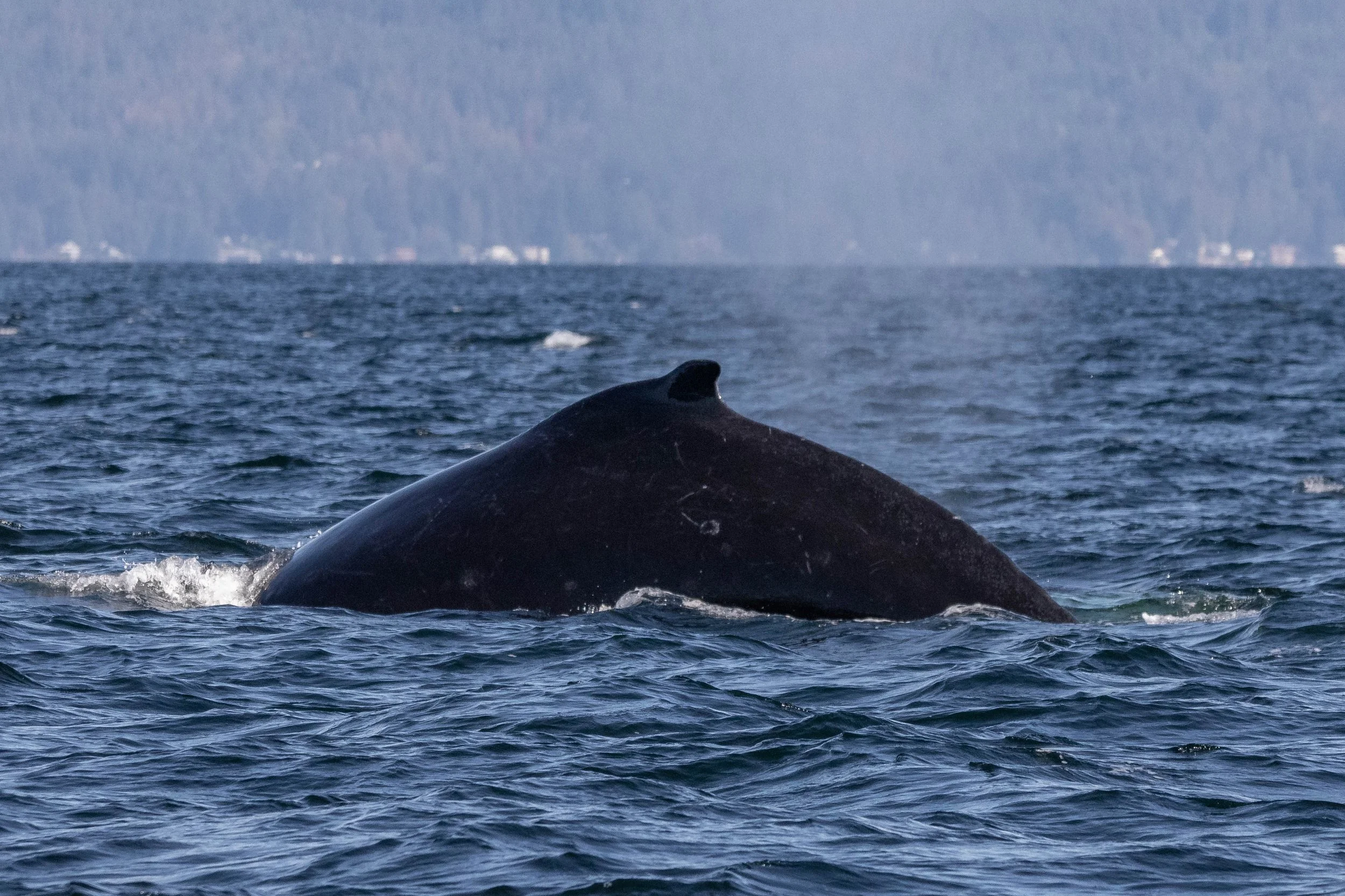 As we watched from a respectful distance, Chinook treated us to a tail flick—an energetic movement that sent a spray of water into the air, much to the delight of everyone on board. Then, something even more exciting happened: humpback poop! Now, while this might not sound like the highlight of a whale-watching trip, it's actually a fantastic sign. Whale defecation is a key part of the marine ecosystem, as it releases nutrients that support plankton, the base of the ocean food web. Chinook’s and Graphite’s well-fed appearance, along with the presence of whale poop, suggested that they were both thriving in these nutrient-rich waters.