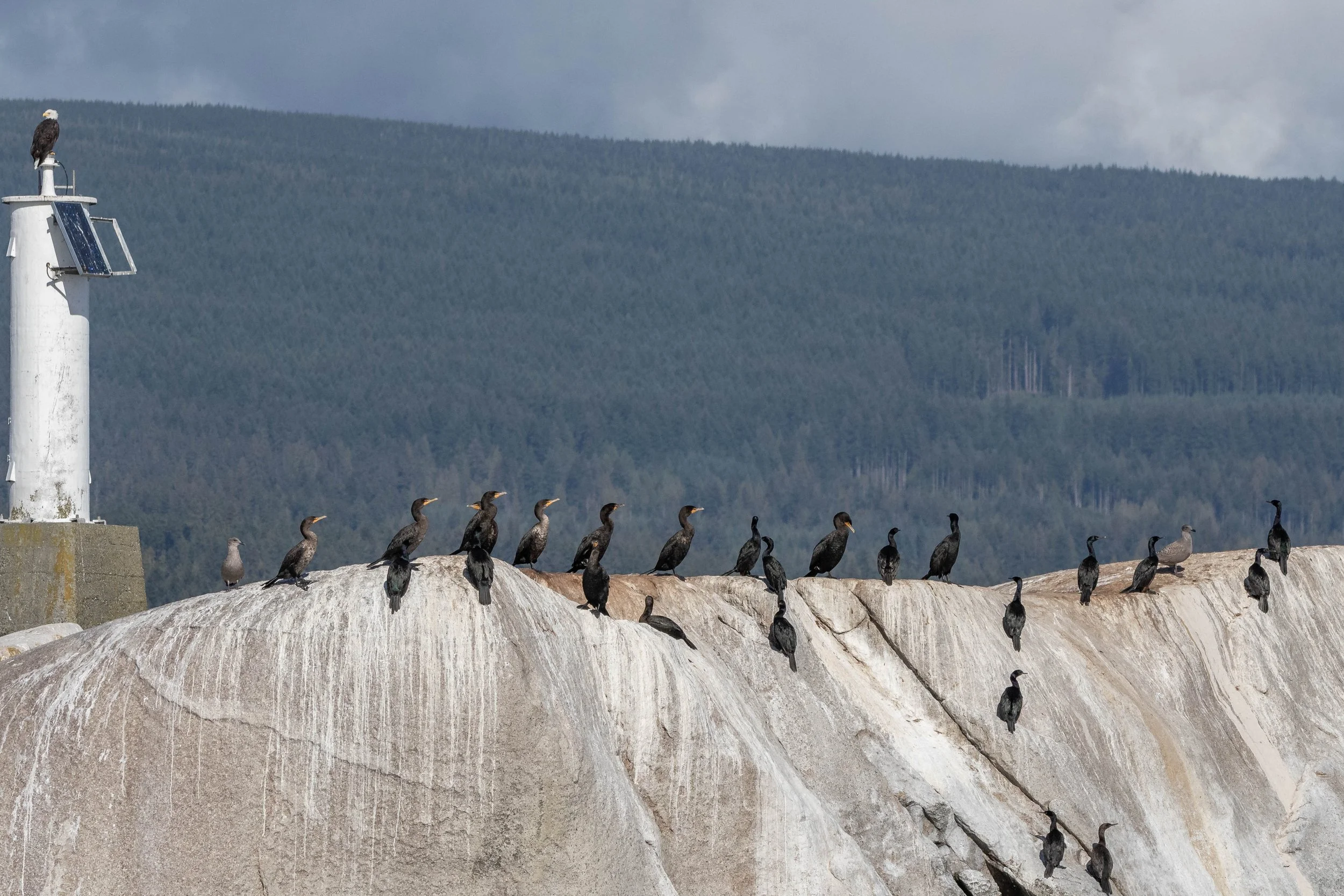 No trip through the Strait of Georgia would be complete without a visit to the White Islets, where the local pinnipeds love to hang out. Steller Sea Lions lounged on the rocky outcrops, while Harbour Seals basked nearby, perfectly content in the midday sun. The air was filled with the calls of cormorants, and to top it off, a Bald Eagle perched on the islets marker, a powerful symbol of the wilderness we were surrounded by. It’s moments like these that remind us how truly interconnected this ecosystem is—from the smallest shorebirds to the largest whales, each species plays its part.