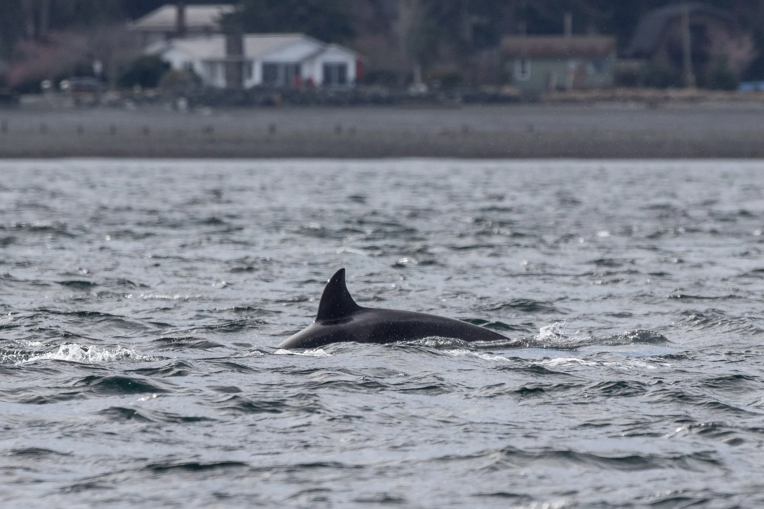 T034 Grace’s dorsal fin with the exhale of one of her kids behind her.