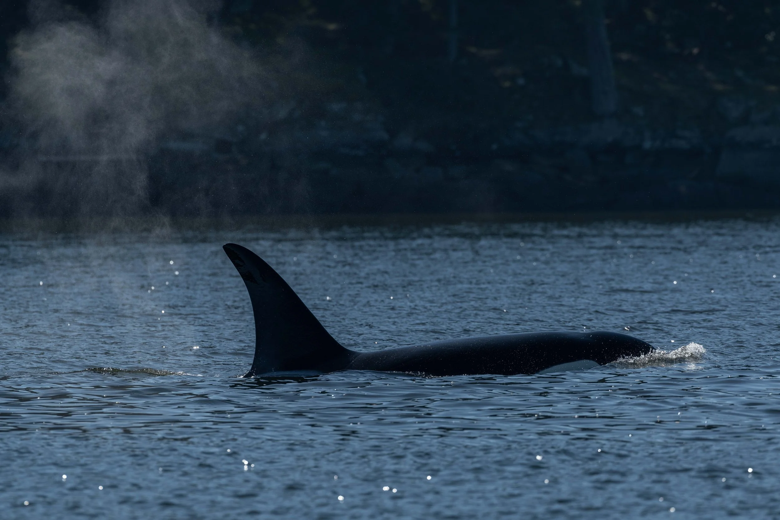 It didn’t take us long to find what we were looking for, the large, black dorsal fins of the orca along with the spray of their blows caught the eye of the captain as they travelled. As we slowed and approached closer, it was easy to tell which group we had here; it was the T049As! This group of 6 is well known by us, and admittedly a company favourite. The members of the pod are: