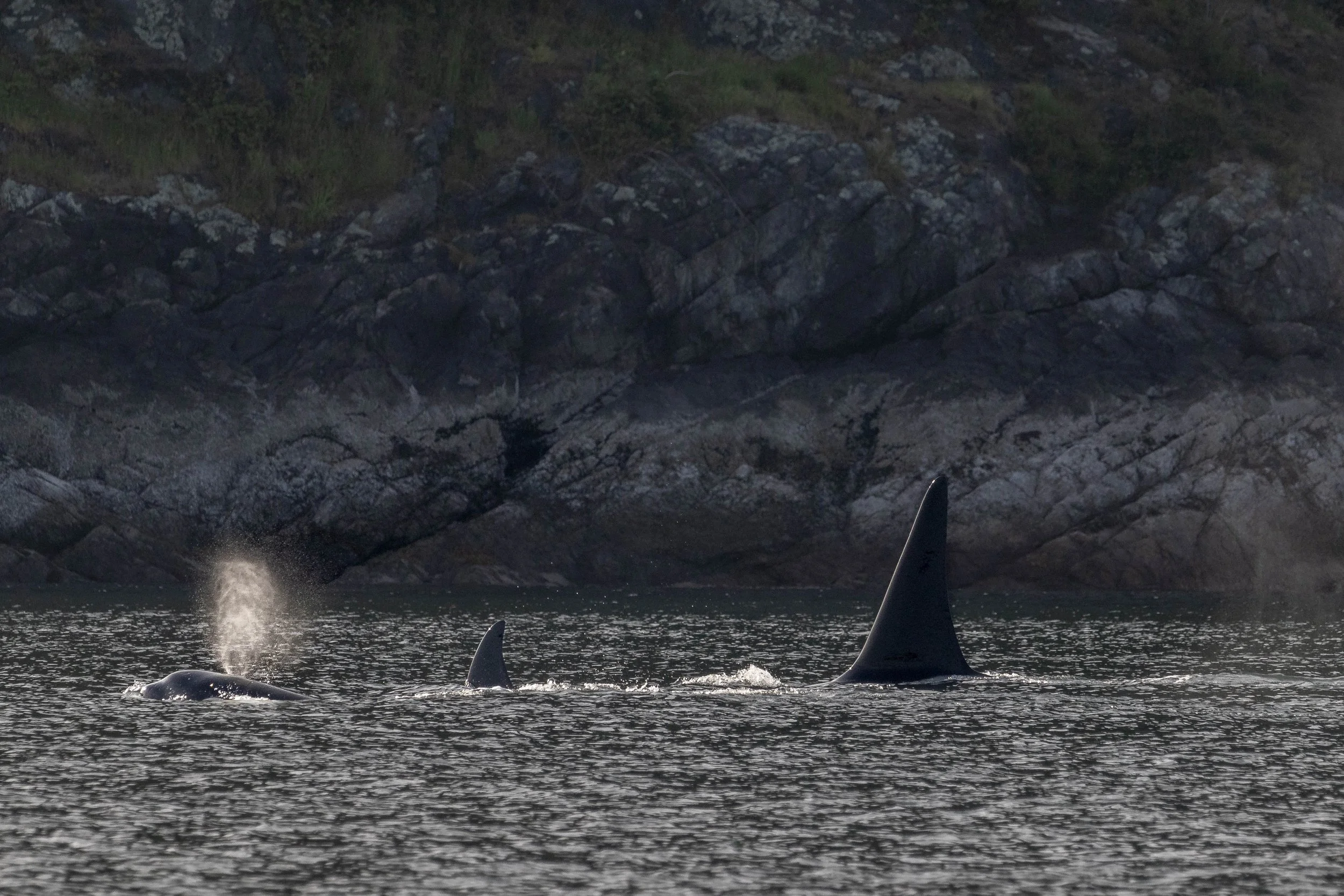 The backlit blows of the orca were beautiful to watch during our time with them, but soon our hour was up and we left them, continuing back toward Nanaimo. Along the way, we got word that there was a baleen whale close to home, so we decided to see if we could find it. Drinking in the sunset views we searched, seeing the Sea Lions and ships in the orange-tinged light. Just as we were giving up on the whale and thinking it was time to return to the Harbour, we spotted it; A blow! The heart shape it indicated that it was a gray whale, and soon its body came out of the water enough for us to confirm it. As the sun sank below the mountains we got a good look at this gray and then returned to Harbour.