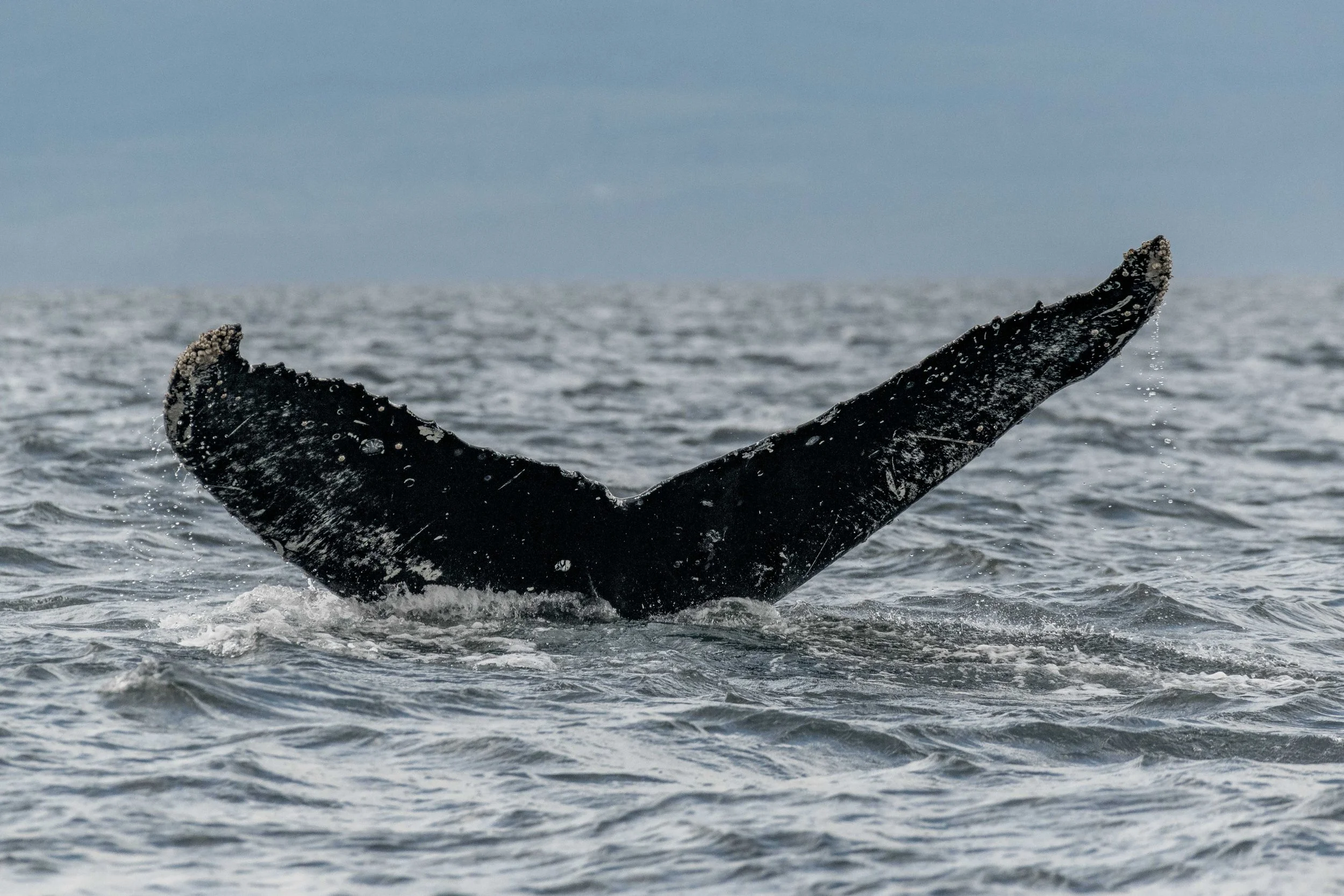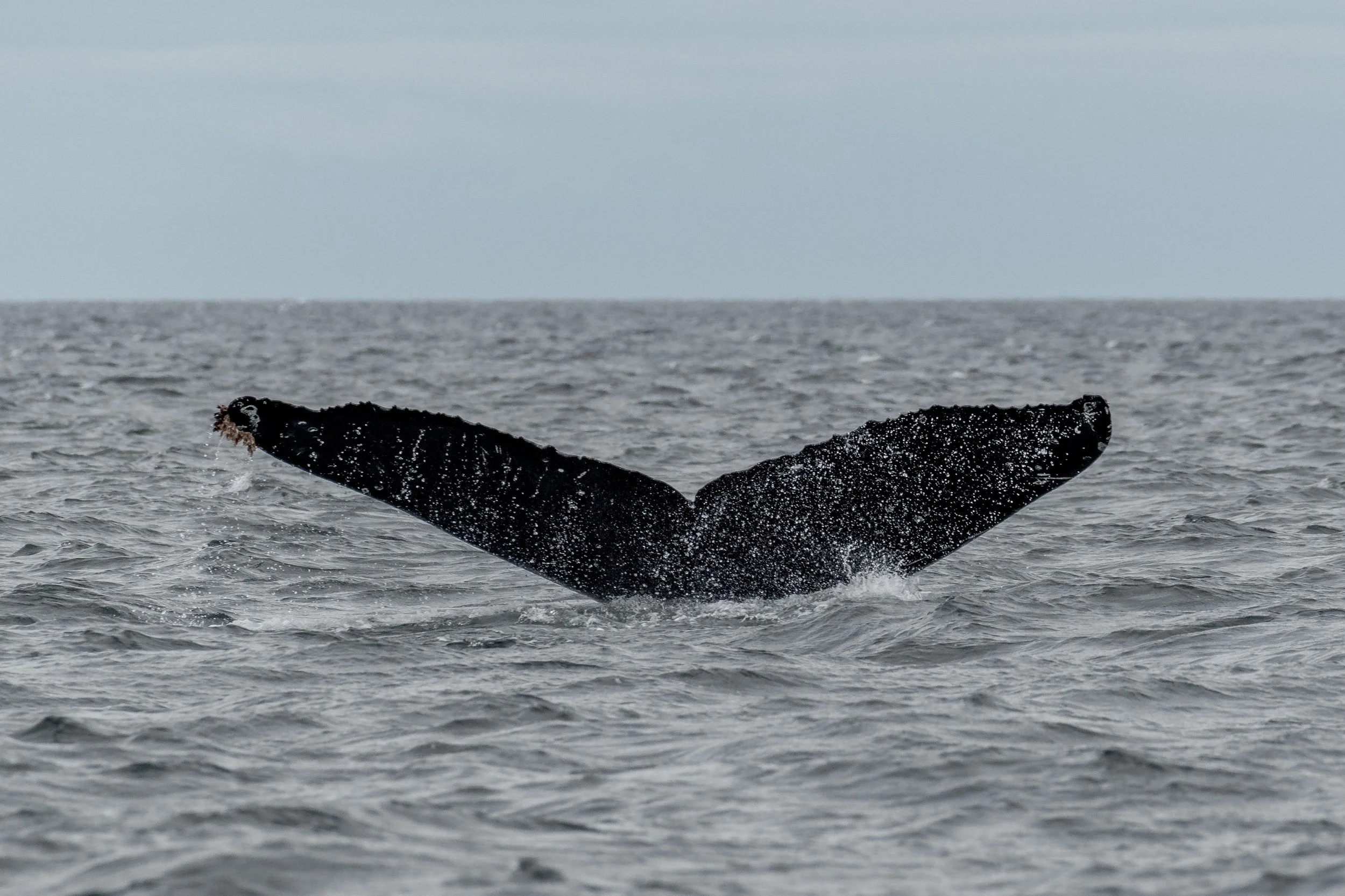 Leaving Wormhole and Wiggins to their feeding, we had one more pair of blows in the distance that we wanted to investigate! This pair of whales was Seabird (BCX1774) and Spock (BCY1134) travelling in the same area, but not associating like the other whales had been. Seabird was resting at the surface, while Spock seemed to be going for feeding dives, lifting their beautiful tail up into the air. While all whales are beautiful to look at, some capture a special place in our minds, and Spock held that place today. With high flukes, a lovely pattern on the underside, and a very unique dorsal fin, Spock is a fantastic humpback whale.