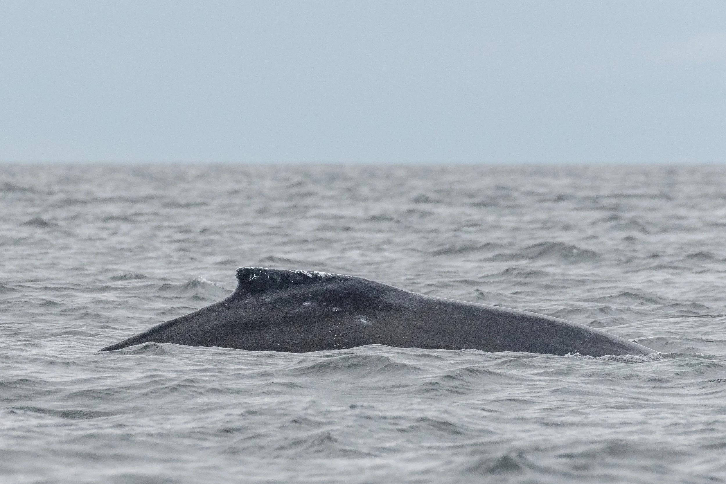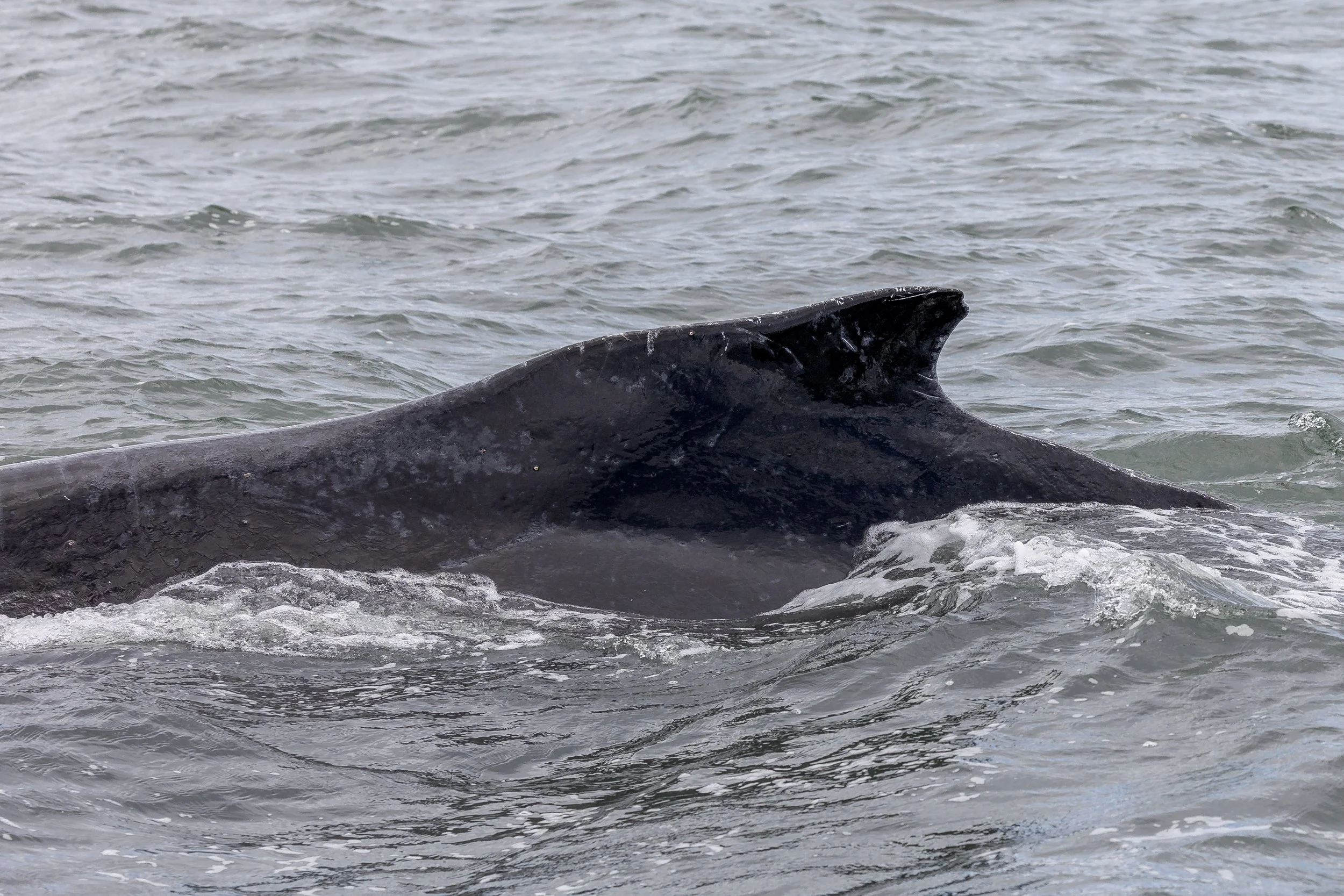 Finally, it was time to head back to Nanaimo, but wait, there’s more! With a very late report of a humpback whale heading towards Dodd Narrows, one of our crew couldn’t resist and went to get an idea of who this humpback was. It seemed to be feeding in the current created by the tide in Dodd, and lucky for us that meant they showed us their tail. Given the tail and a very unique shape to their dorsal fin, we were able to tell this whale was the 2022 calf of BCX1710! We only stayed for a couple surfaces before returning to Nanaimo. What an amazing day!