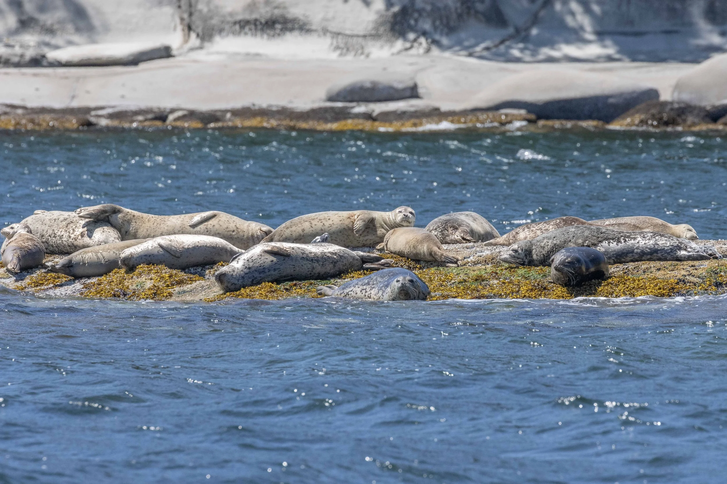 There were also some Harbour Seals that were sunning themselves on the nearby rocks. Due to their small size, they need to pull themselves up off the rocks for around half of the day to maintain their body temperatures in our cold water environment. Inside the protection of the Islands, the surface temperature can get warmer, but deeper where these seals spend more of their time it can be quite cold. Water generally acts as a heat sink as well, pulling more energy from whatever animal is in it down since it takes so much to warm up the surrounding water!