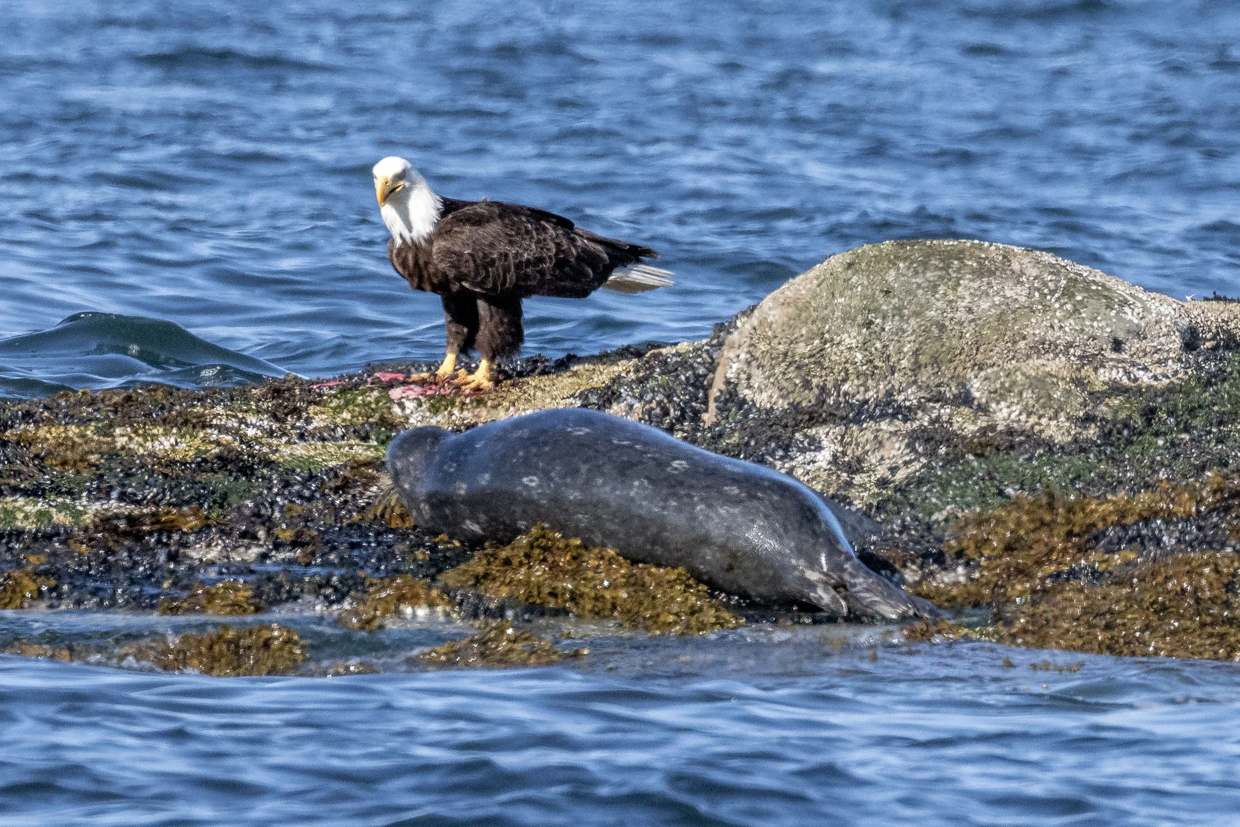 A Bald Eagle and a Harbour seal. Photo by Vanessa Vereschahen.