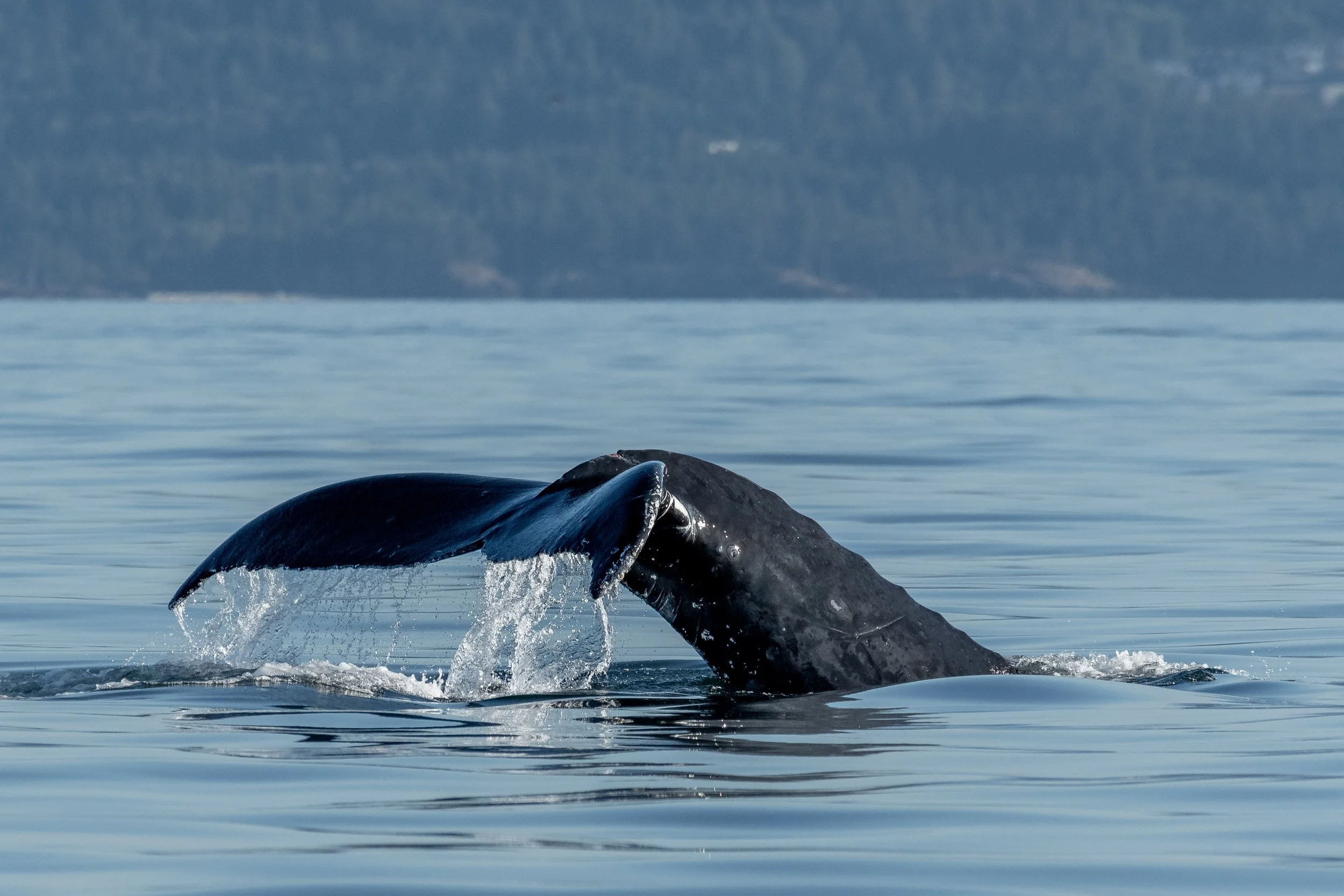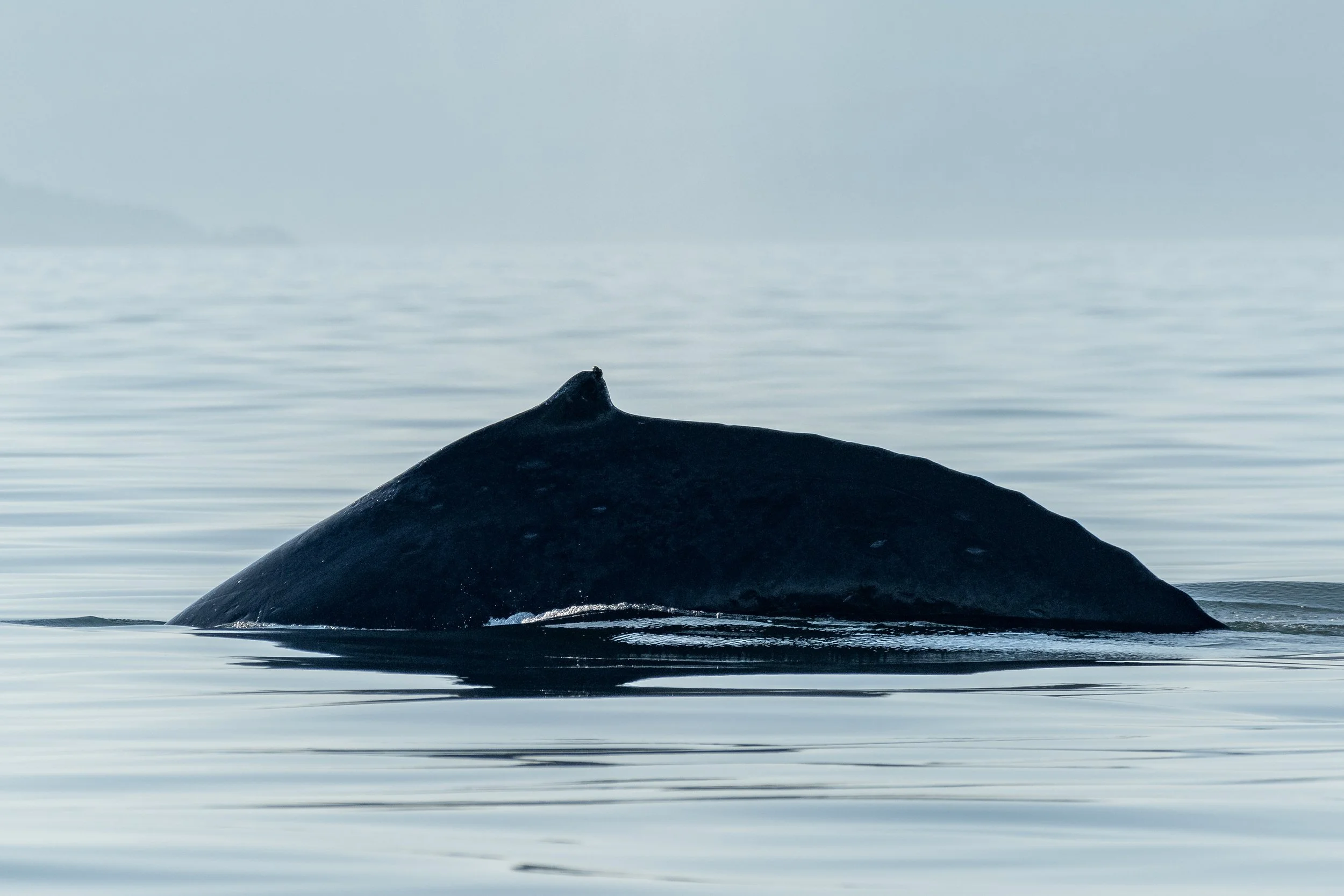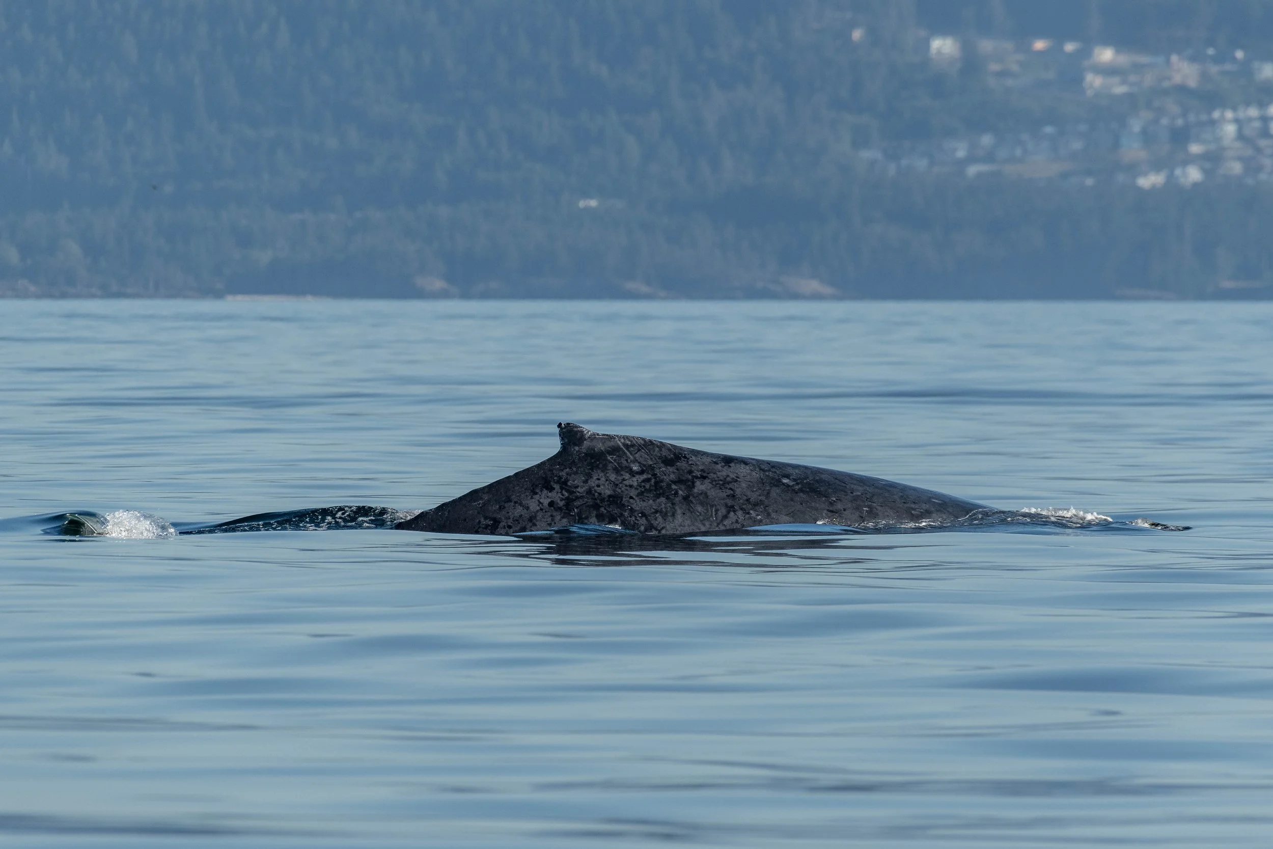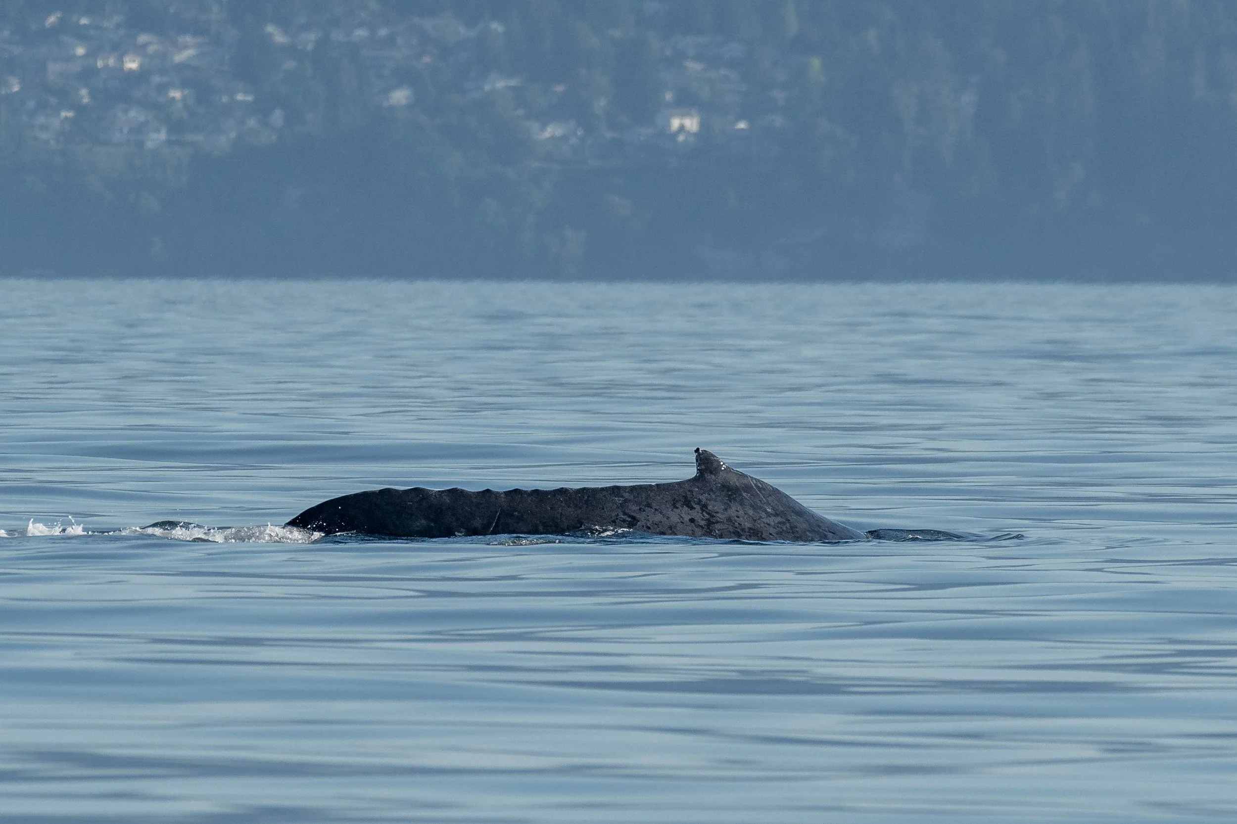 The sun was shining, and the morning wind had died down as we left the harbour in search of whales. We made our way into the Georgia Strait, where we often have success when looking for our giant friends. Today was no different, as we soon found a humpback! This big guy was being a little shy, and didn’t show us their fluke while we were with them. We often use the ventral side of the fluke to identify individual humpbacks. Flukes can range from all black to all white and each tail will have different scratches, scars and markings. Each fluke is as unique as a fingerprint! Occasionally, we can also often use a humpback dorsal fin as a way to identify the individual animal. While the differences aren’t always as dramatic on the dorsal as the differences on the fluke, they still exist. Unfortunately, our first whale of the day still remains a mystery to us, having not fluked and having a very non-descript dorsal fin. We’ll continue to try and ID our little mystery whale, and update here if found!