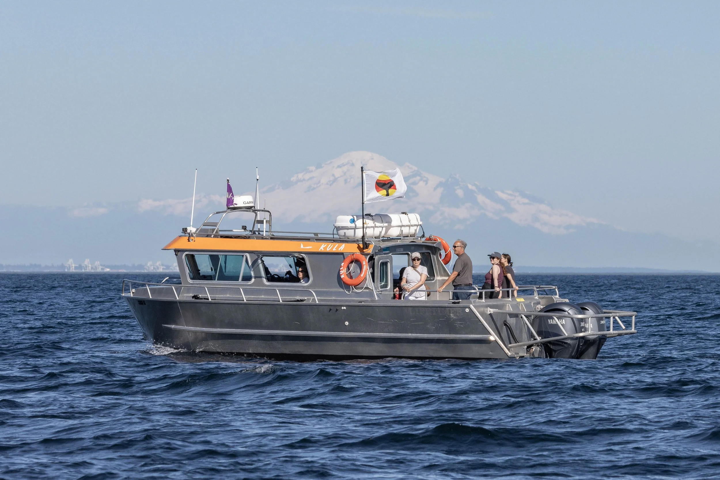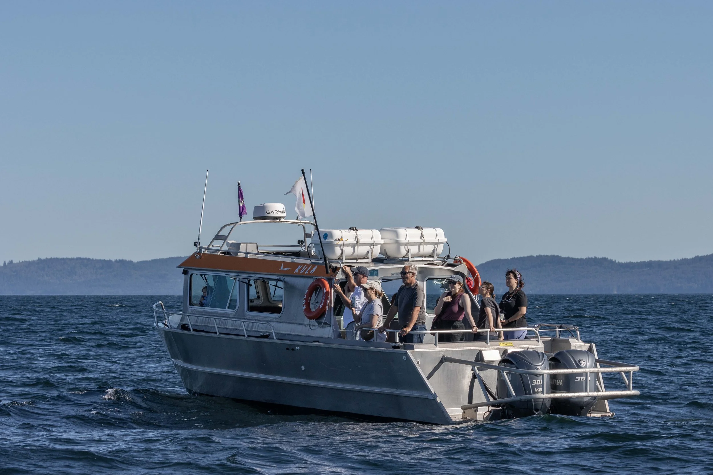 Guests on our semi-covered vessel Kula. Naturalist Val Watson is on the far right. Photo by Hayleigh Hilbert.
