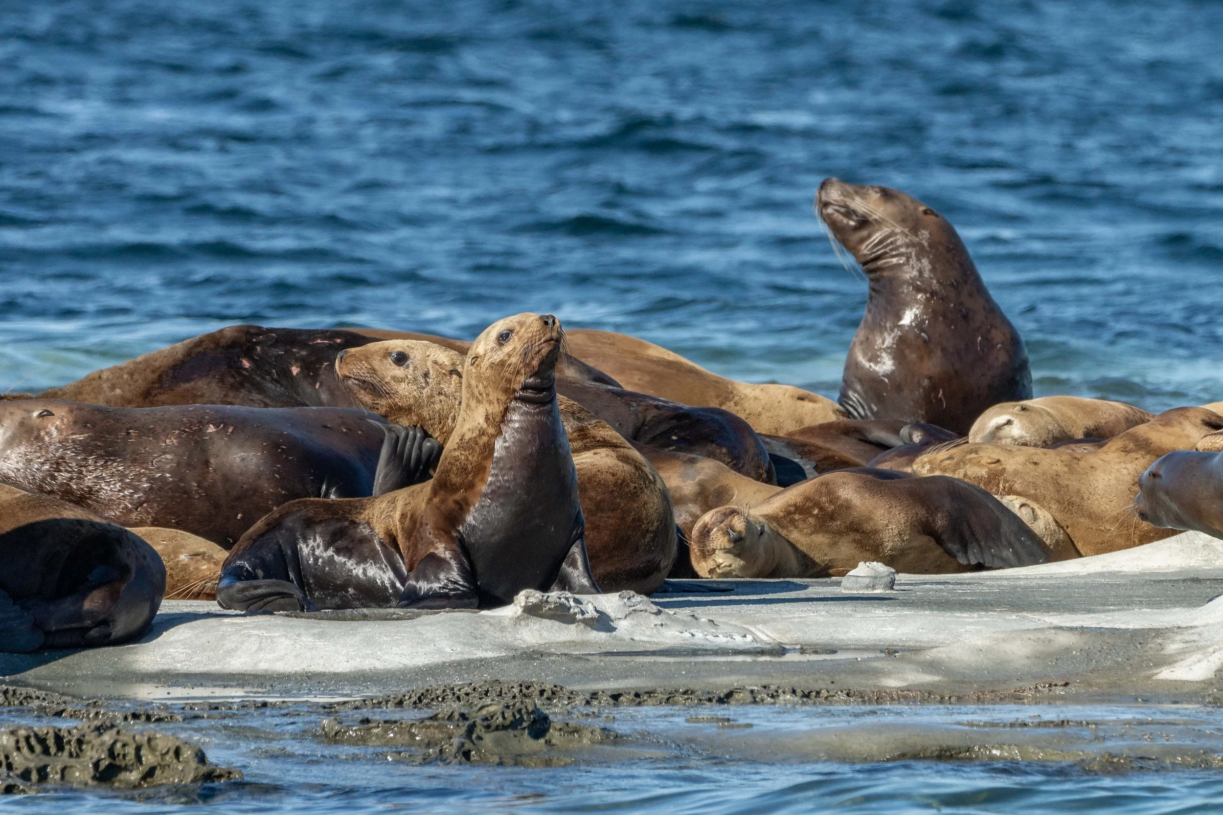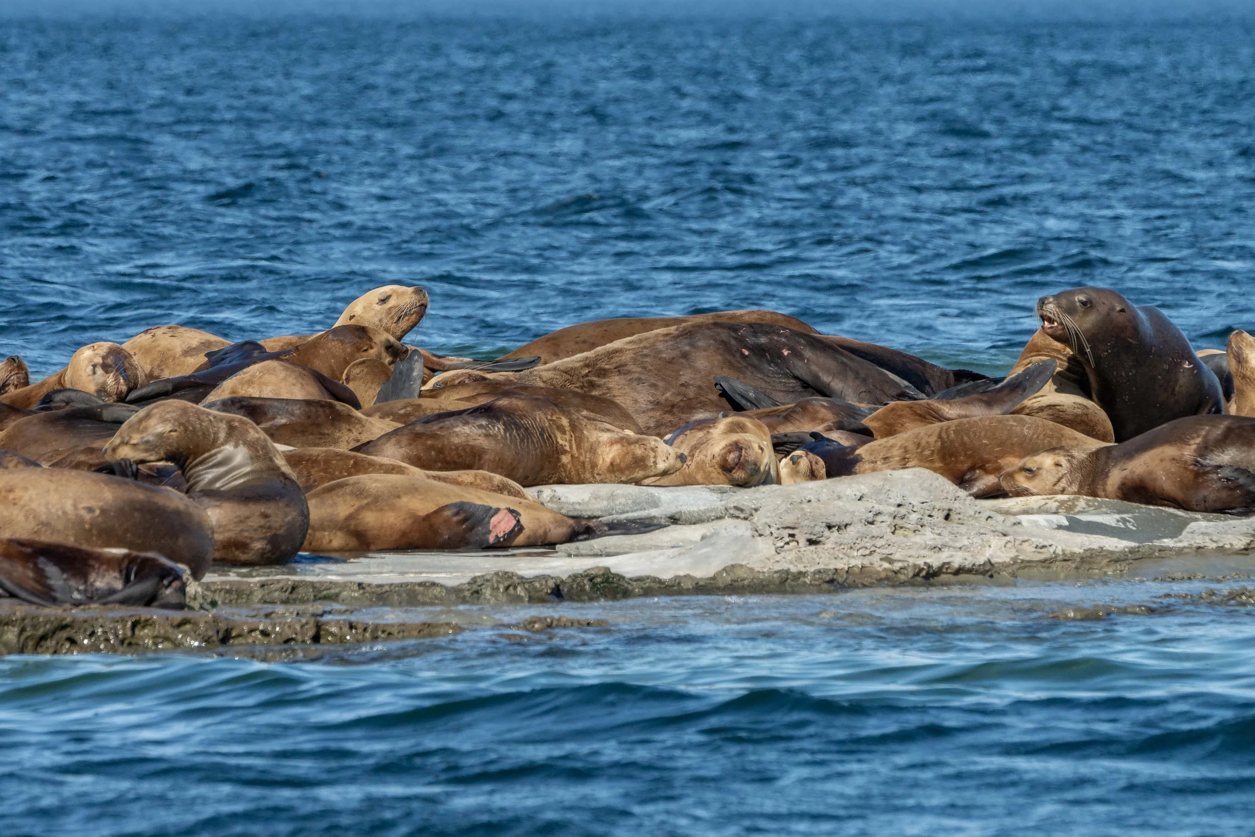 So many Sea Lions! One looks like it got in a fight. Photo by Val Watson.