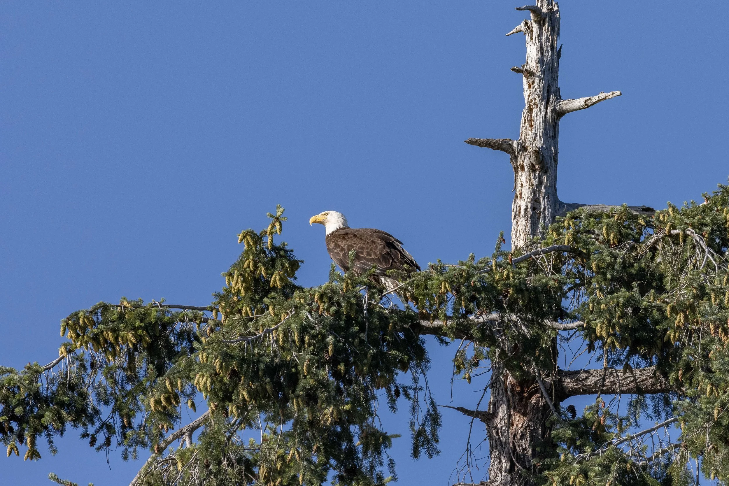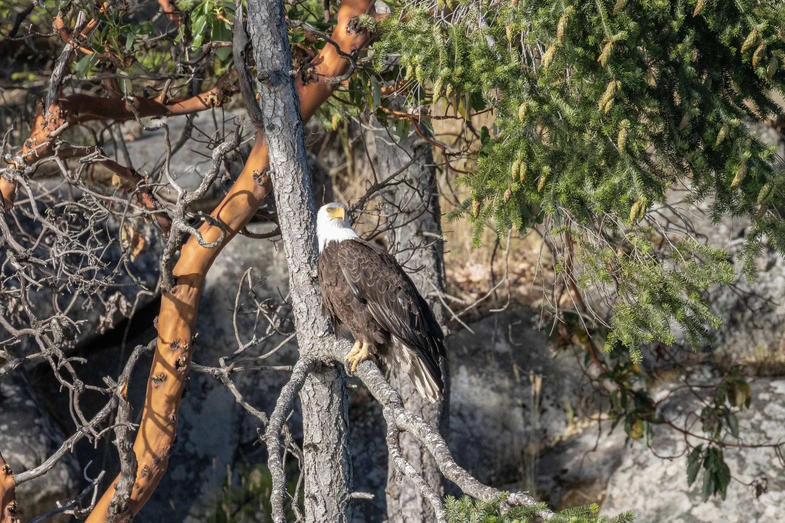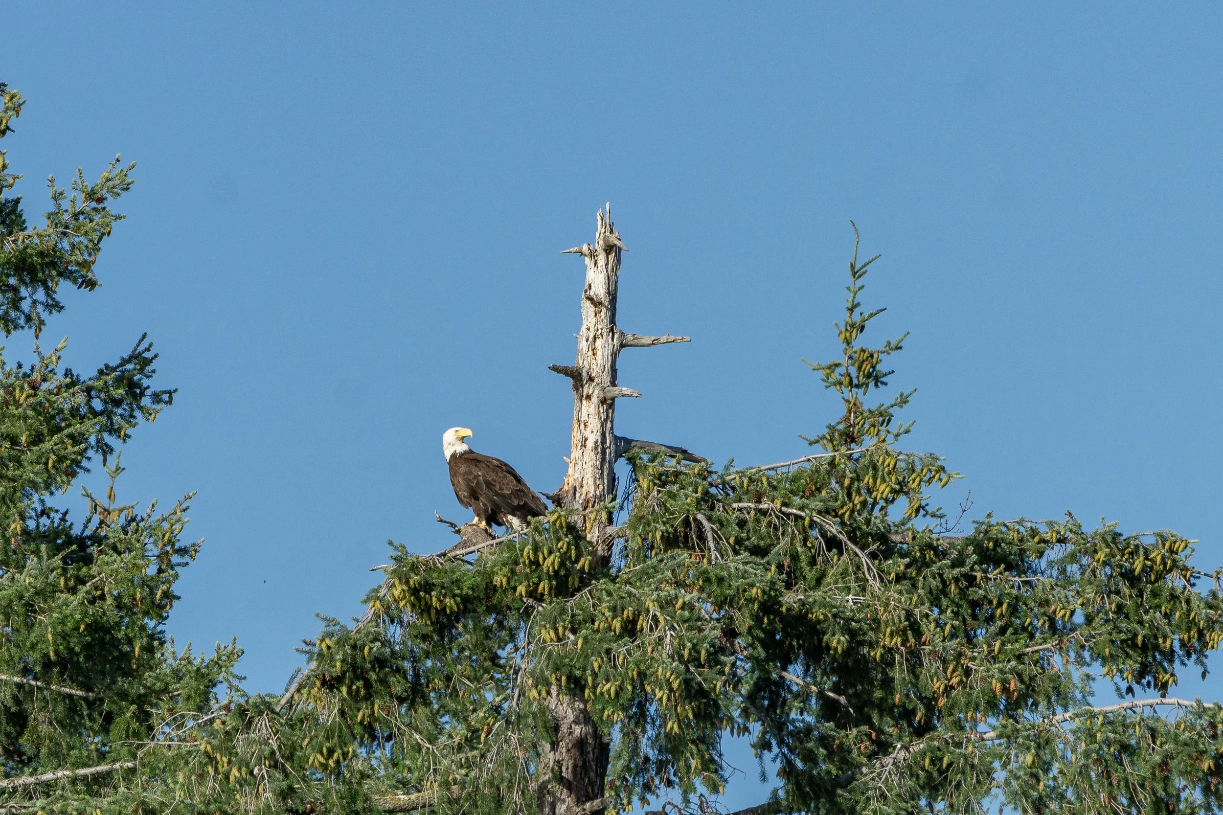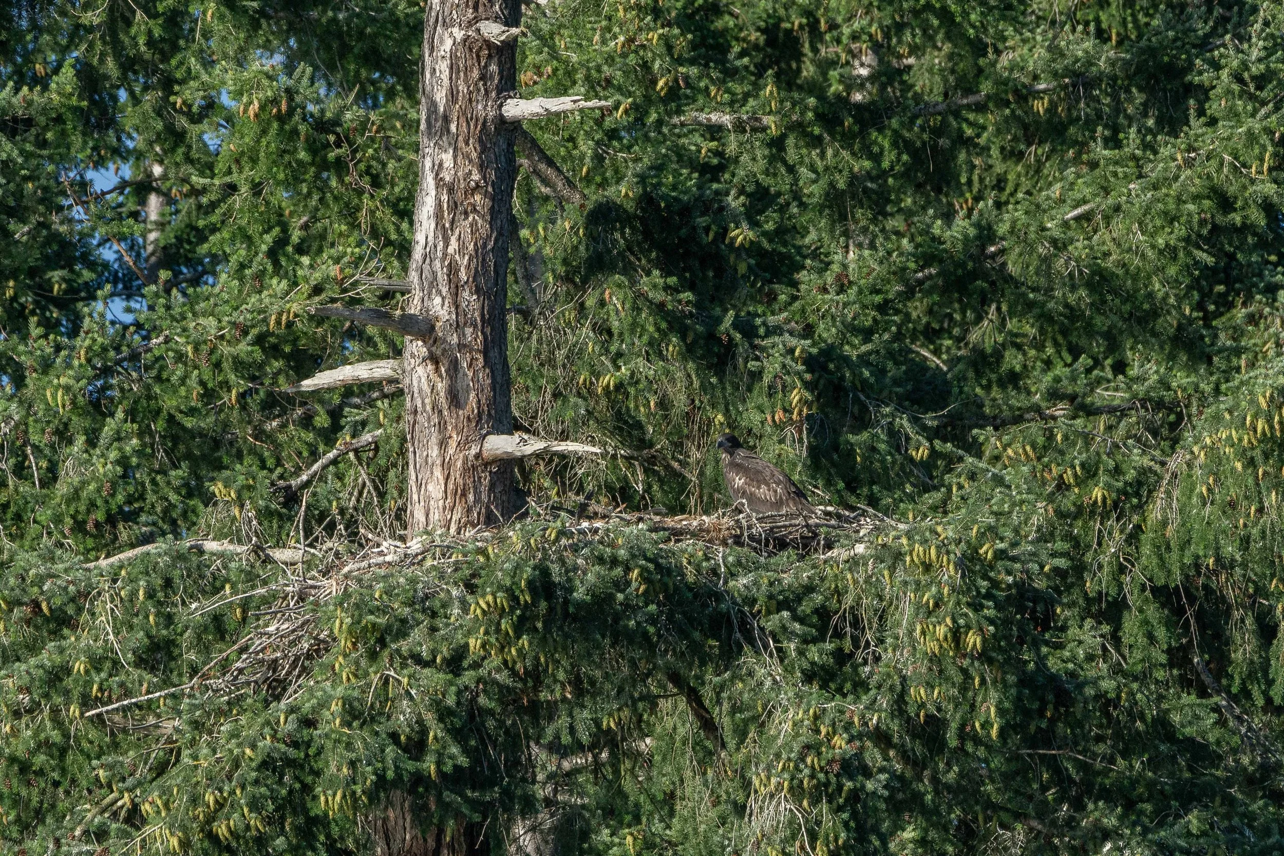 We had one last stop as we neared the end of our tour. There is a nest in the treetops along Gabriola Island that belongs to a pair of Bald Eagles. Bald Eagles mate for life, and it seems that this pair are very successful. We have been watching them during the summers for the last couple of years and each year they have successfully raised at least one chick. This year there is just a single eaglet that we gave the nickname Greyson, since when we first got his photo he was still fluffy and grey with down feathers. He has since grown out of that phase and is looking more like an adult, save for the white head and tail. They won’t have that iconic look until they are 5 years old and will stay mostly brown until that time. Greyson has quite a bit of growing to do, we can’t wait to see how he progresses!