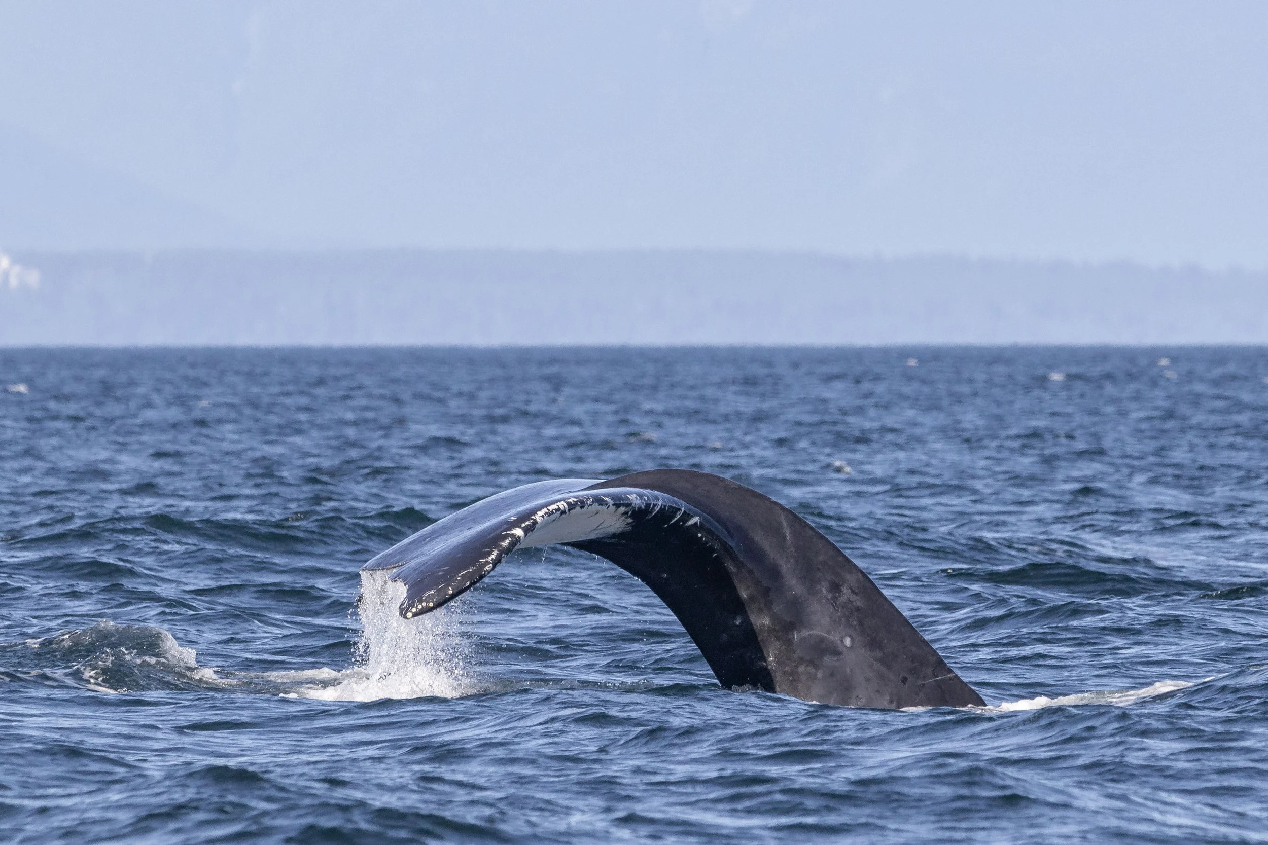 We once again had three boats leaving Nanaimo to search the Salish Sea in the afternoon of the 5th. Having three boats out is great since it means we can split up and cover more area in the search. We did just that, with two of our boats going south and a third heading east over the top of Gabriola Island. One of the southern boats went out into the Strait of Georgia via Gabriola Pass, while the other went further south towards Porlier Pass. We searched all of these areas, hoping to find a fin in the waves, and were rewarded when one boat spotted a white tail fluke sinking below the surface.