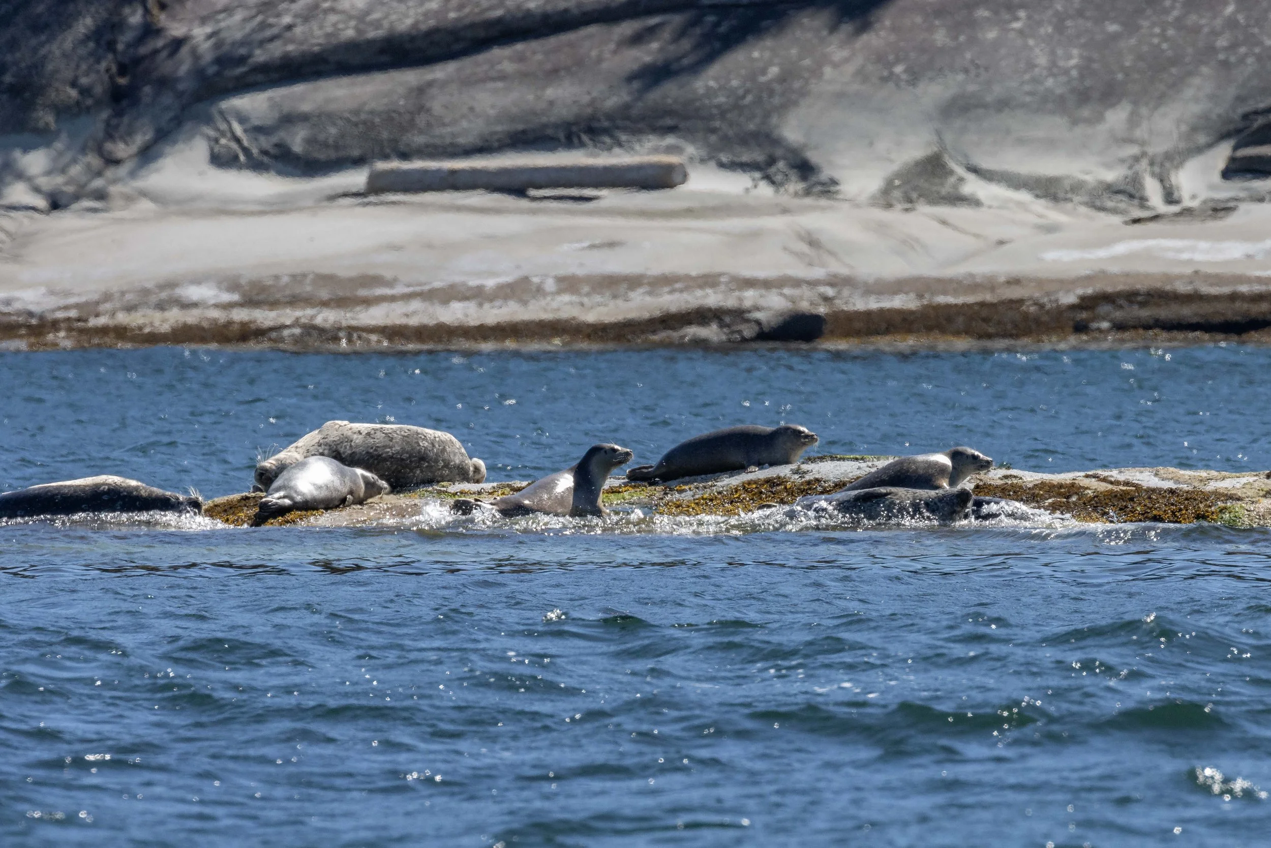 To minimize our impact on the wildlife we watch we try not to watch a whale for any longer than one hour, so it eventually came time to say goodbye to Neptune and head out to look for more wildlife. One of the other wildlife stops was at a little place we like to call Stinky Rocks. This is a favourite haul-out site of Steller Sea Lions and Harbour Seals! Both of these species are part of the Pinniped Family, meaning they are flipper-footed animals. There is quite a difference between these two species with the Sea Lions being much bigger (about 2-10x the size depending on sex) and much noisier! It’s rare to hear a peep from the Harbour Seals while you can hear the Sea Lions from half a mile away! Today there were also some black Oyster Catchers sharing the rocks with these marine mammals.