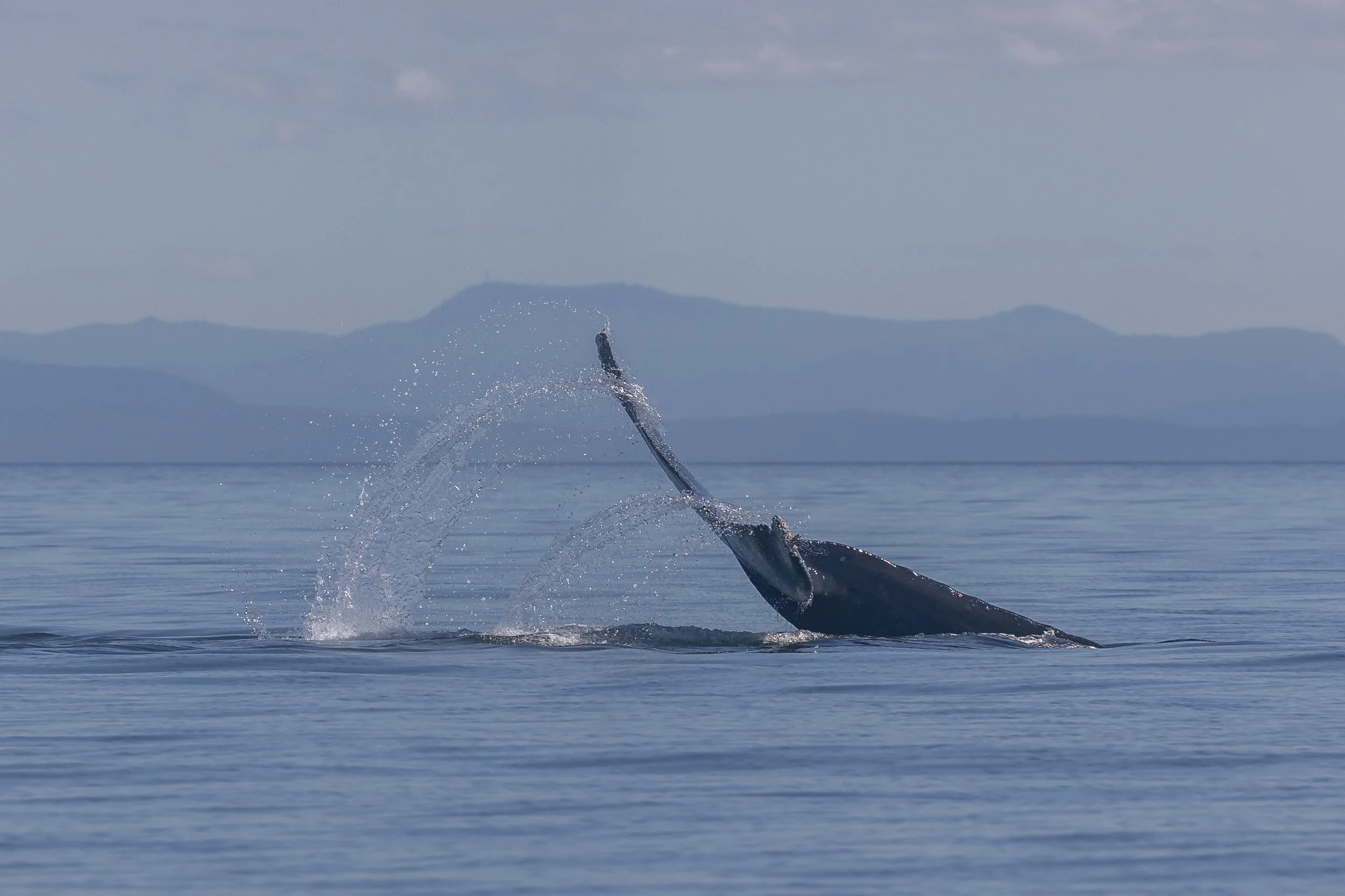 We stayed with these two for about an hour, before it was time to leave them to their surface activities and we headed out to see who else was in the area. It didn’t take long for us to find our next set of whales. This time it was what was usually expect to see from humpback pairs traditionally; a mom and a calf. These two were diving together, likely feeding on the clouds of Krill and fish that would be found in the area. Thanks to them lifting their tails for these dives we were quickly able to identify Tempest (BCX0837) and her 2024 calf. These two were super adorable to watch, given the size difference. Tempest has been recorded in our area since 2004, making her at least 20 years old and therefore fully grown. That means that she would be about 17 meters long and weigh up to 44 tonnes. That’s a big girl! Her calf would’ve nearly doubled in size since being born now thanks to Tempest’s very rich milk, with about 70% fat content. This amount of energy passing to the calf through milk means that Tempest has much higher energy requirements than other humpbacks not nursing, and would need to eat about 1.5 tons of food every day instead. We don’t often see mother humpbacks being too active at the surface because of these high requirements and instead most often see them feeding. The calves on the other hand have more energy to spare thanks to Tempest’s hard work so sometimes they will party while mom feeds. Today though, it seems like Tempest’s 2024 calf wanted to be a mini-me to their mother, diving and lifting their tail alongside mom. It was nearly the cutest thing we have ever seen! Even though they are so huge, babies of any size still capture our hearts.
