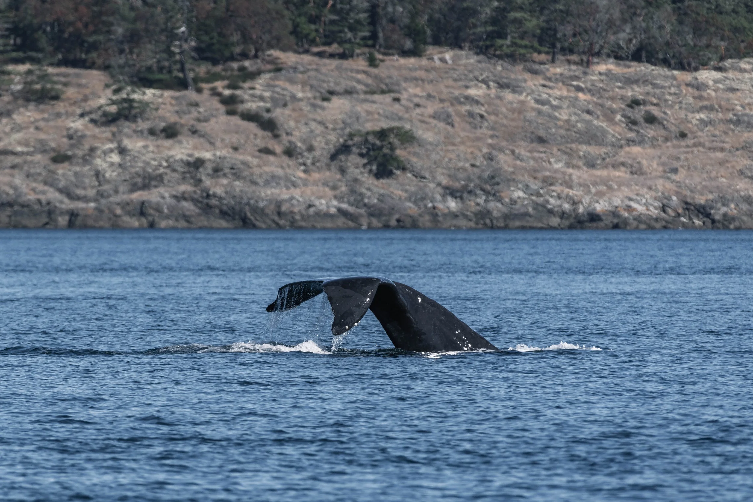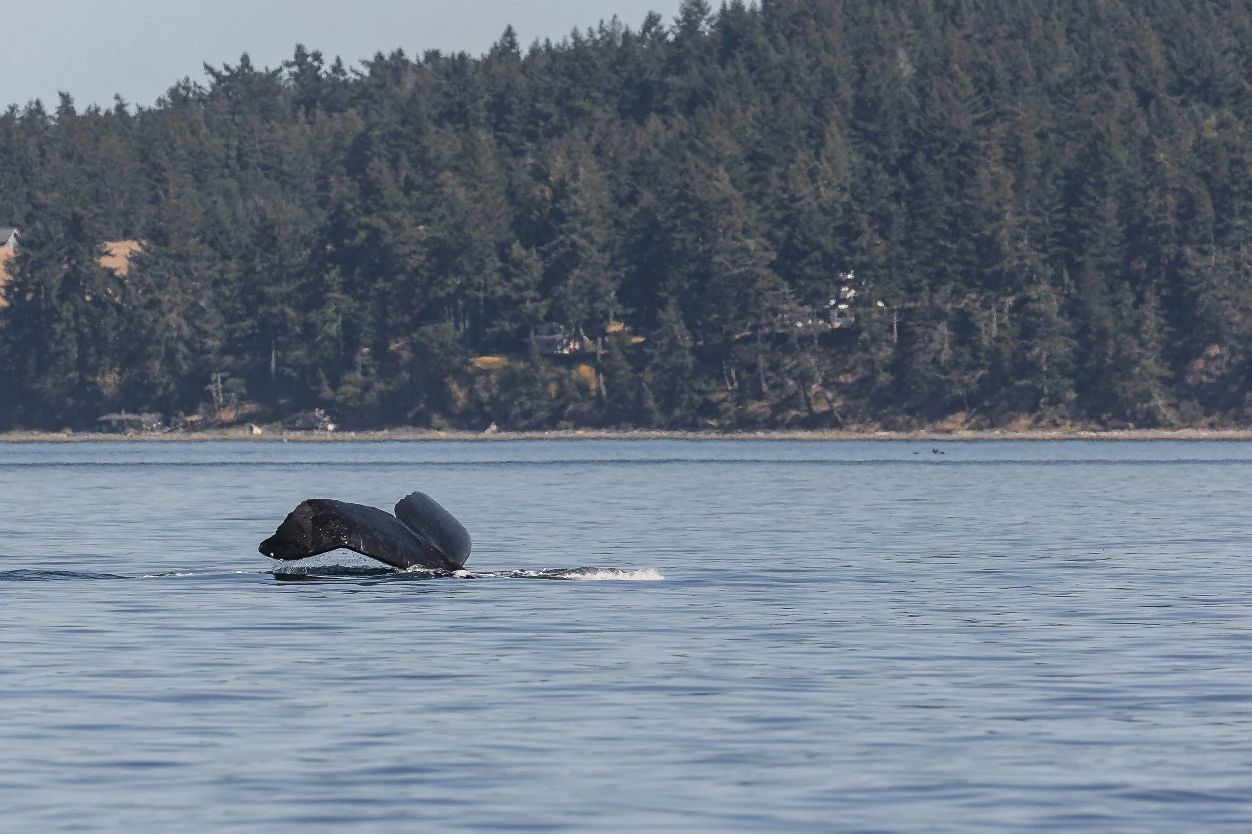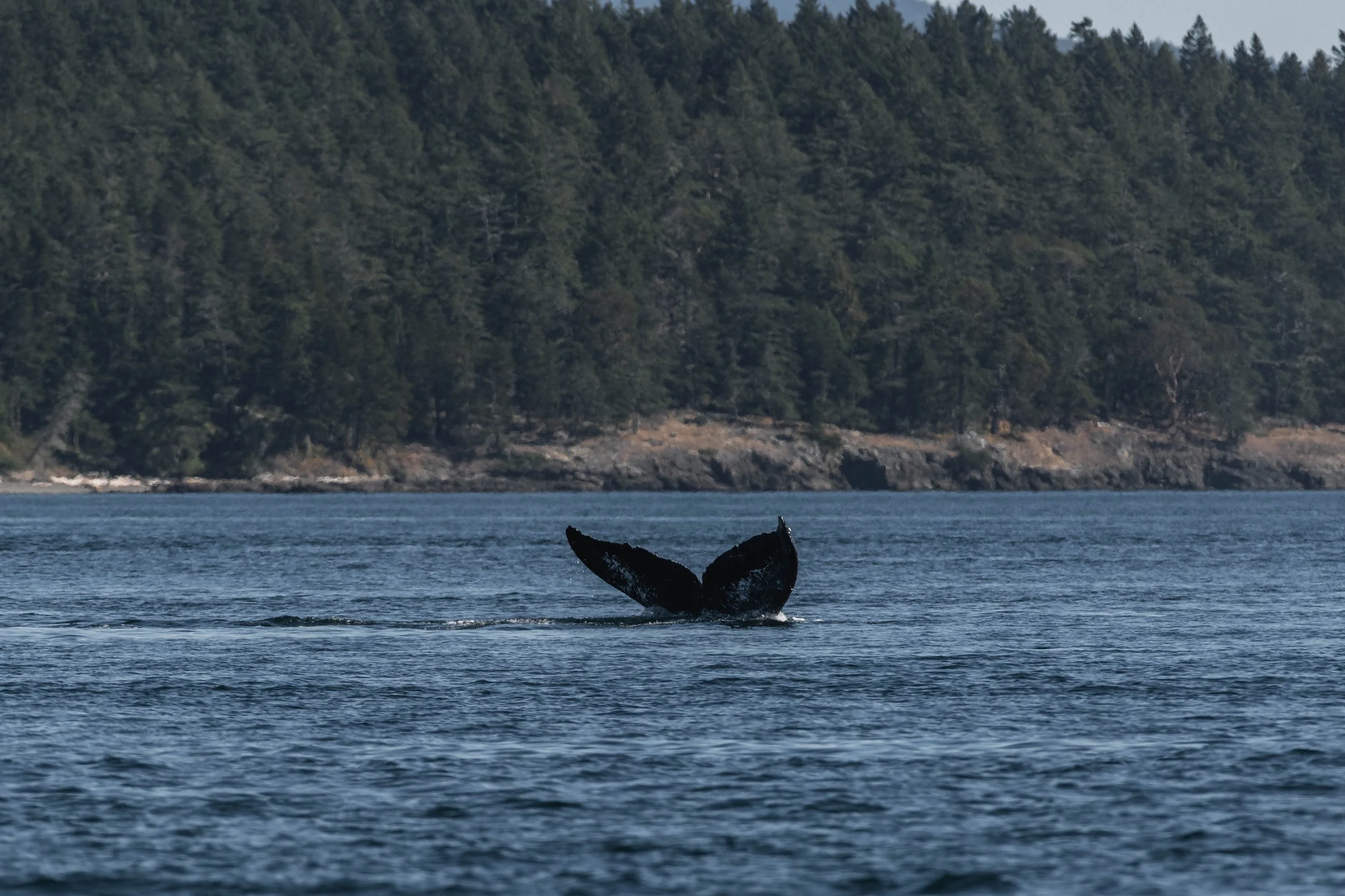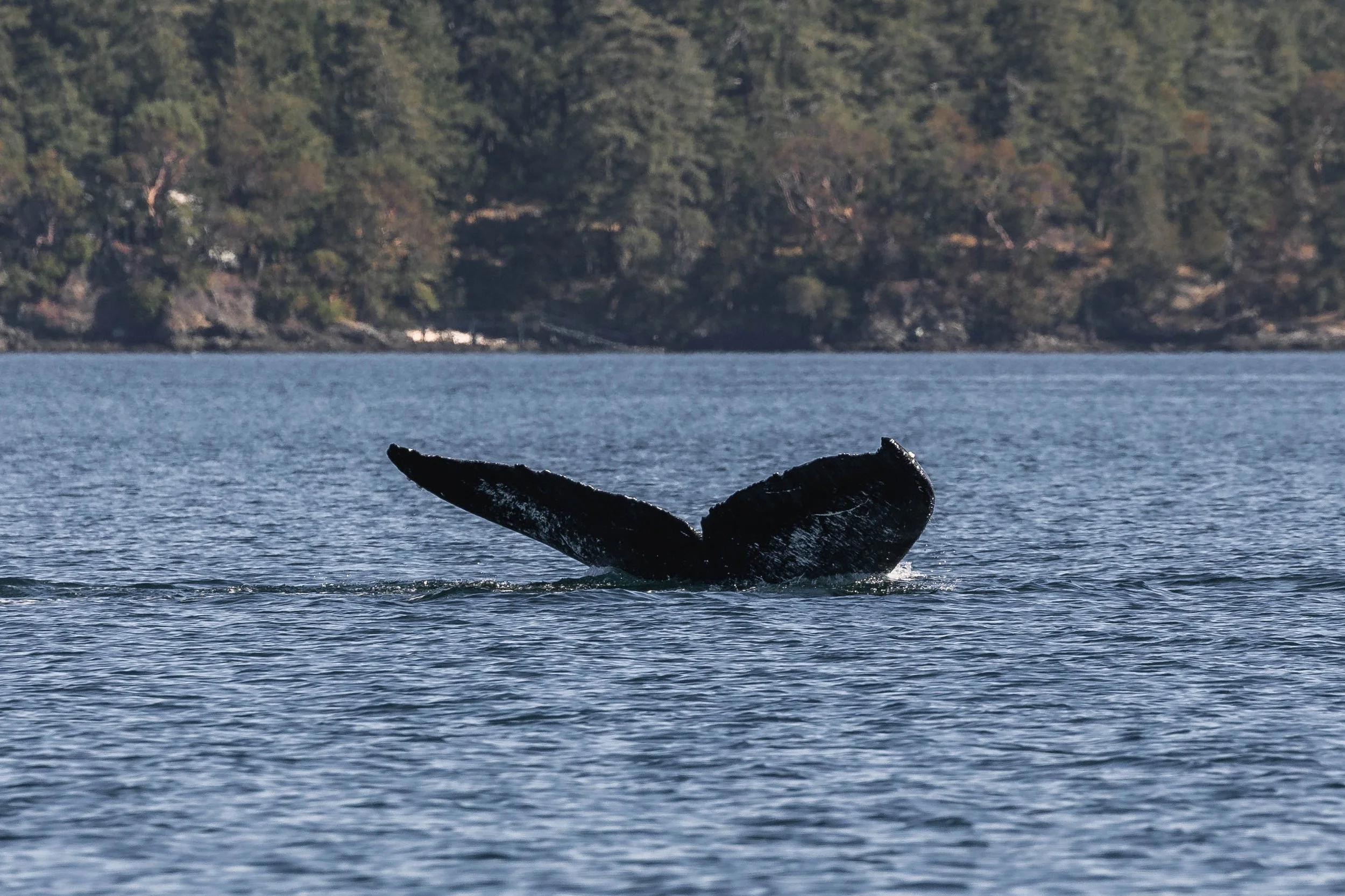 Beside them was Fallen Knight, another recognizable whale with a distinct fluke deformity. One of her tail flukes curves downward, earning her the nickname. It’s uncertain how this deformity came to be; it could be a congenital trait, a result of injury, or a birth defect, but it hasn’t slowed her down one bit. Watching the two whales travel side by side, surfacing and diving in perfect sync, was a humbling and peaceful experience. They seemed to guide us through the stunning backdrop of the San Juan Islands, surrounded by deep blue waters and emerald shorelines.