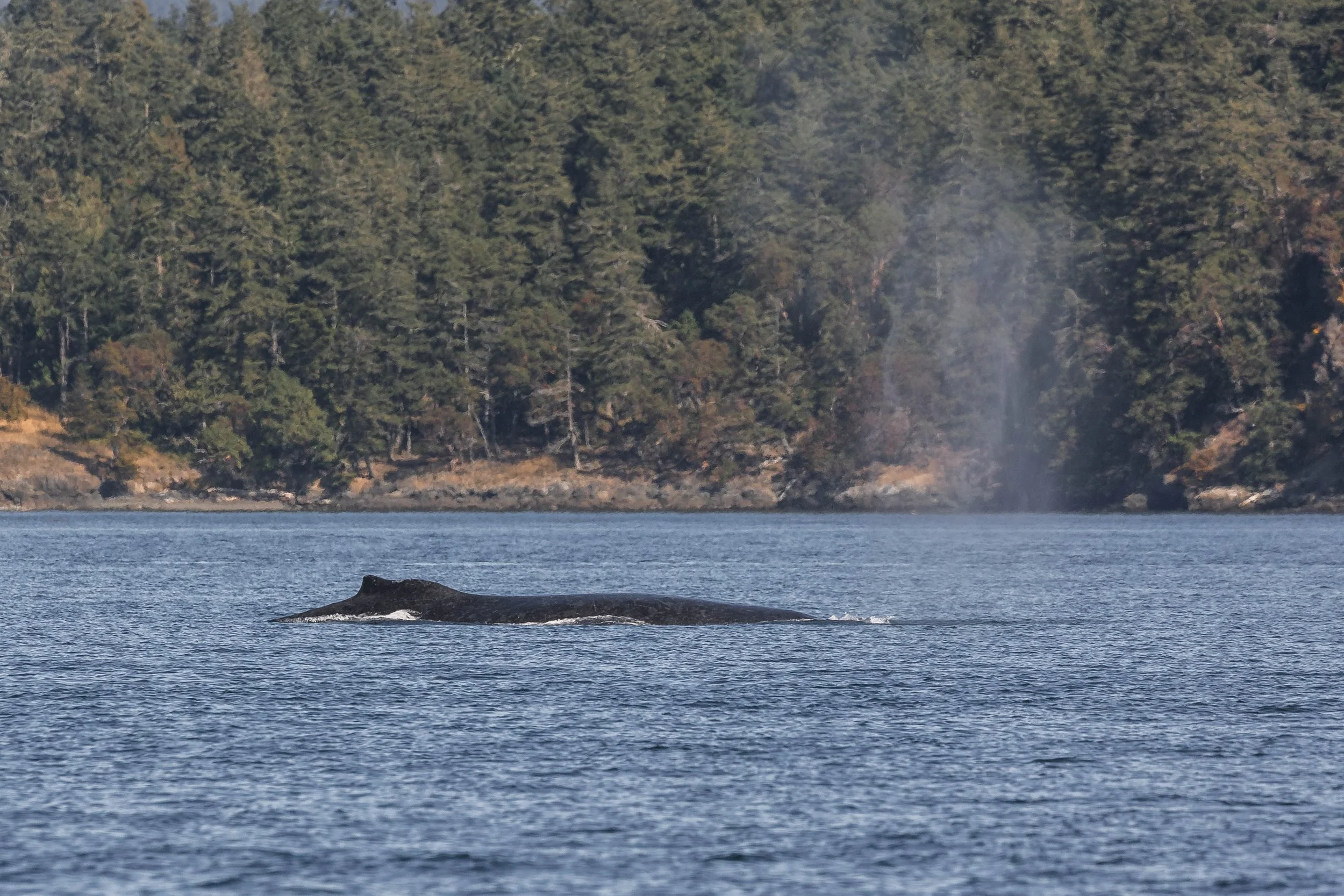 At first, things were quiet close to home. A few seabirds skimmed the surface, and the distant mountains mirrored perfectly in the water, making for a serene start to our journey. Reports had come in of whale blows seen from shore far to the south near the San Juan Islands, so we pointed our bows that way and hunkered down for a long but beautiful ride. The crew was excited; this part of our range isn’t one we visit often, and the Southern Gulf Islands always promise breathtaking scenery and surprises along the way.