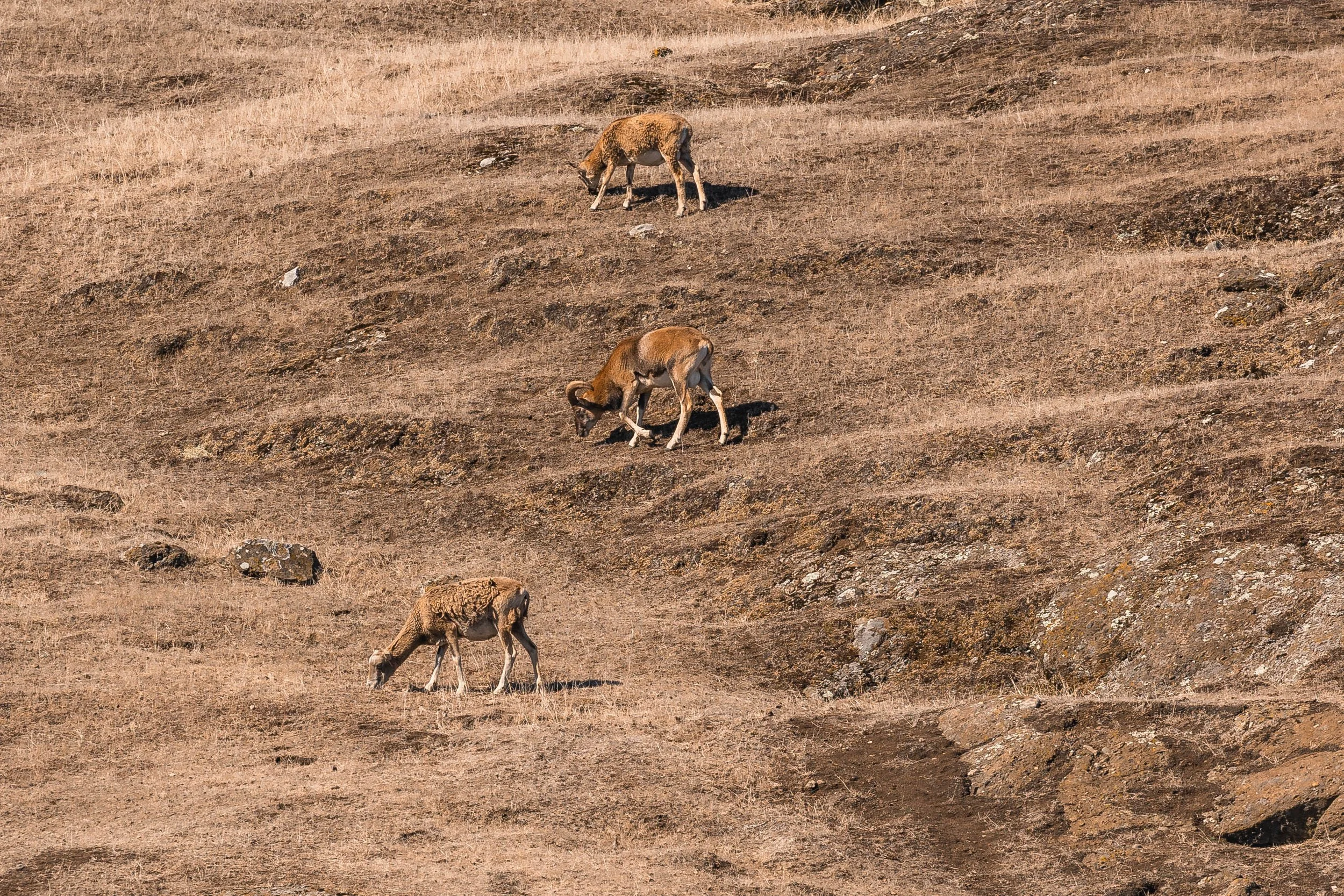 While watching their noisy antics, something unusual caught our eye high above them on the rocky mountainside, movement where we least expected it. We raised our telephoto lens and couldn’t believe what we saw: a herd of Big Horn Sheep, calmly grazing in the golden afternoon light.