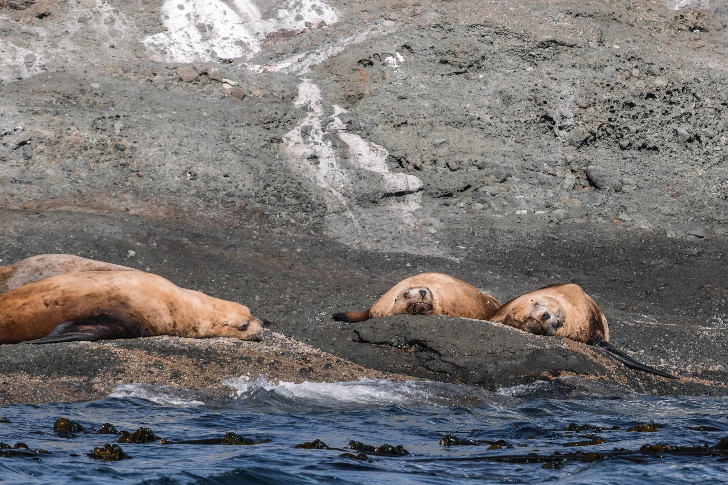 Dozens of Steller Sea Lions lounged on the shoreline, their massive bodies draped across sun-warmed rocks. The largest of all eared seals, male Steller's can weigh up to 2,500 pounds and grow to over 3 meters long. Despite their size, they’re surprisingly agile, clambering up steep ledges and diving effortlessly below the surface.