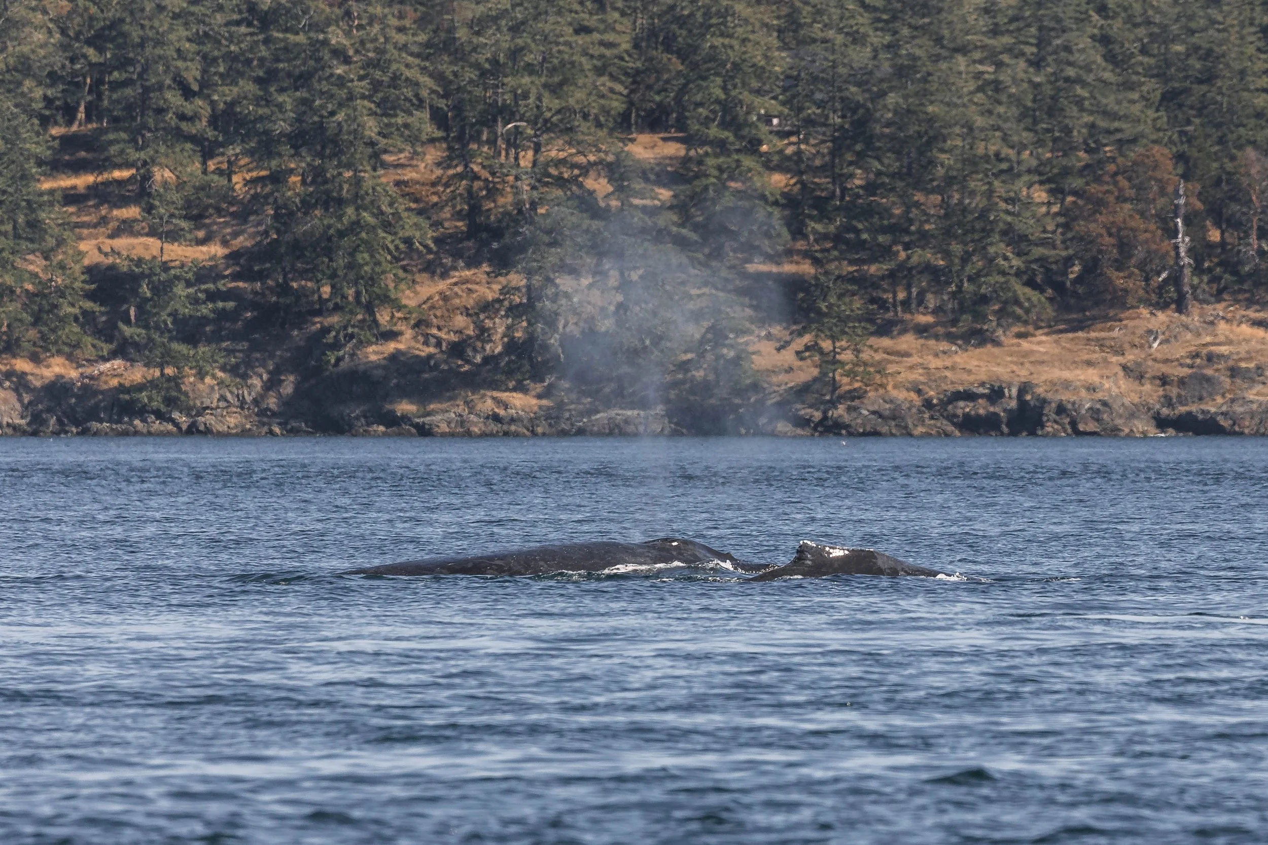 With hearts full from the unexpected encounter, we turned our attention back to the sea. As we approached the southern reaches of our range, faint blows appeared on the horizon. Two humpbacks were surfacing in the distance.