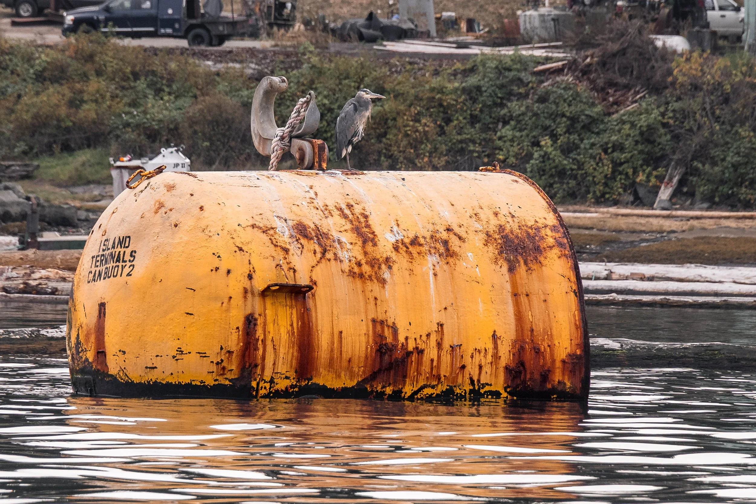 A Great Blue Heron standing on a buoy. Photo by Cheyenne Brewster.