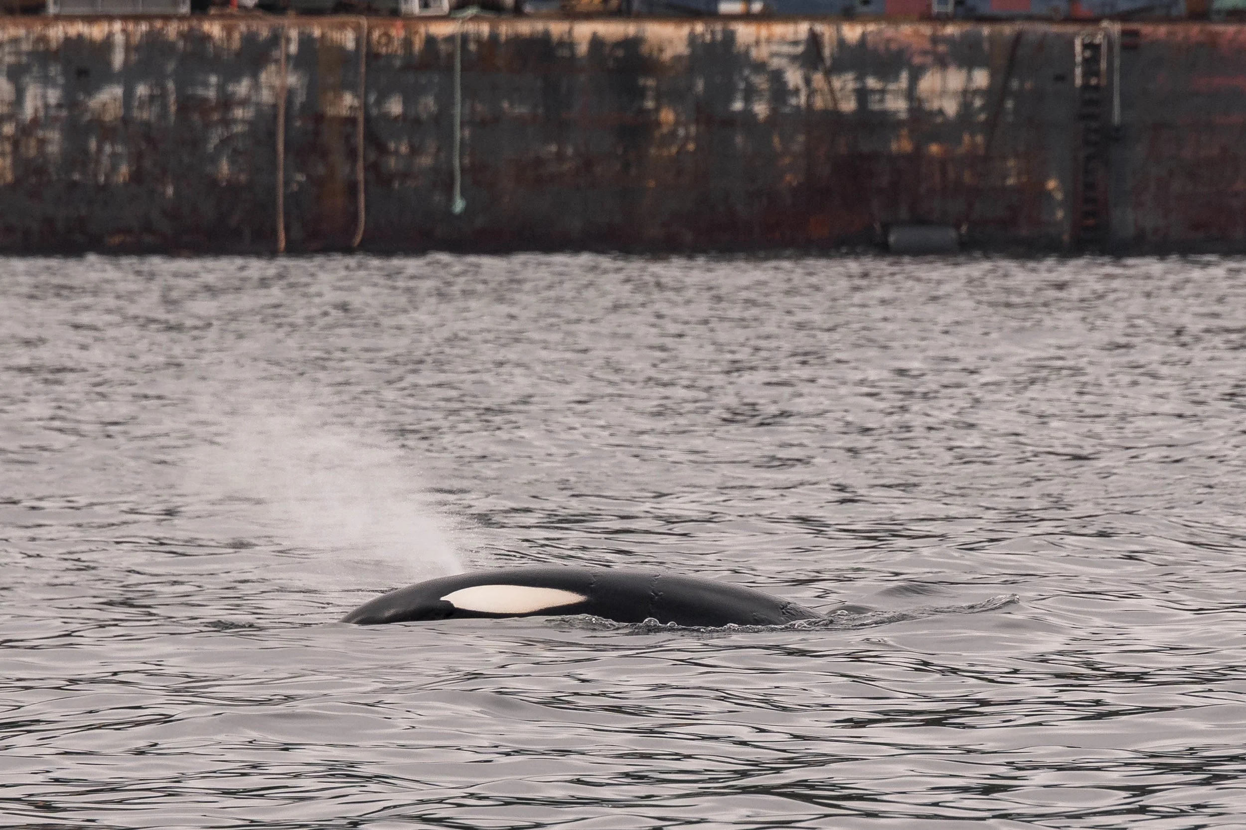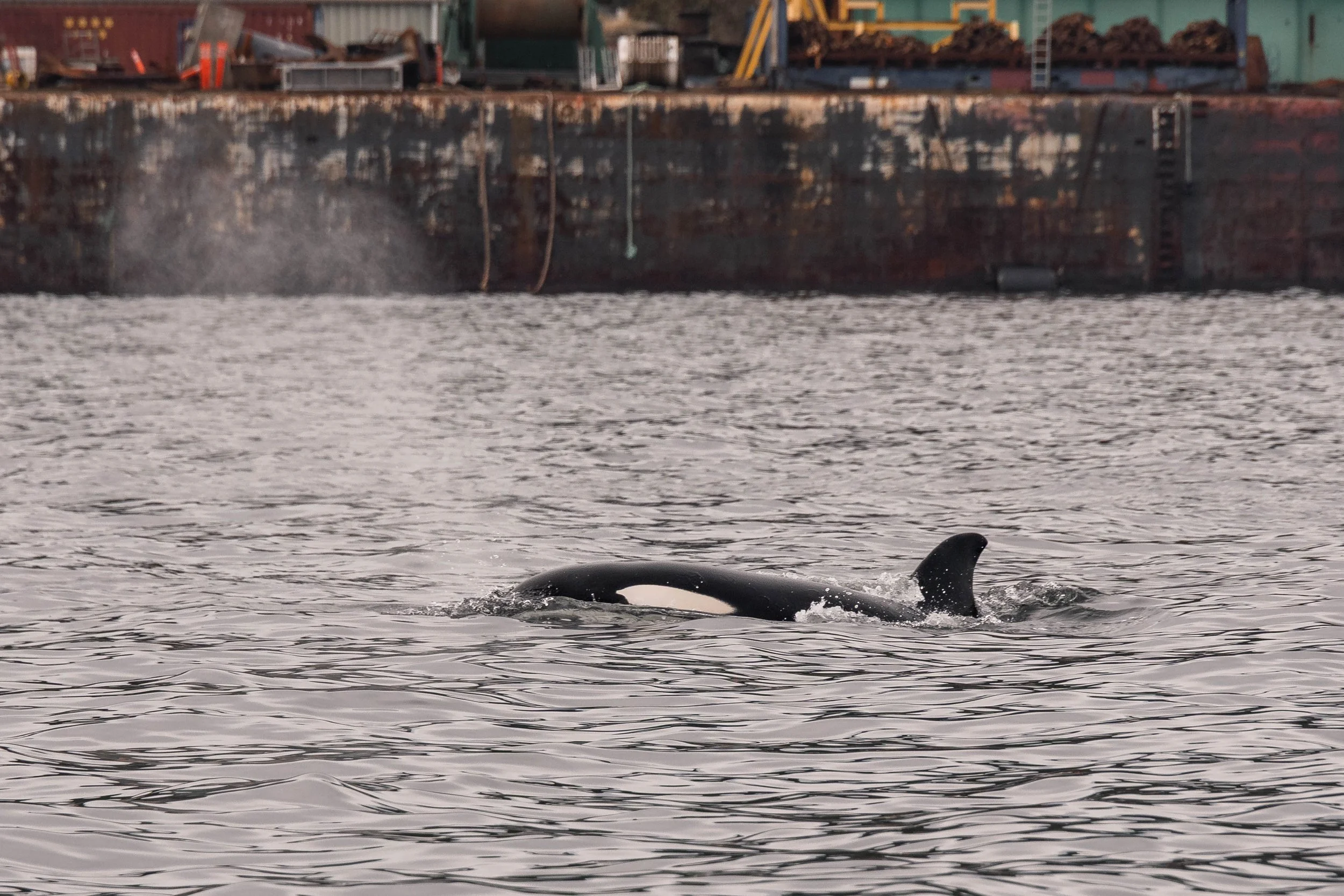 Eagle and her children were busy peeking around the log booms, looking for lunch. After a few minutes of searching, they continued north again. Suddenly, Piglet, the large male of the pod, spyhopped and soon after, they all continued onward northward. They kept travelling and travelling… and then they turned towards Nanaimo Harbour! While whales will usually avoid harbours, occasionally they will peek in for a quick visit. The T090s made their way deep into the harbour, quickly having a look at the docks. They didn’t stick around for long, though, and soon they turned back around, leaving the same way they entered.