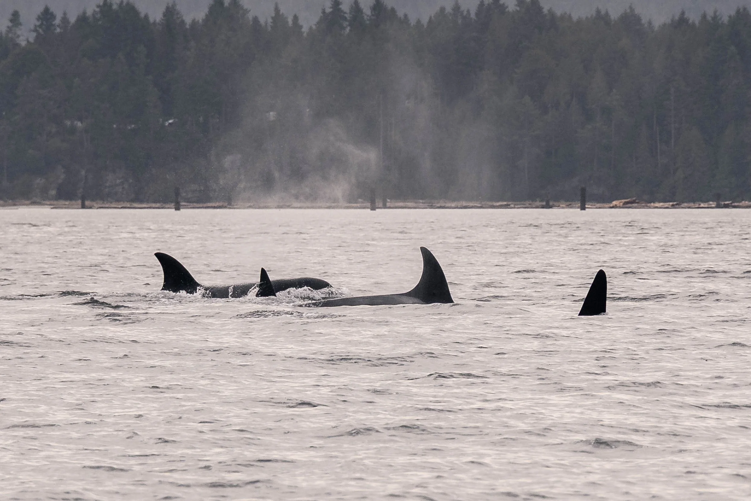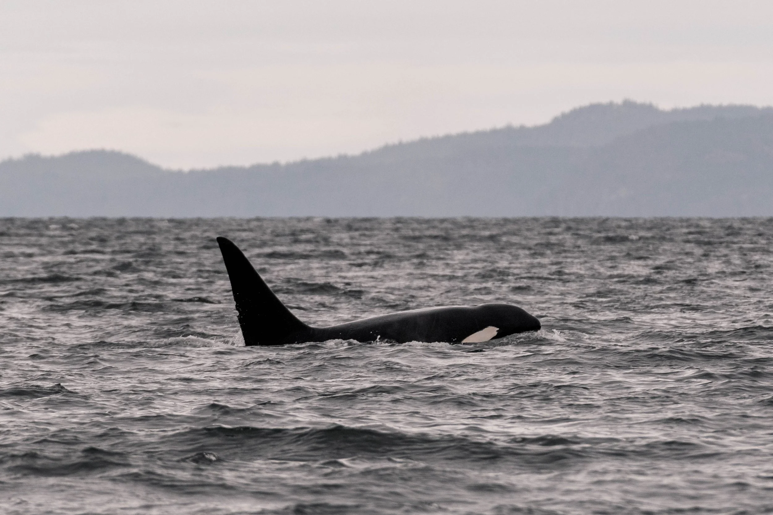 The fun wasn’t over, though, as we caught word of even more orca in Northumberland Channel! Kula and Keta headed on over, scanning and scanning again. Shortly after beginning to search, Keta saw a little dorsal quickly zooming by. We watched, eager to see who was present. The onboard Naturalist began snapping away, and after comparing photos, this little one was identified as T090D Kanga. Kanga made her way north, and the rest of her pod was spotted shortly after: