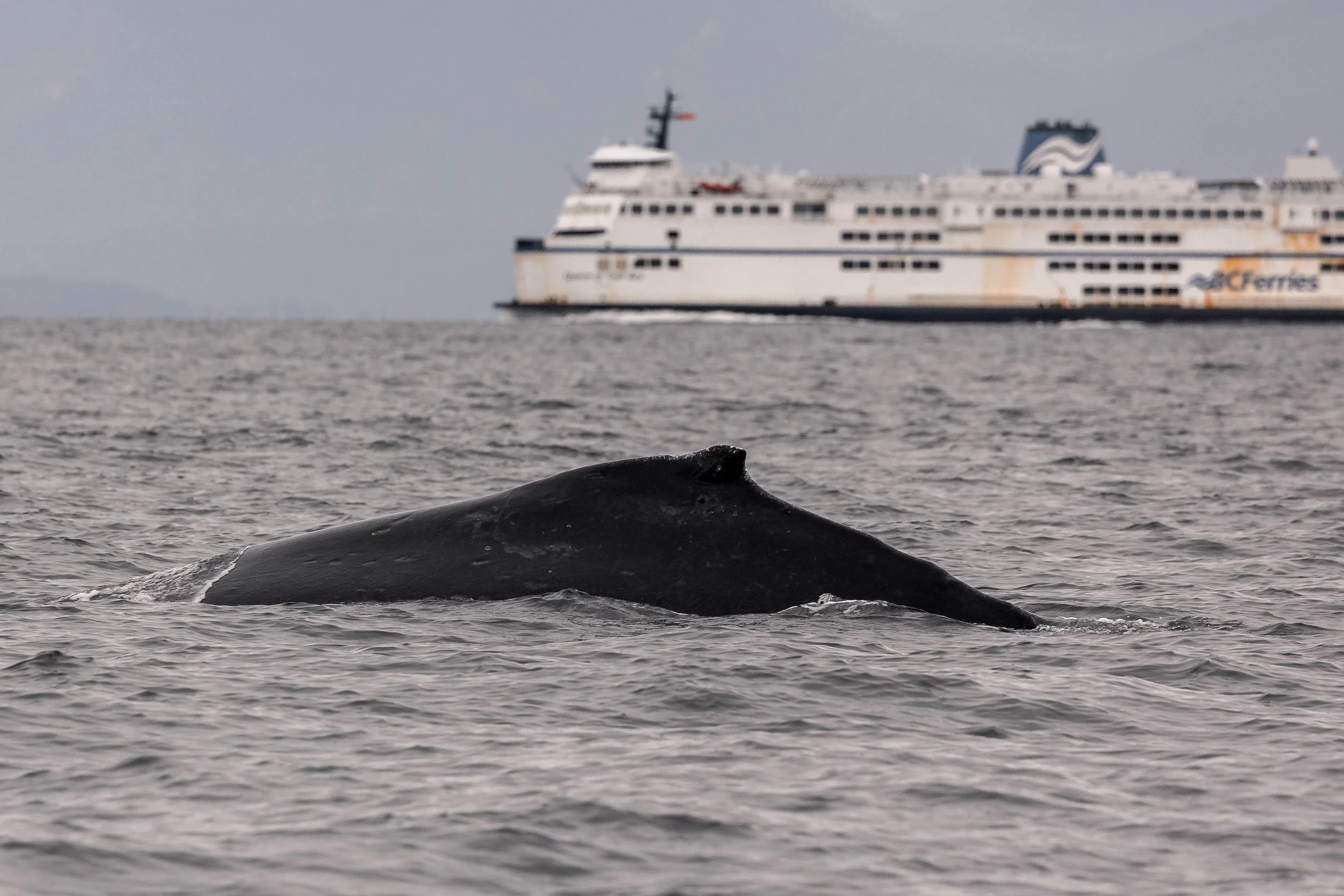 While Keta was with Twinning and Smudge, Cascadia found another pair of humpbacks a bit closer to Vancouver. These two were Spotlight (BCX1480) and Geometry (BCZ0338). Spotlight, a known female humpback, is a relatively uncommon whale for our area, as she usually spends her summers further north, around areas such as Campbell River. Geometry is a known male humpback, with regular sightings in our waters. While Spotlight’s gender was confirmed from sightings with calves, Geometry’s gender was confirmed by getting a photo of the one area on the body that shows sexual dimorphism in this species. The hemispherical lobe, a grapefruit-sized bump located on the peduncle, is found only on female humpbacks. Scientists are still stumped as to what this lobe does, but if a whale happens to be tail lobbing on the surface, sometimes you are able to get a photo of this area, and are able to confirm their gender (albeit a bit unconventionally compared to orca)!