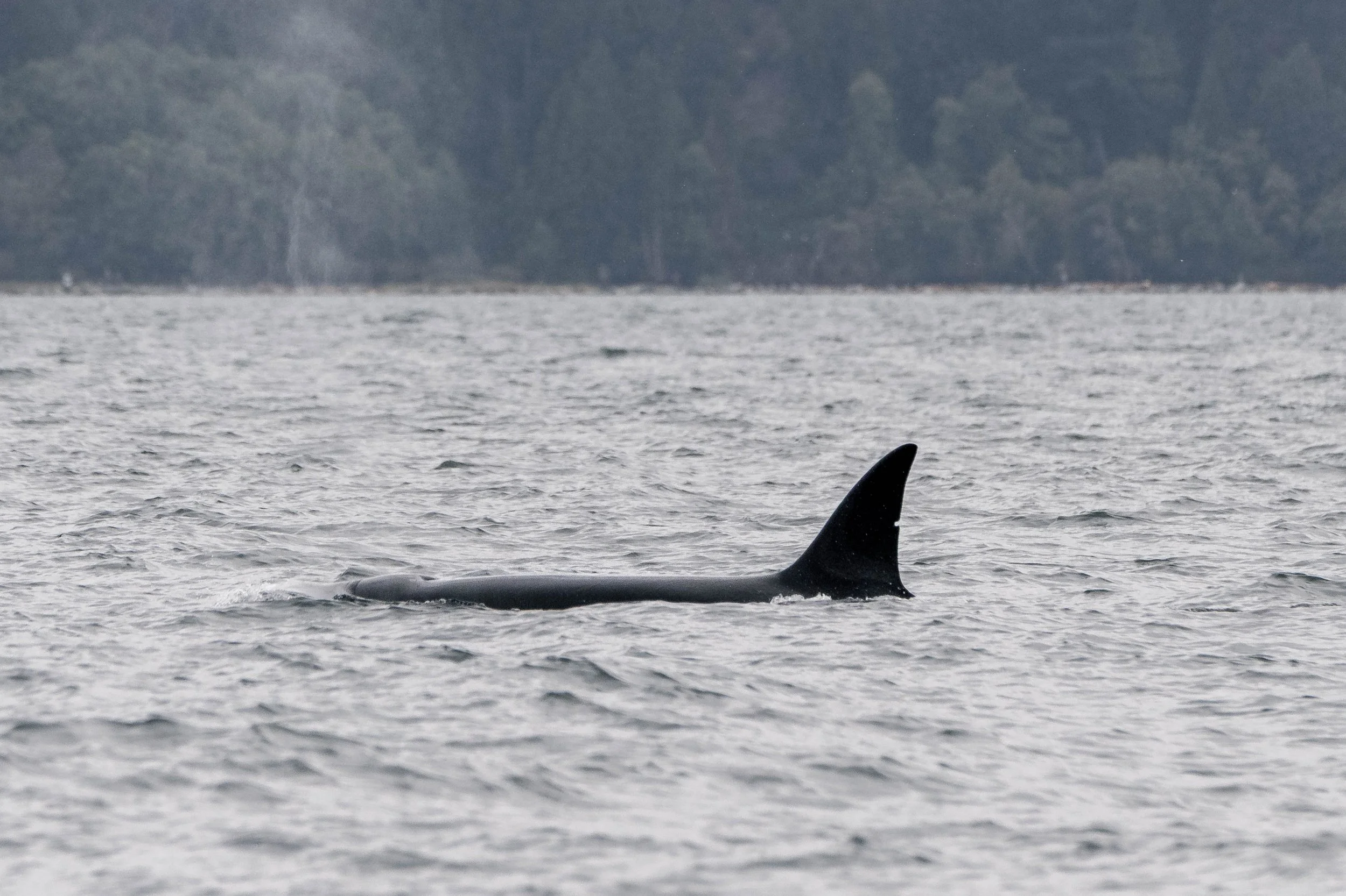 We crossed and started searching the shores. Before long, we found what we were looking for: eight orca travelling spread out across the bank. Photos confirmed some familiar fins were present - it was the T036s, travelling alongside with the T060 brothers, T060D Onca and T060E Lynx: