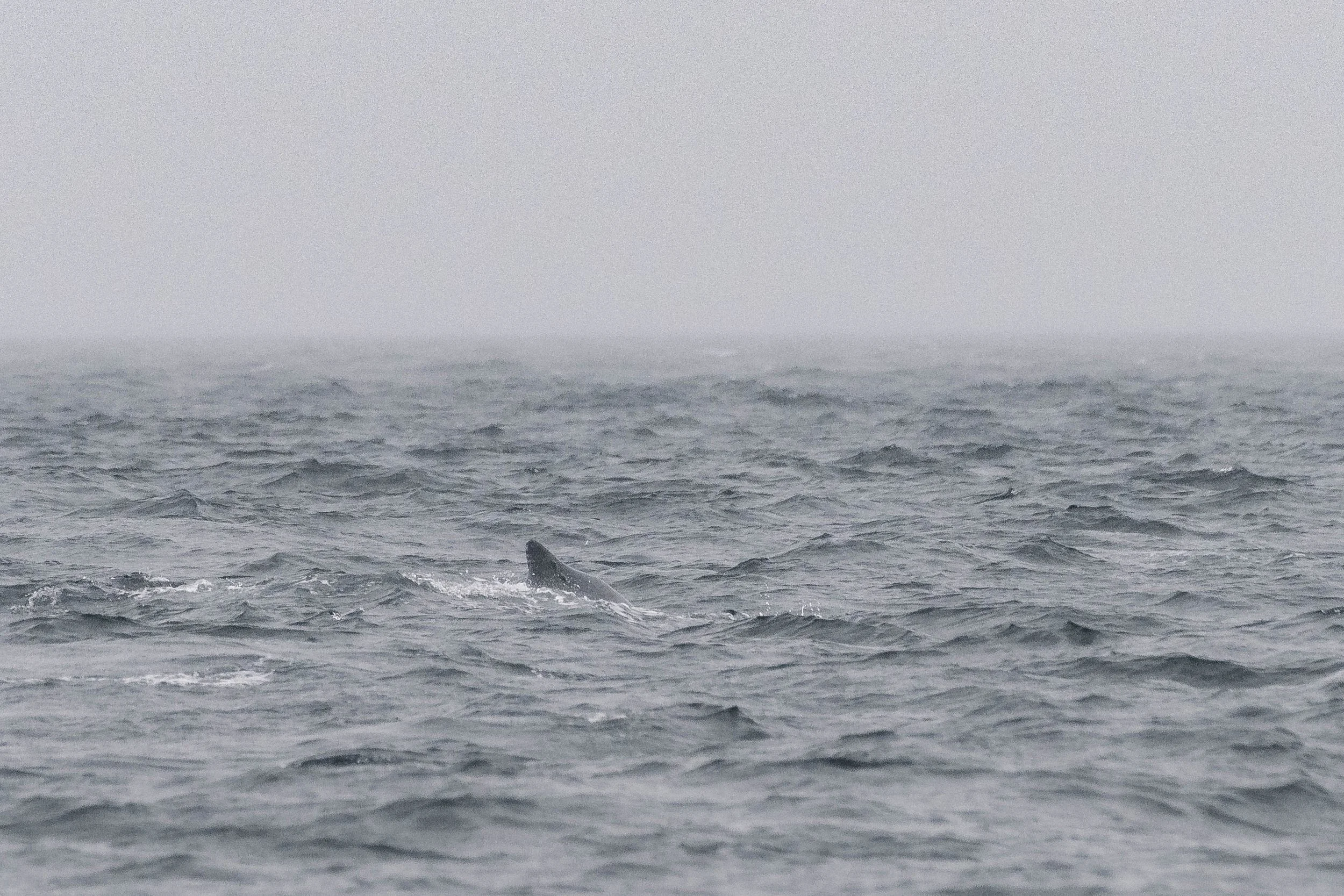 The tip of Ghost’s dorsal fin as she travels into the fog. Photo by Val Watson.