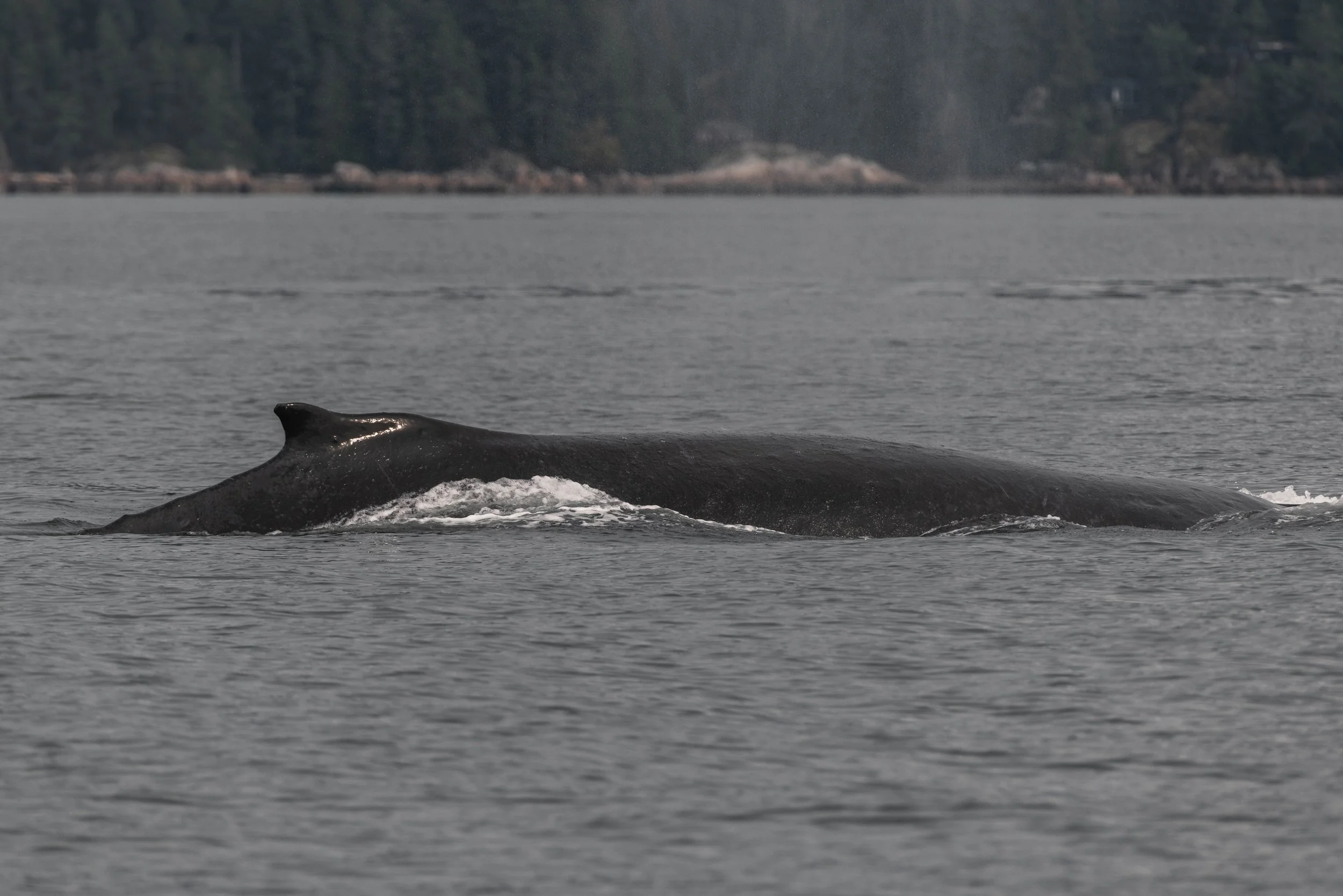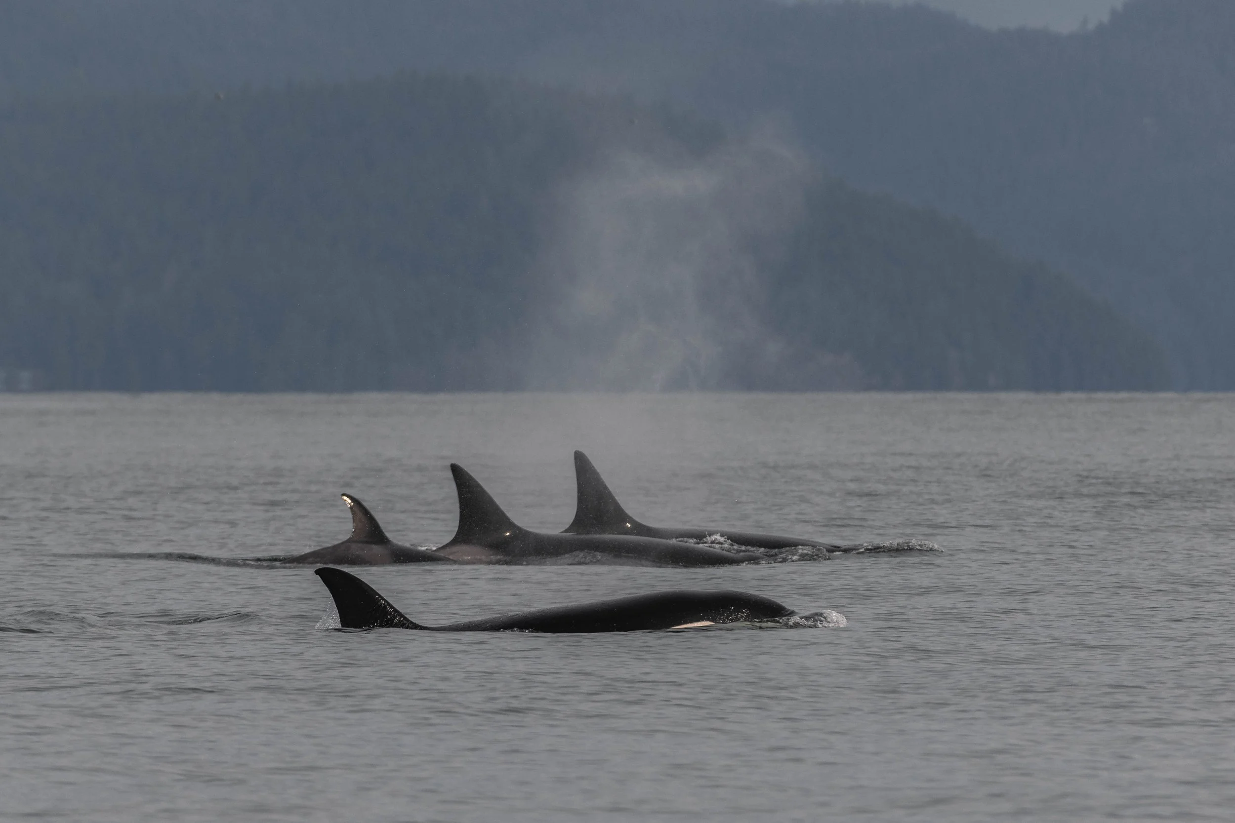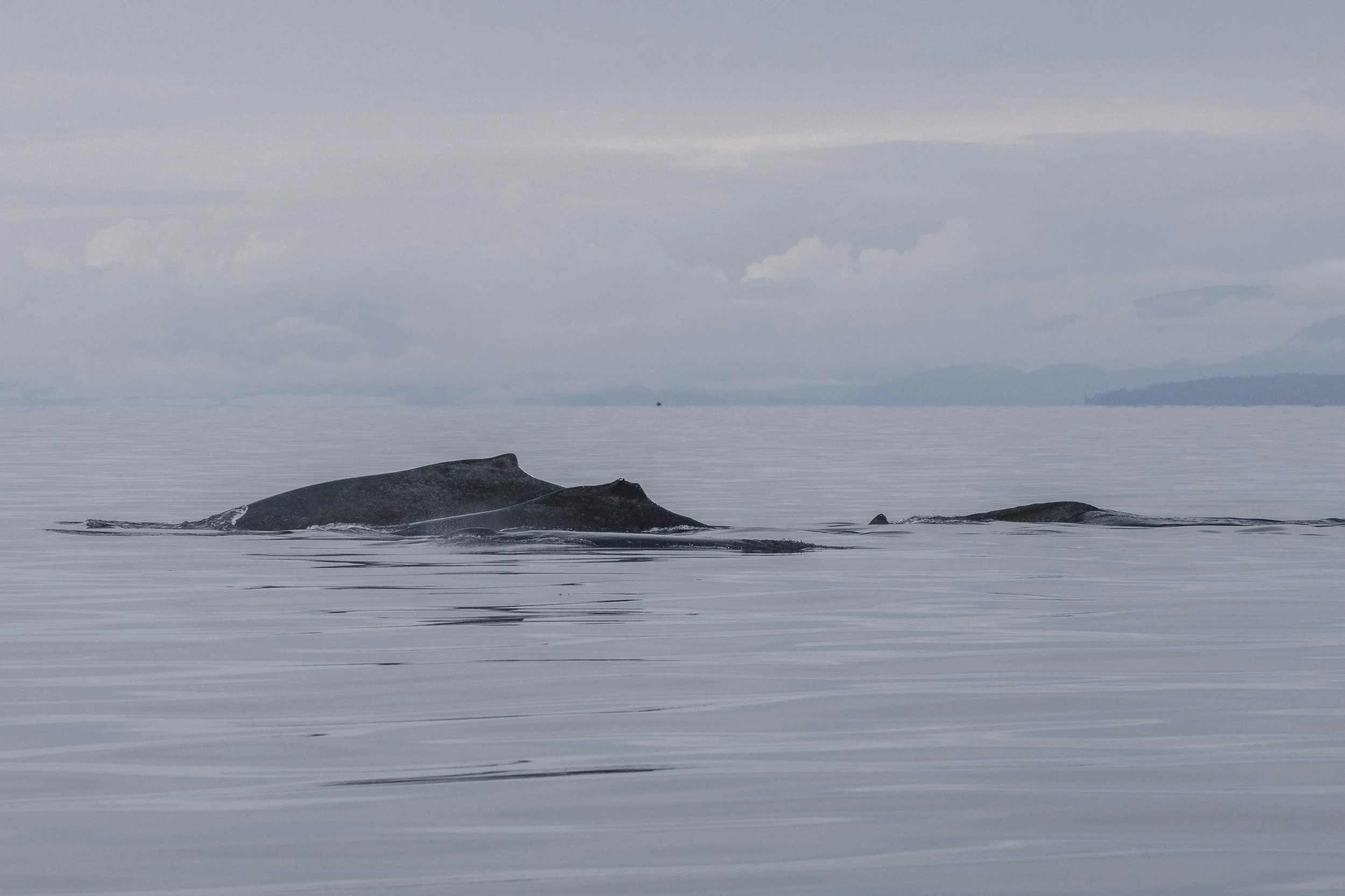 Reports had come in of orca near Howe Sound, across the Strait of Georgia, so our captains decided to change course and make the crossing. As we cruised toward the mainland, the view of Vancouver’s skyline grew taller and sharper against the horizon. Then, mid-channel, something caught our eye, a few big, bushy blows rising from the calm sea ahead. Humpbacks!