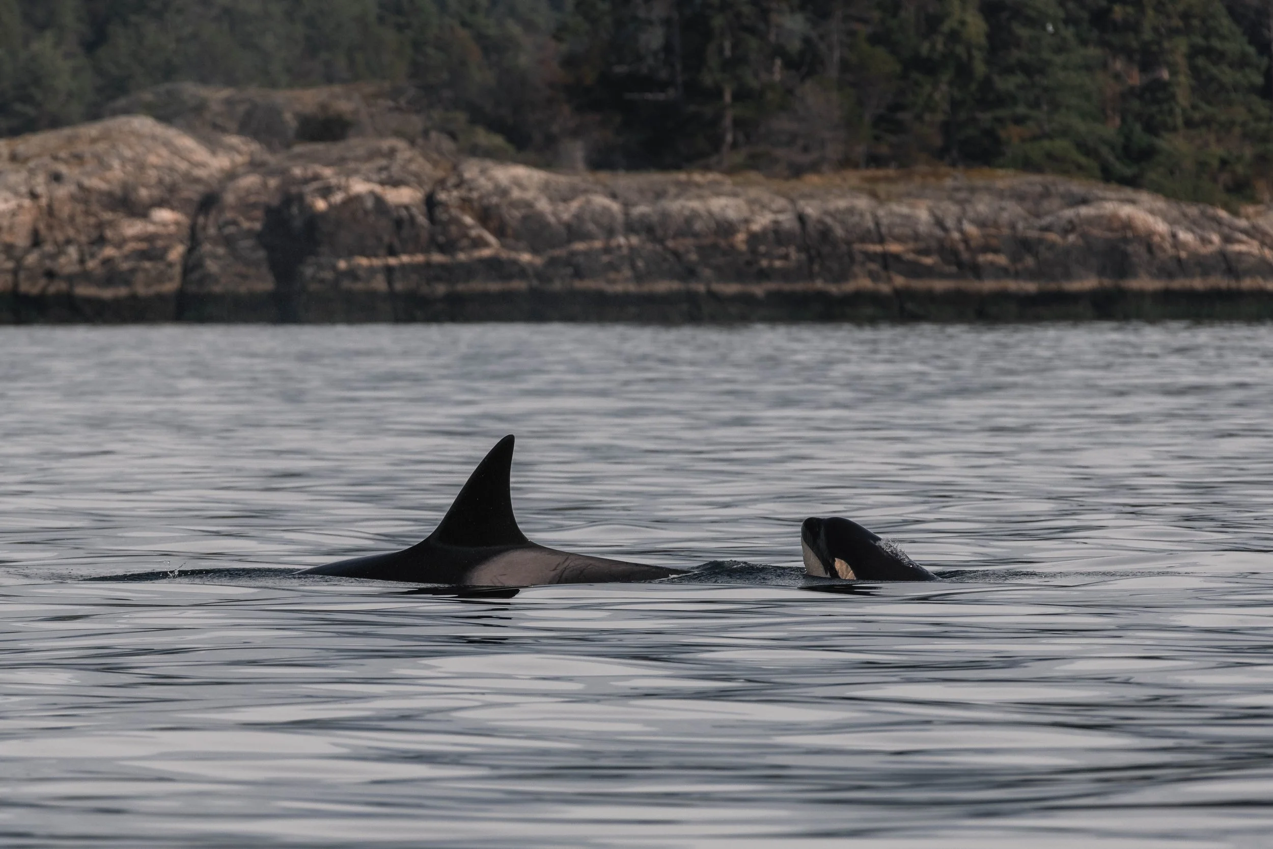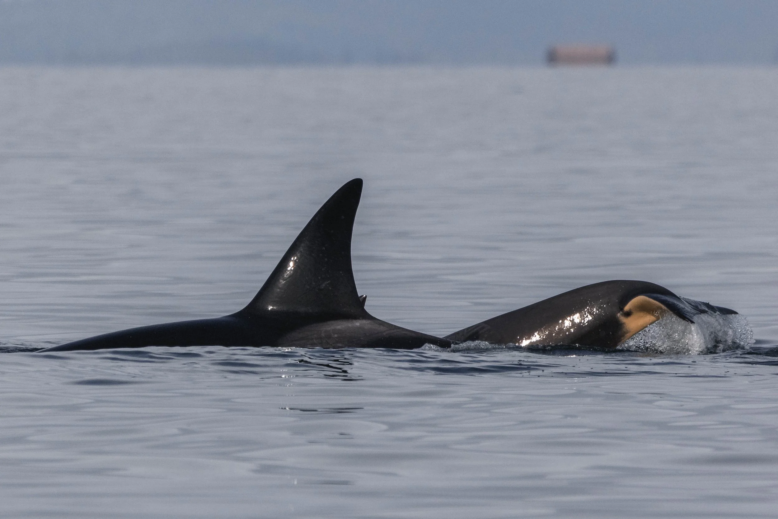 Orion’s dorsal fin with Kata surfacing beside. Photo by Aly Kohlman.