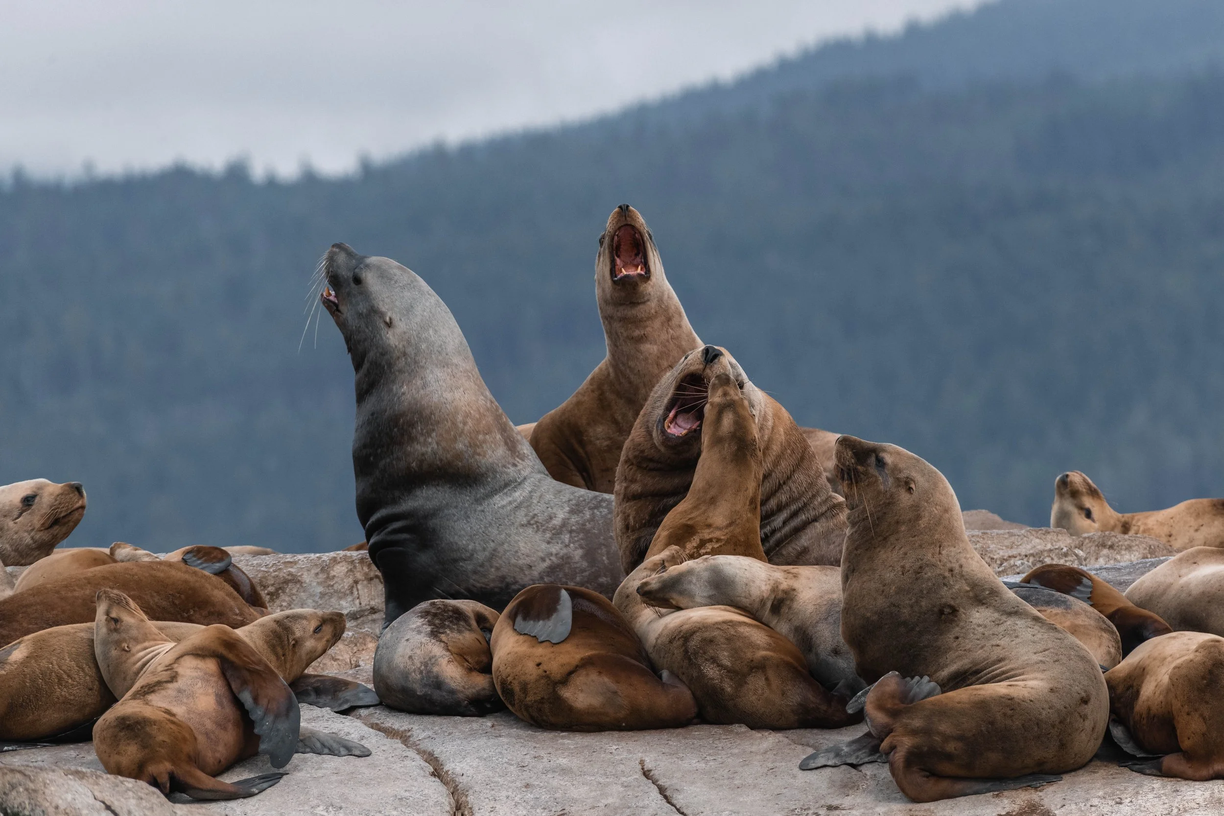 Steller Sea Lions growling from the White Islets. Photo by Aly Kohlman.