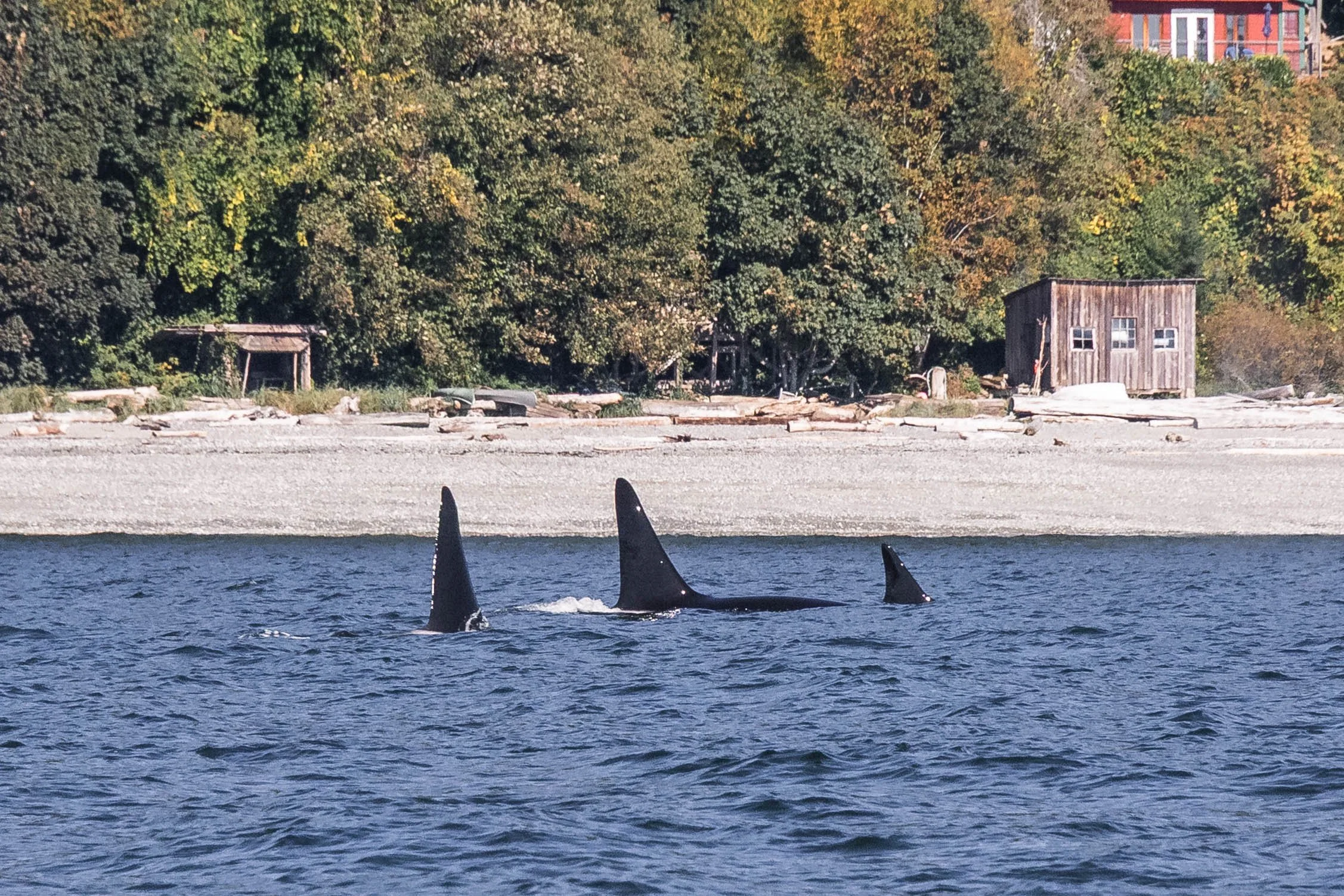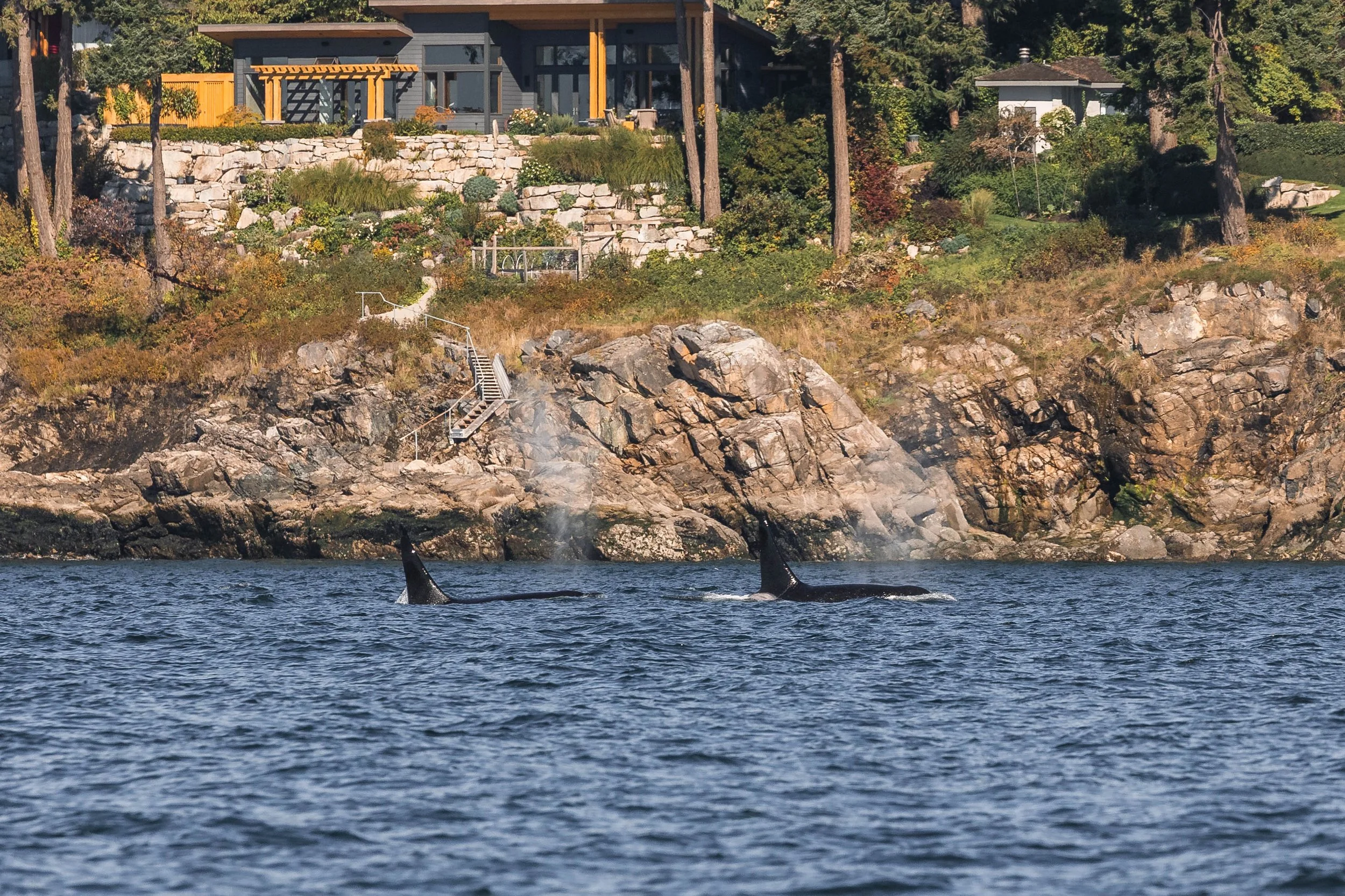This family group consists of Reef (the matriarch) and her two sons, Rush and Lagoon. They’re fairly easy to recognize: all three have perfectly smooth dorsal fins with no notches, which is quite rare amongst our Transient (Bigg’s) orca. Reef’s fin is unusually tall and straight for a female, and her two sons tower beside her as they travel. Today, they were moving steadily along the coast – the epitome of typical Transient (Bigg’s) behaviour. Orca can cover incredible distances in a single day, and much of their time is spent simply on the move, patrolling their range in search of prey.