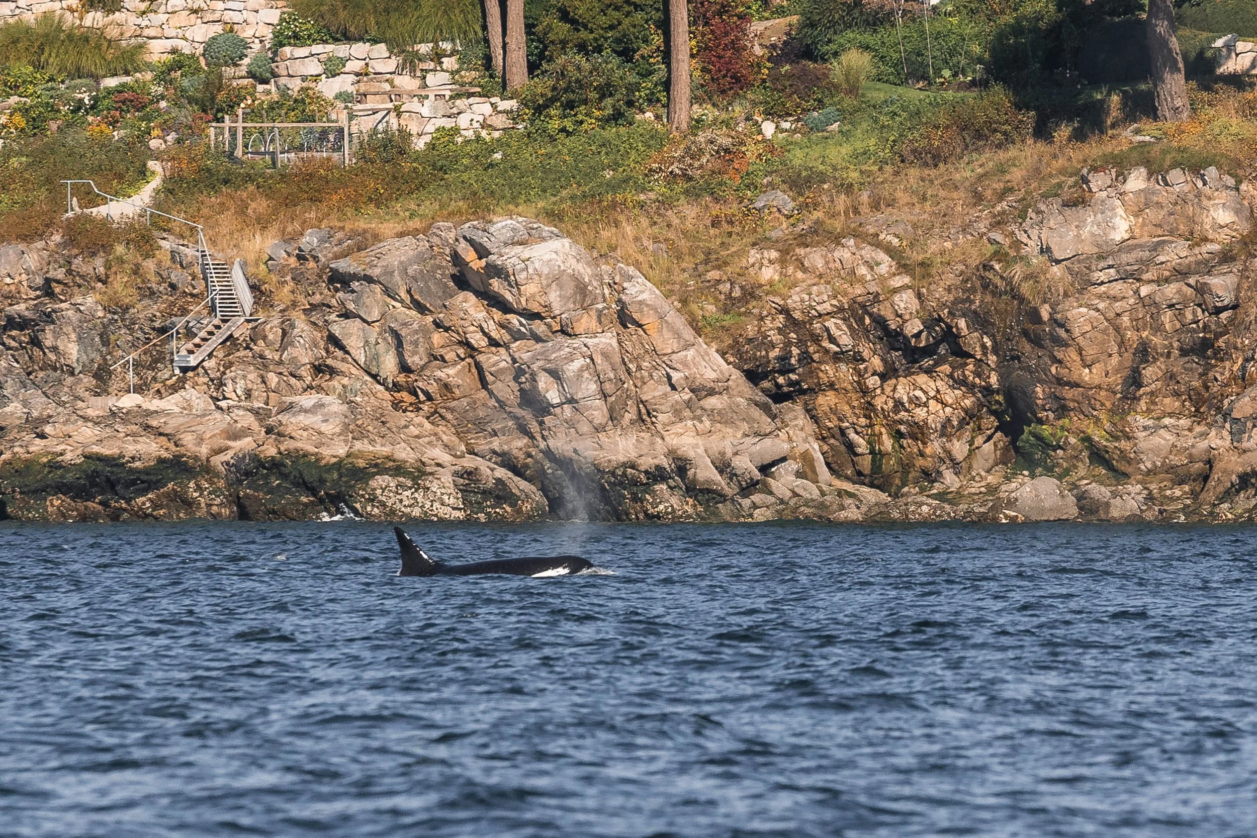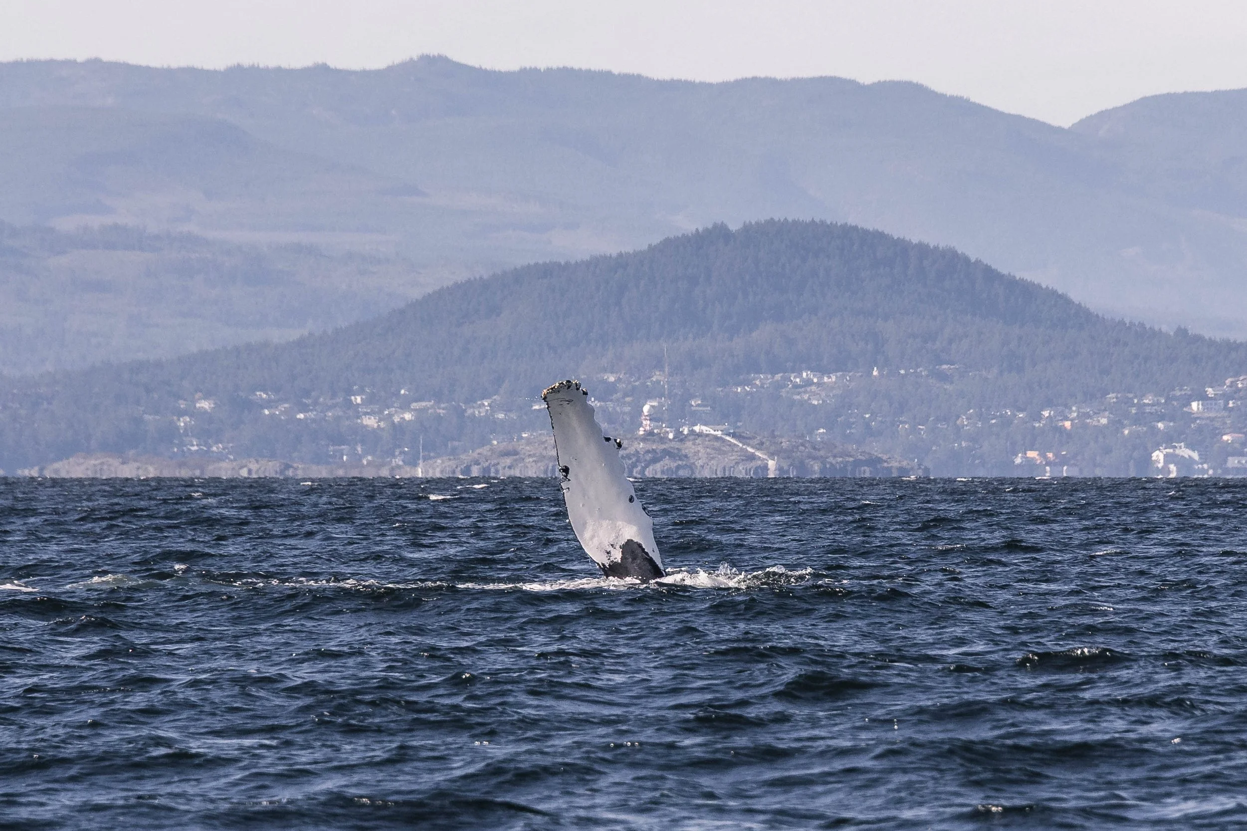 Mammoth/Ocean’s dorsal fin, with Vancouver visible behind her. Photo by Jordan Robinson.